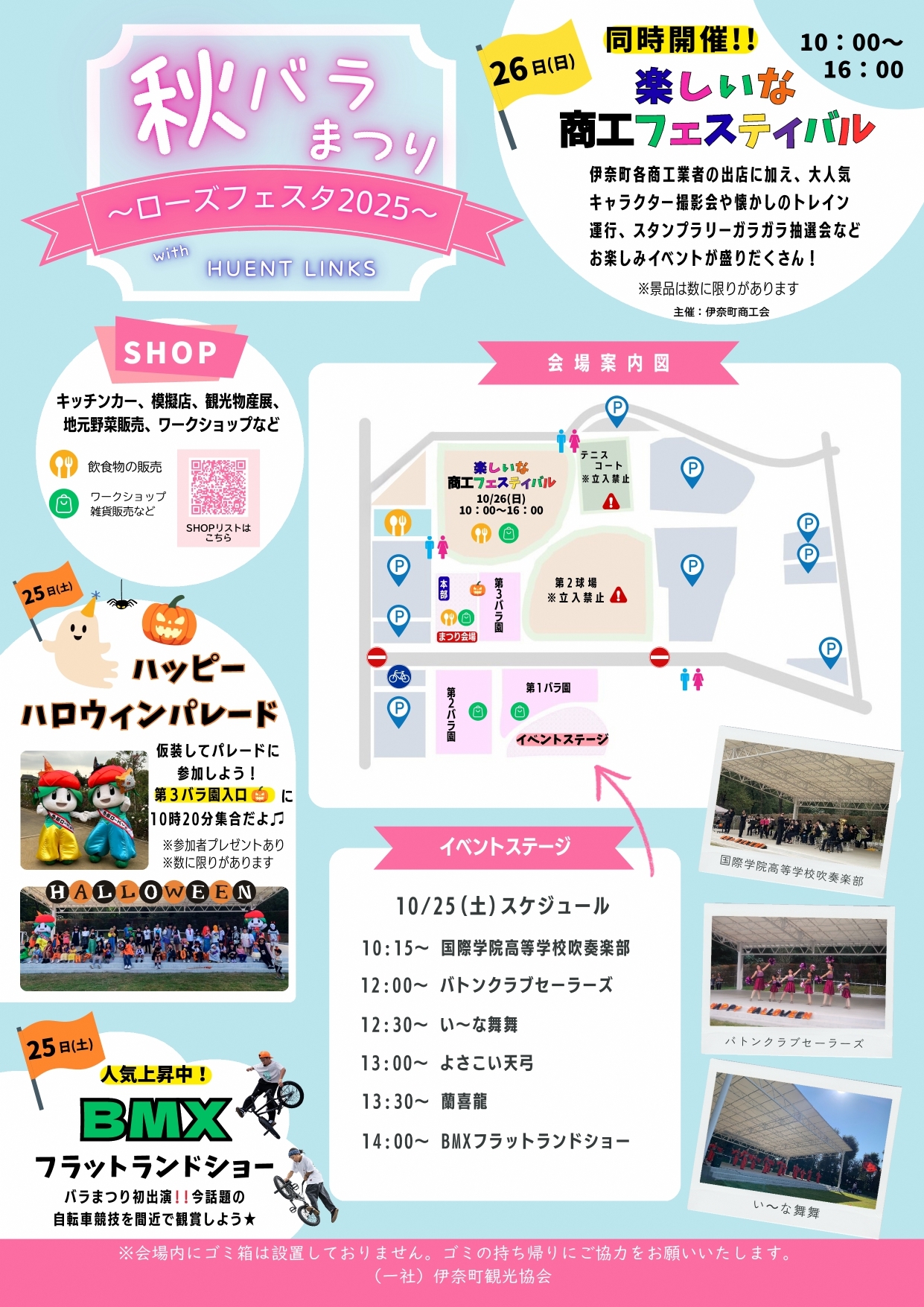 今、人気上昇中のBMXフラットランドショーが間近で観賞できるイベントや、ハッピーハロウィンパレードなど今年も楽しいイベントの秋バラまつりとなっています。