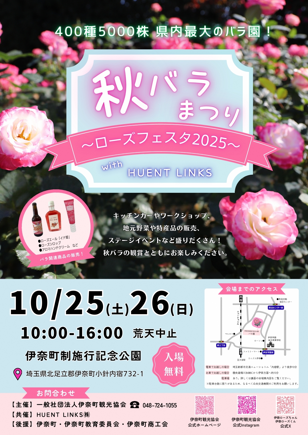 一般社団法人伊奈町観光協会では、400種5,000株のバラが咲き誇る県内最大のバラ園で「秋バラまつり〜ローズフェスタ2025〜」をHUENT LINKS株式会社と共催で実施します。