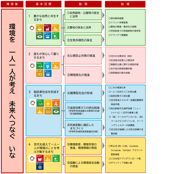 前計画の未達成状況の改善を踏まえ、本町の環境像である「環境を 一人一人が考え 未来へつなぐ いな」を実現するための4つの基本目標と、それに対応した施策と指標を設定します。
