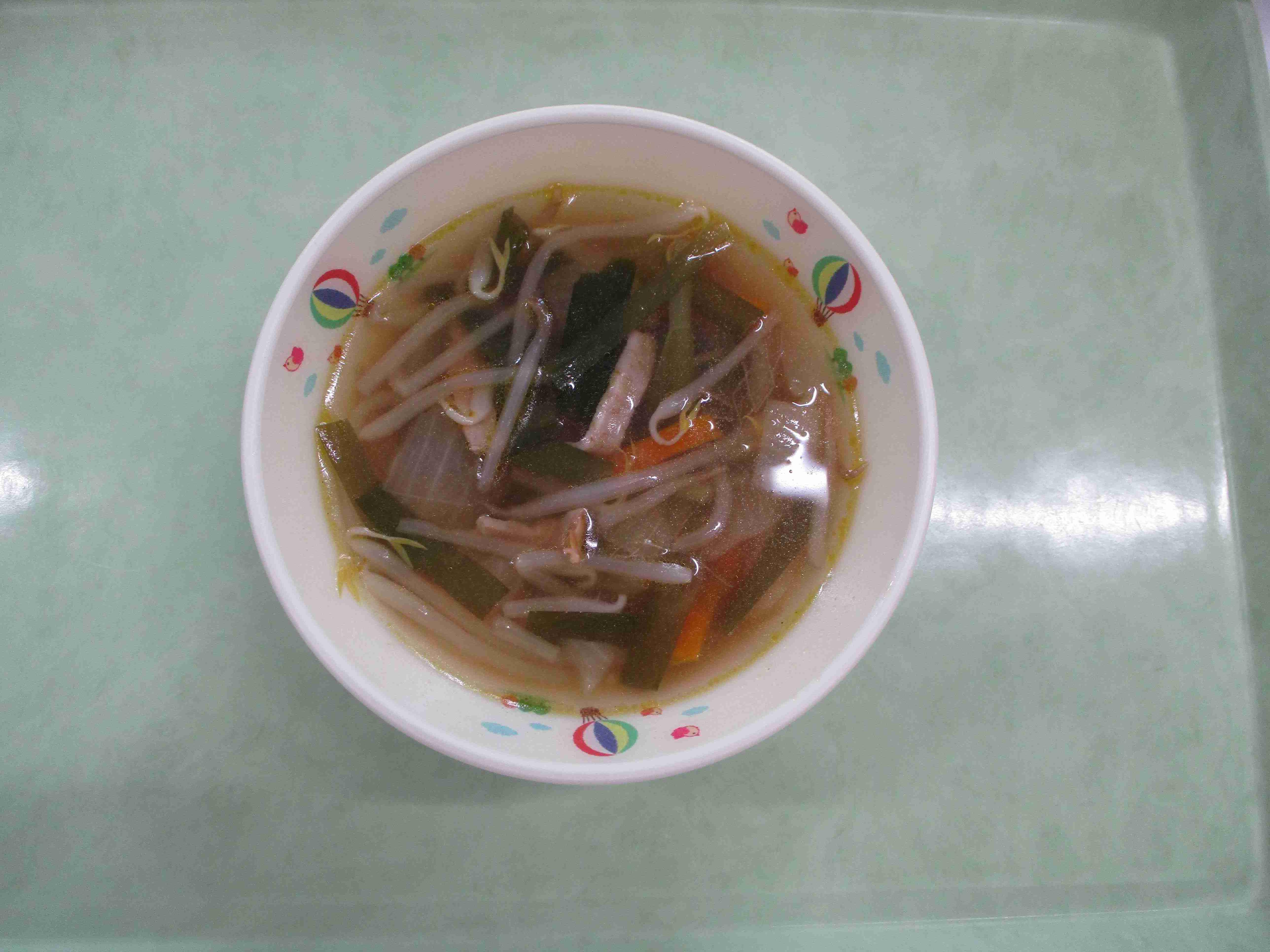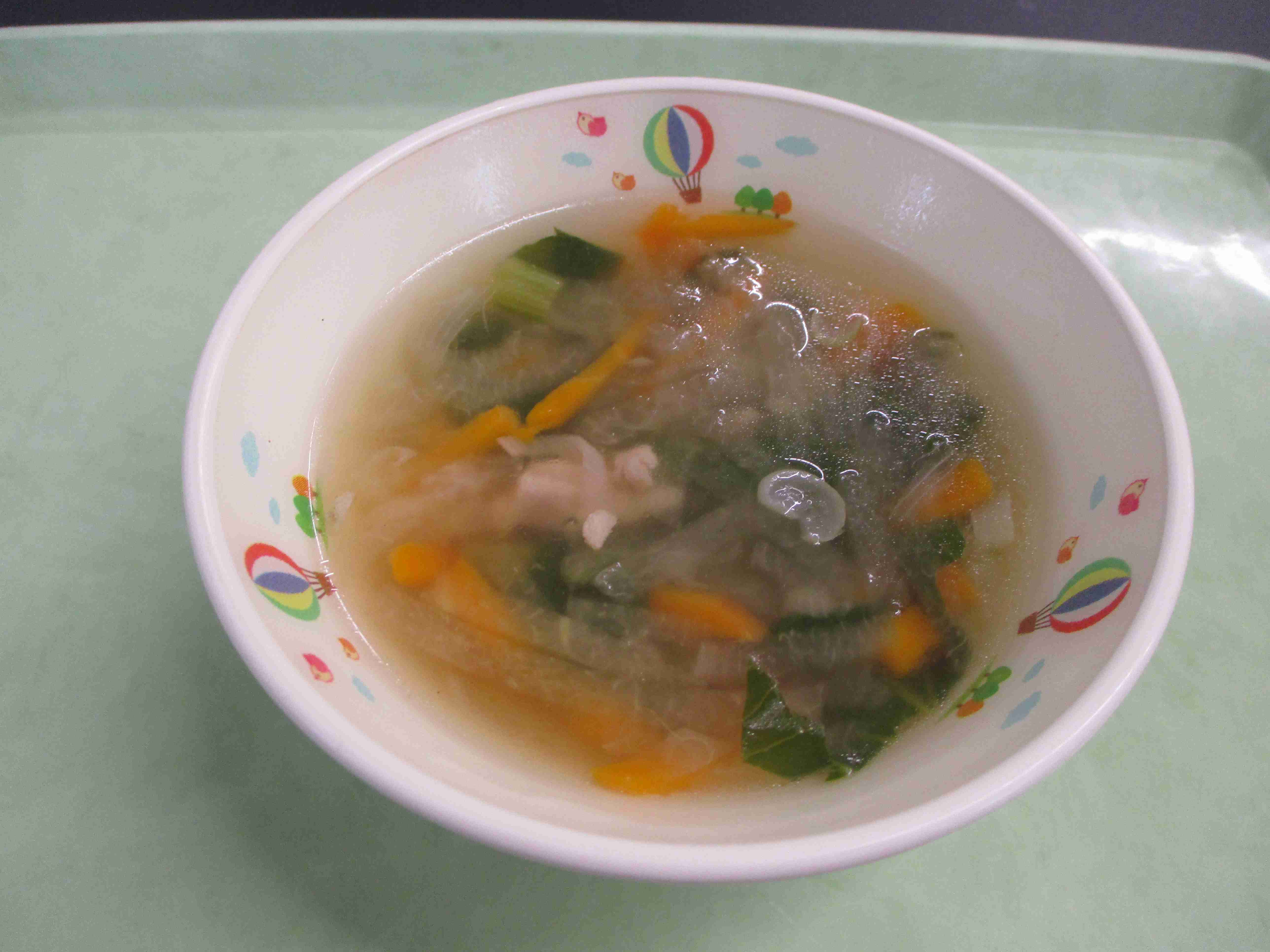 今日は春雨のお話です。春雨には大きく分けて、じゃがいもやさつまいものでんぷんのものと、緑豆のでんぷんから作られるものがあります。春雨の発祥の地は中国で、およそ千年前に作られ始めたといわれています。日本の春雨という名前は、半透明で細く長く伸ばされた様子が、しとしとと降る春の雨の線に似ていることからついたといわれています。中国では粉(フェン)糸(スー)と呼ばれているそうです。今日はサラダにしました。お味はいかがですか?