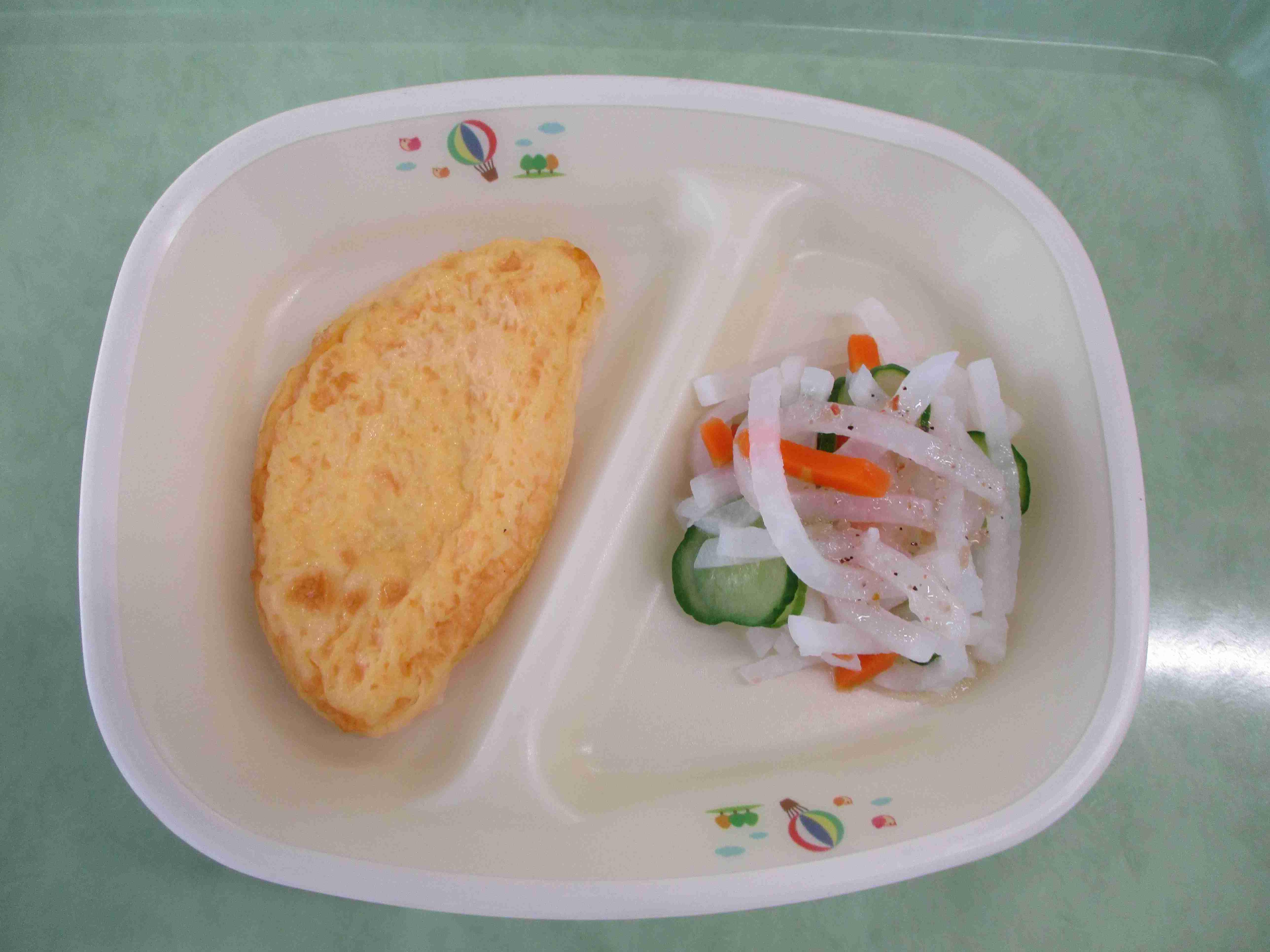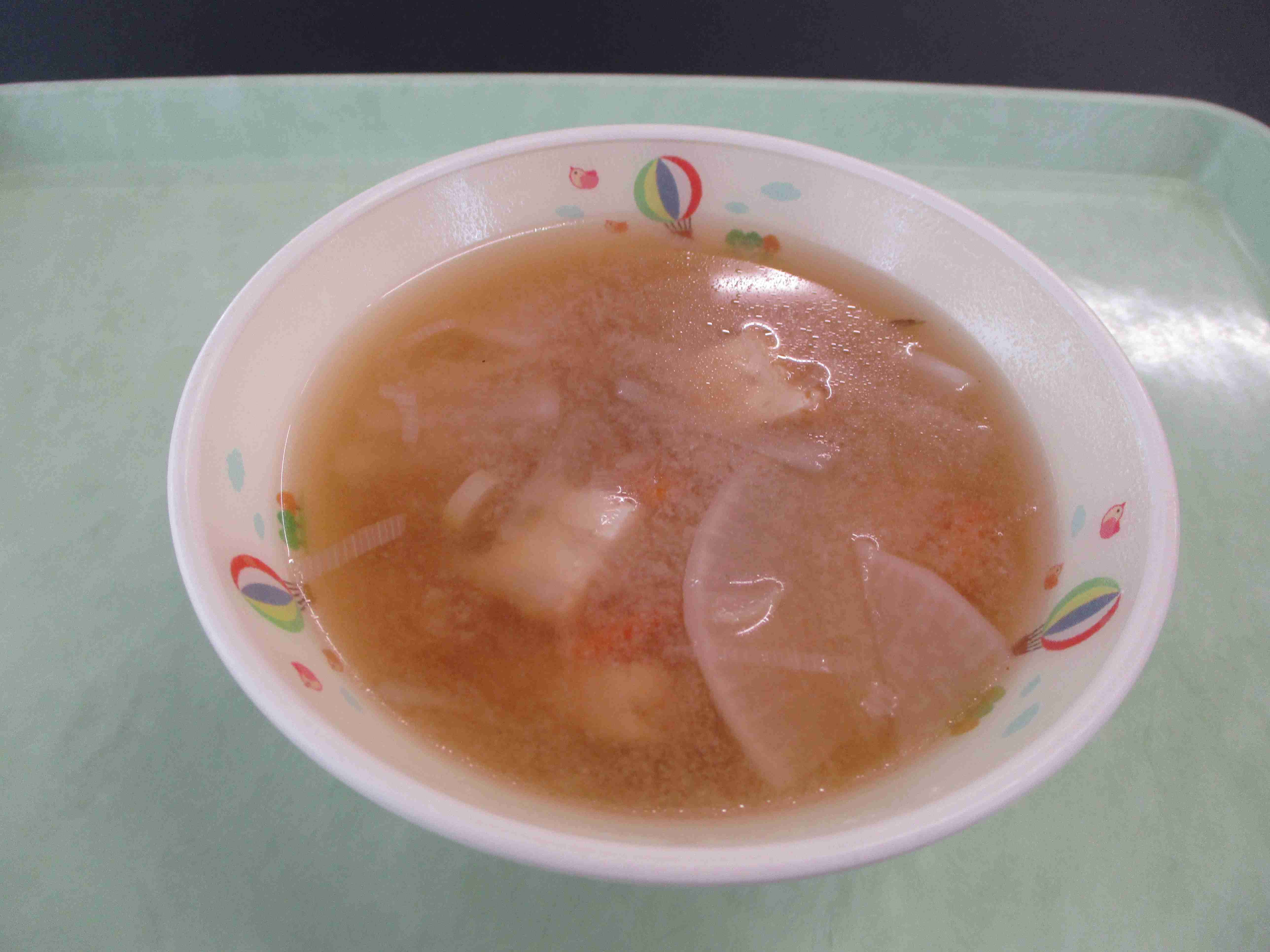 今日は大根のお話です。大根は「古事記」や「日本書紀」にものっていて、日本で昔から食べられている野菜のひとつです。昔は「おおね(大根)」と呼ばれていたそうです。大根には、でんぷんを分解してくれるジアスターゼがたっぷりです。胃もたれや胸やけがするときには、大根おろしを食べるといいですよ。また、白い大根にはビタミンCも豊富です。今日は、サラダにしました。残さず食べましょう。