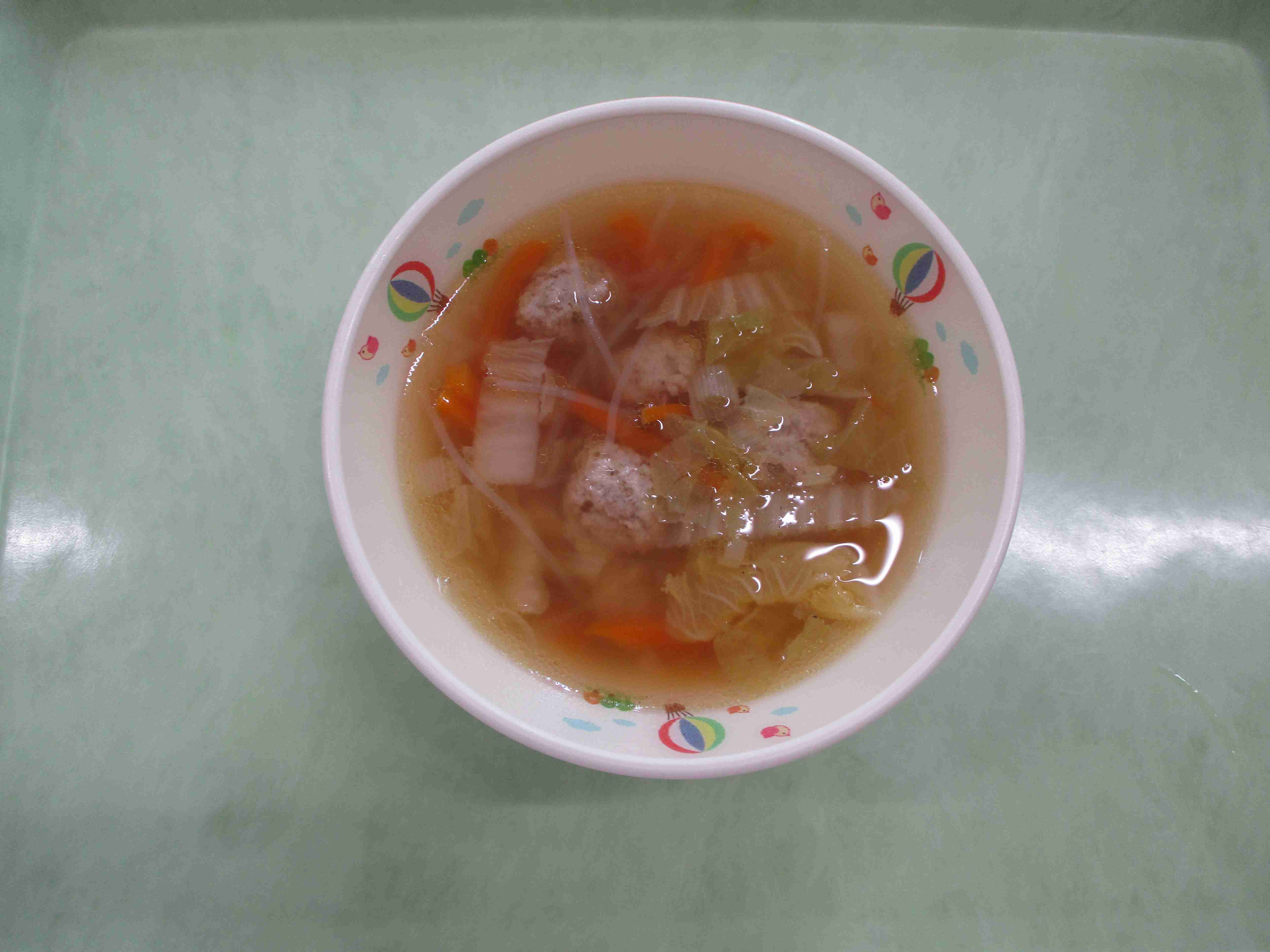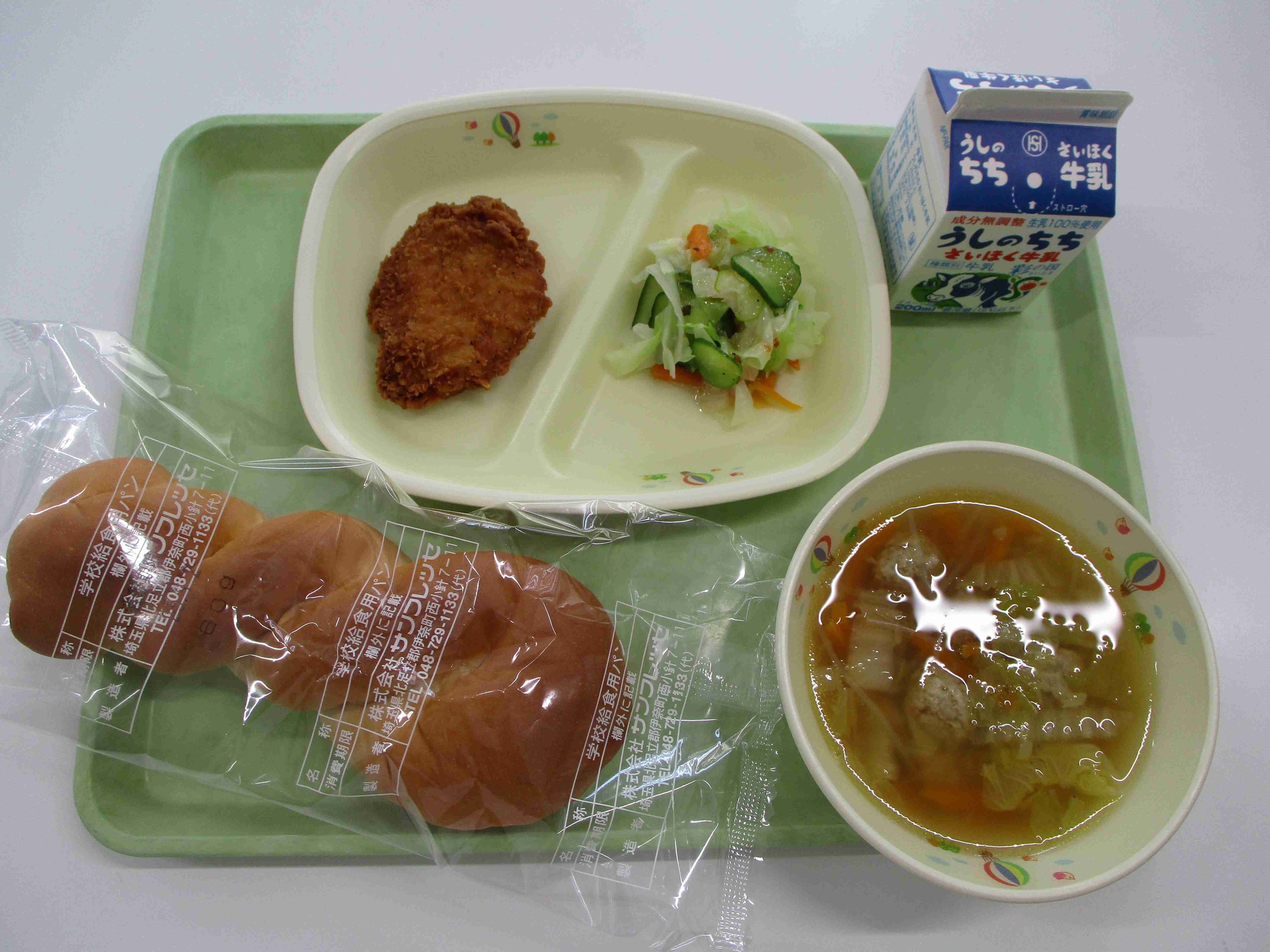 ツイストパン、牛乳、クリスピーチキン、キャベツのサラダ、肉団子スープ
