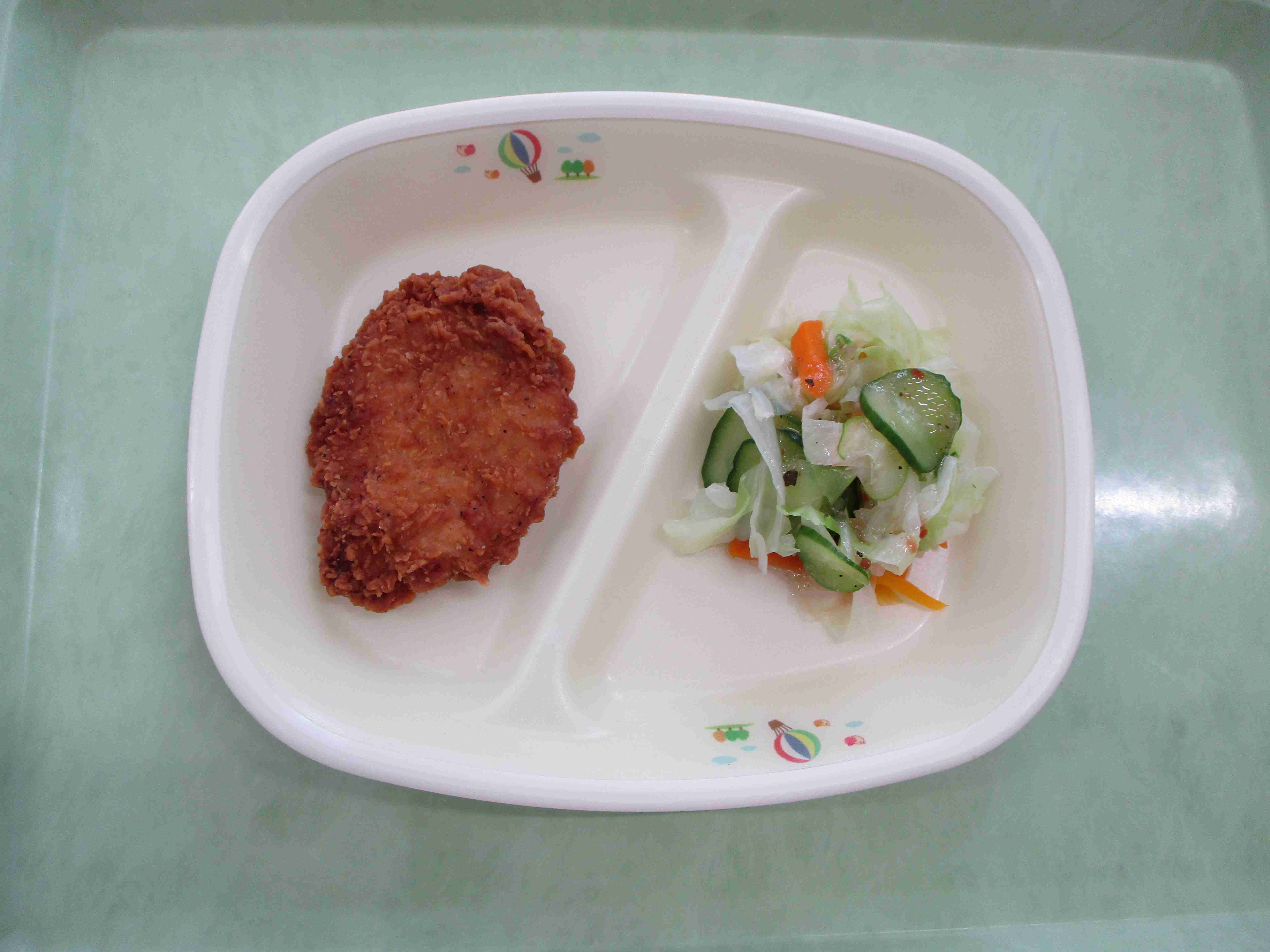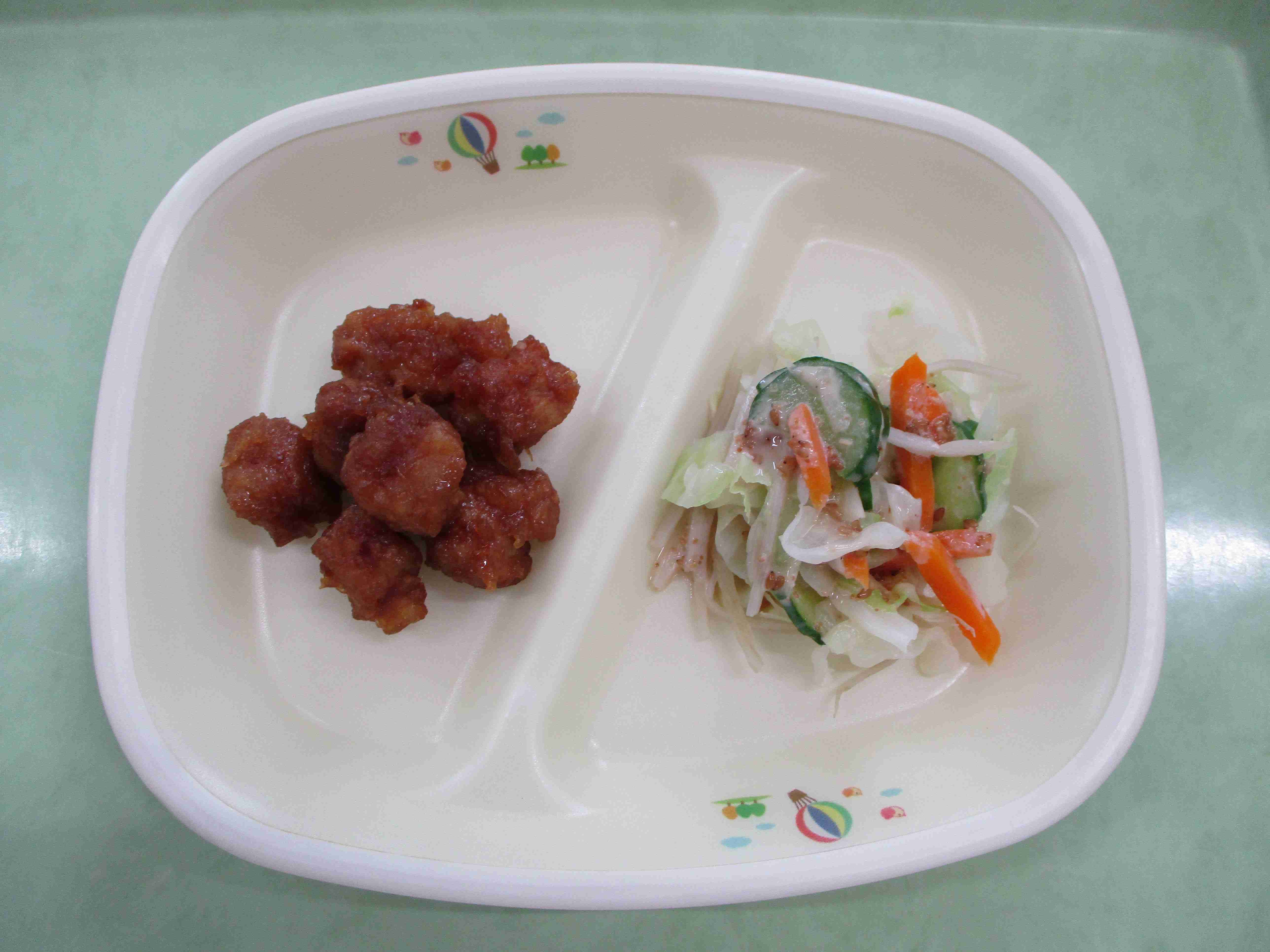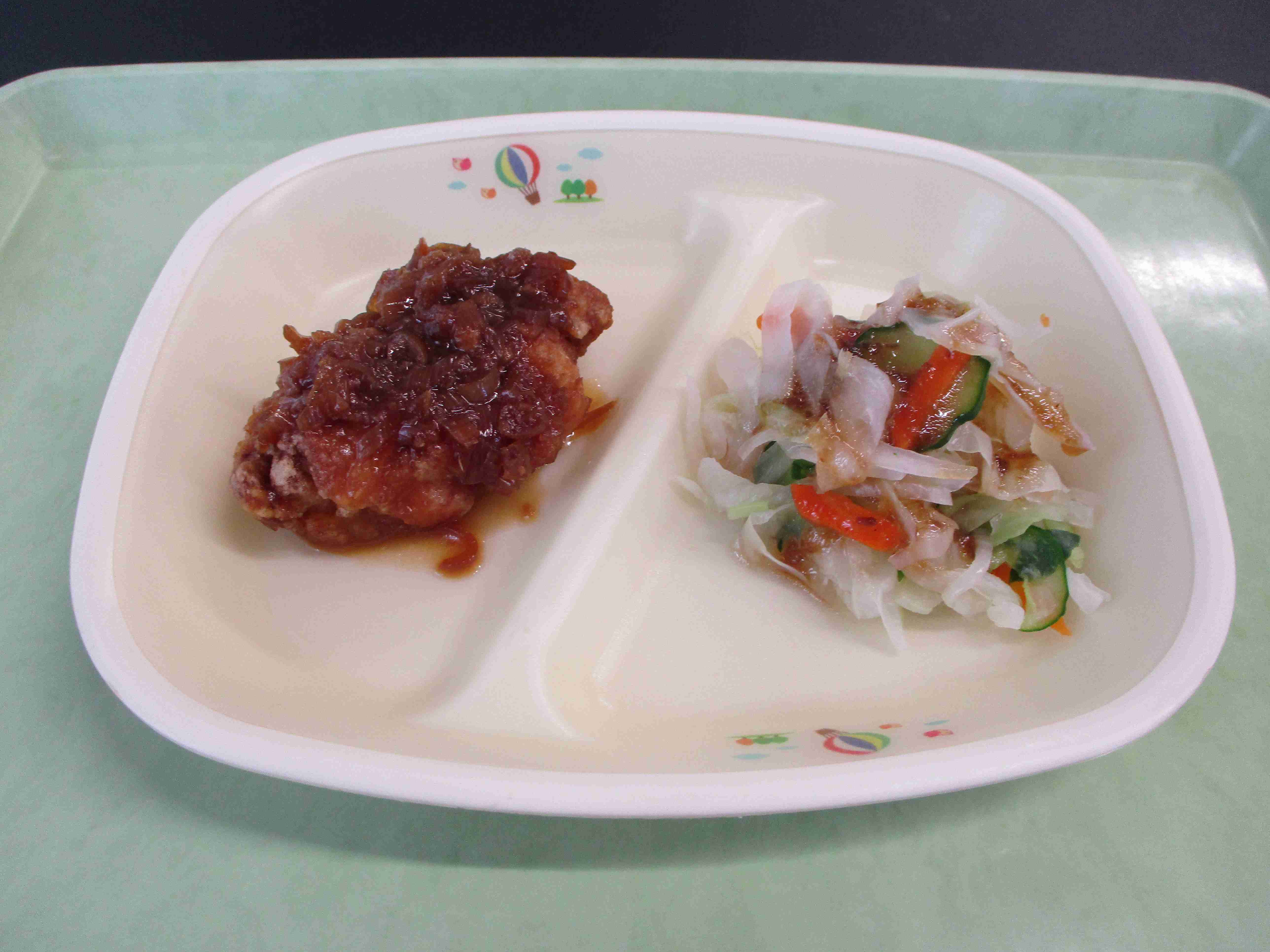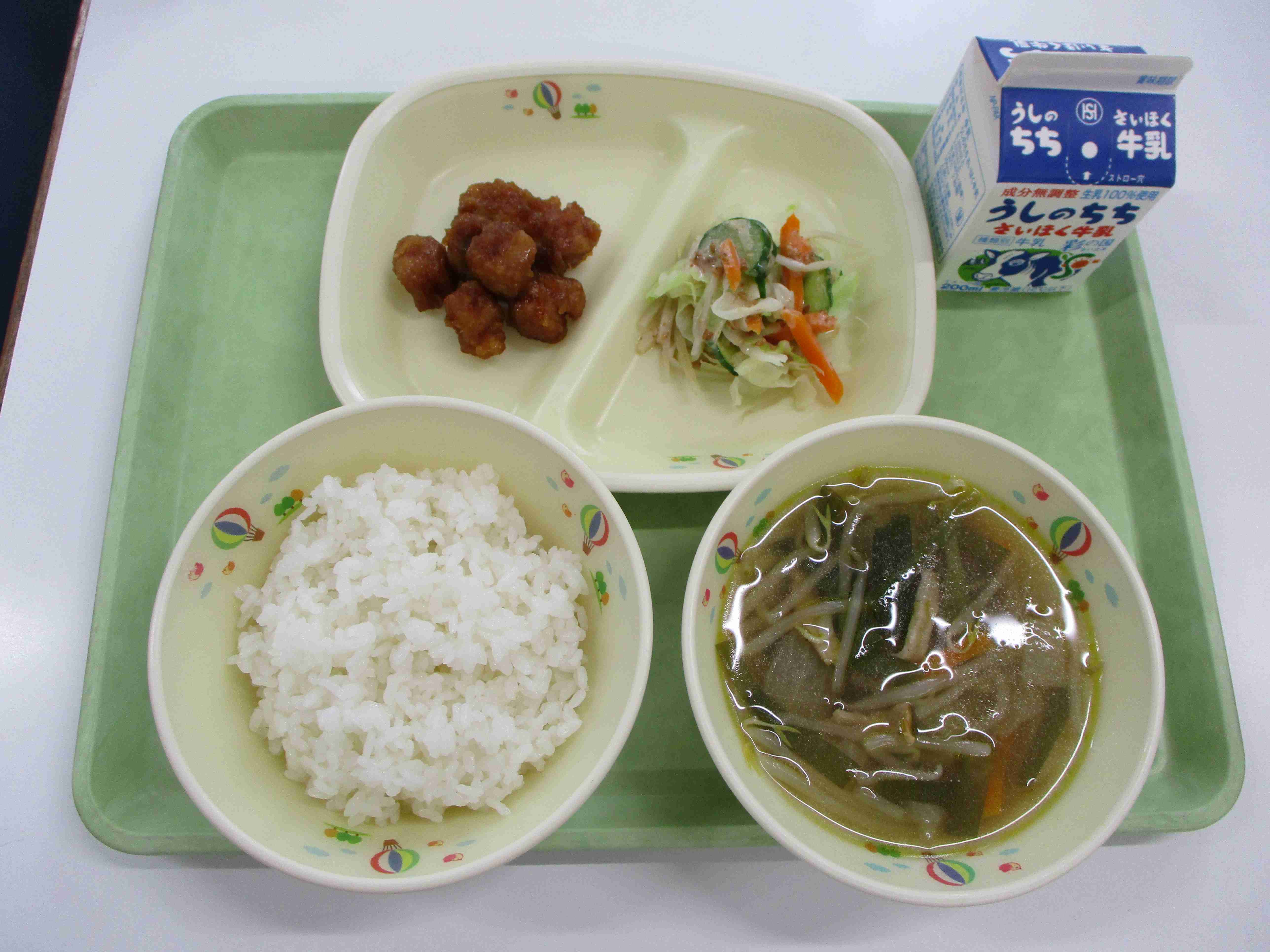ごはん 牛乳 油淋鶏 たまねぎのサラダ とん汁