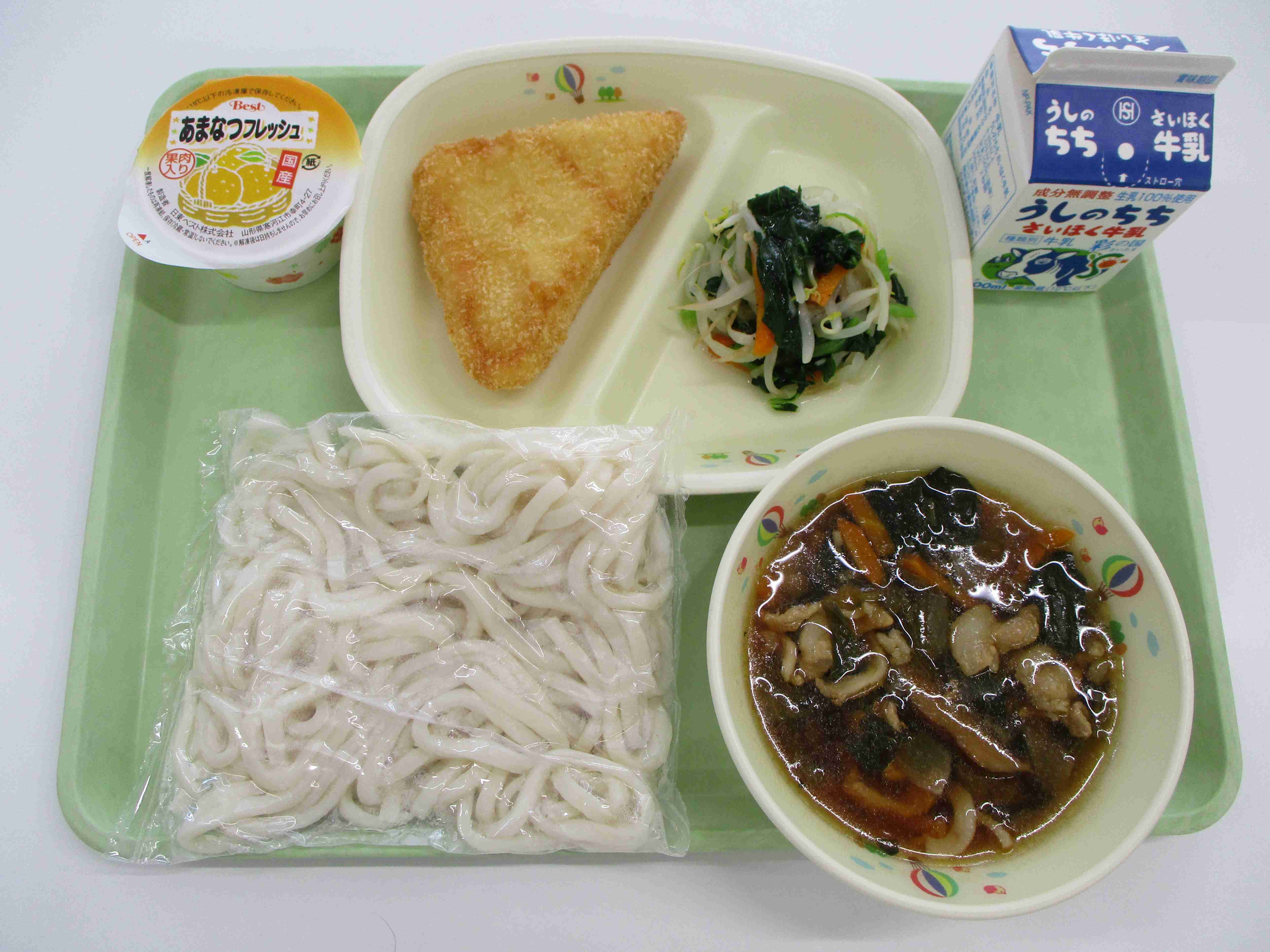 肉うどん、牛乳、はんぺんチーズフライ、小松菜のサラダ、あまなつゼリー