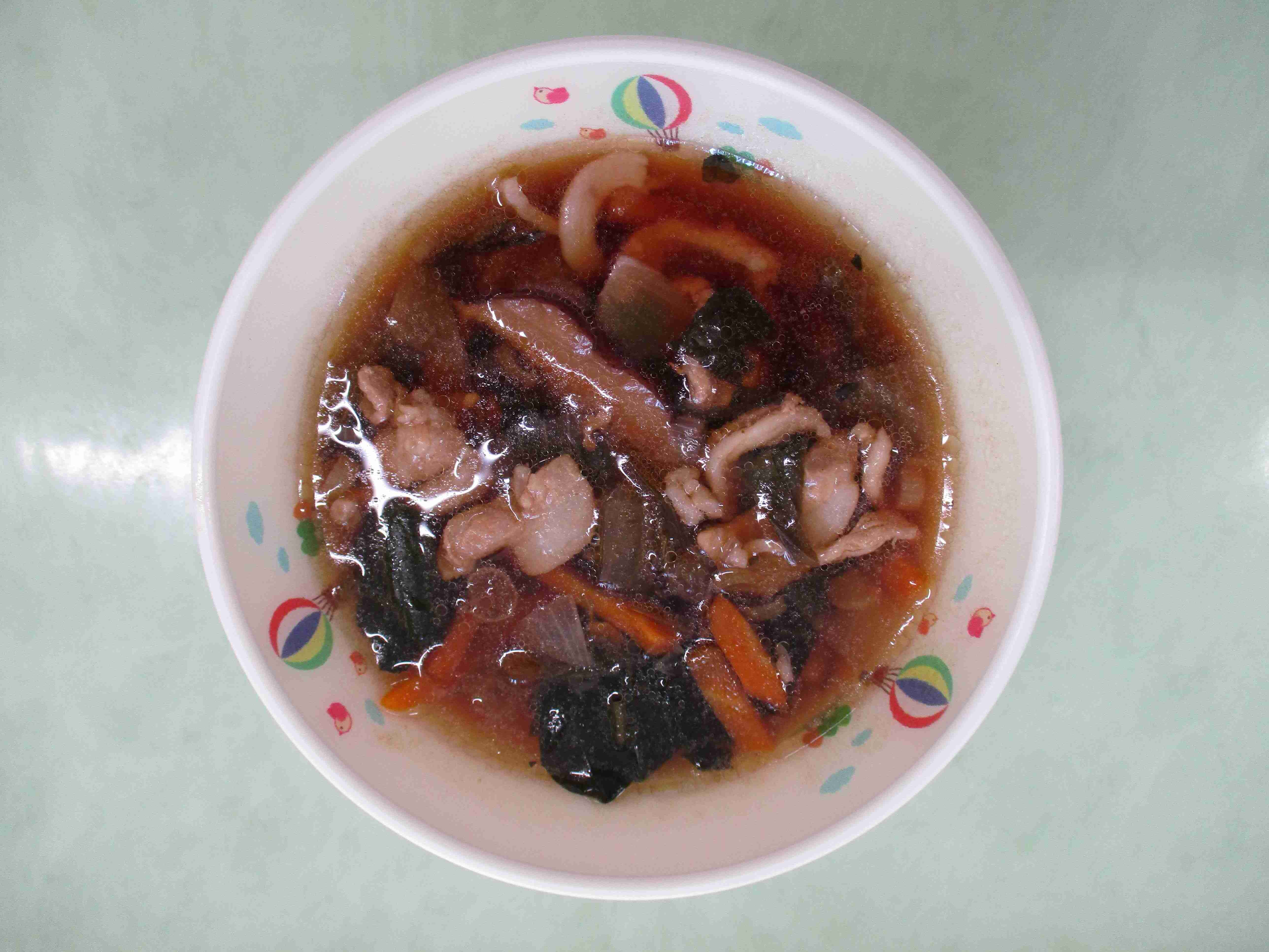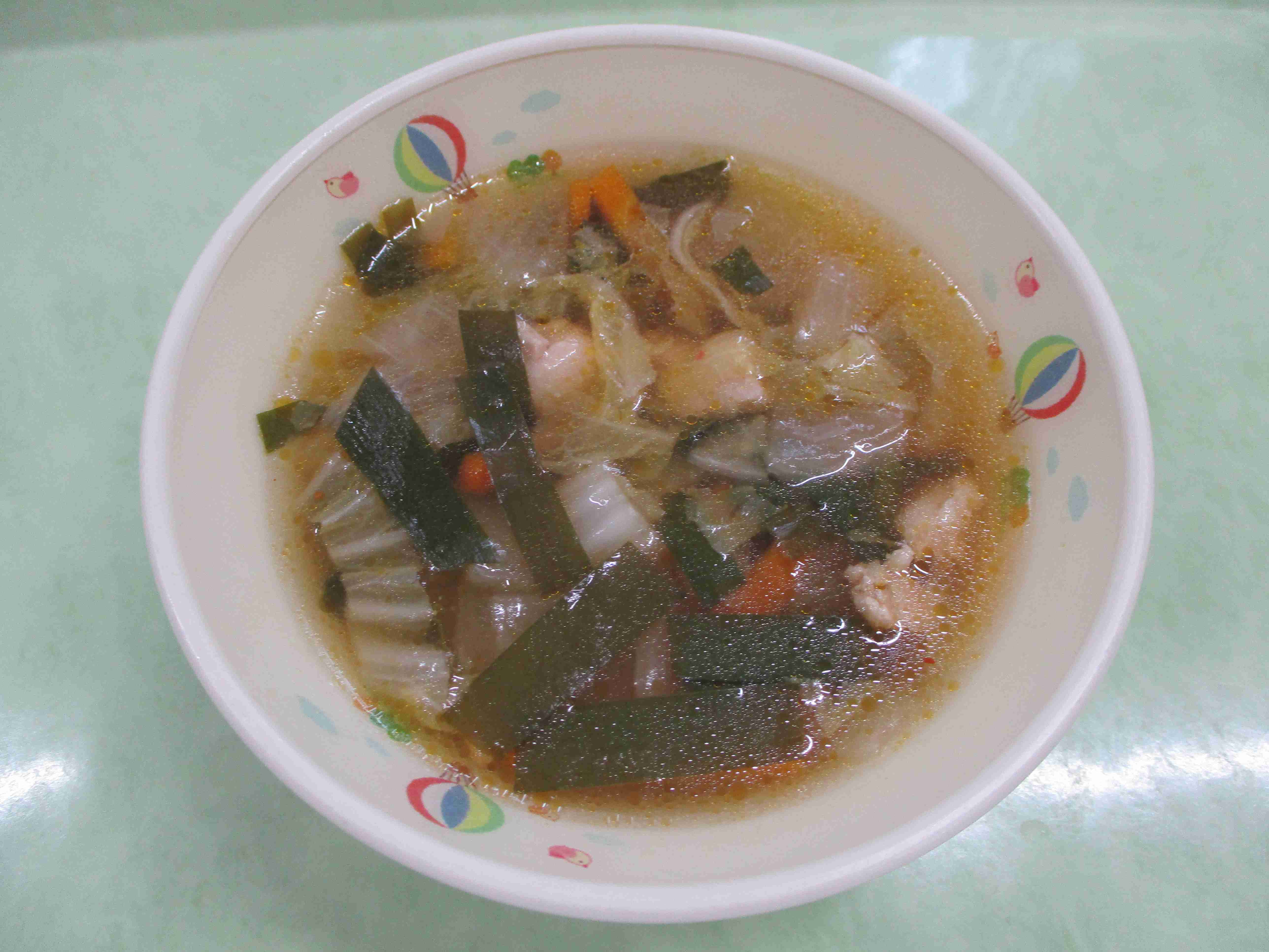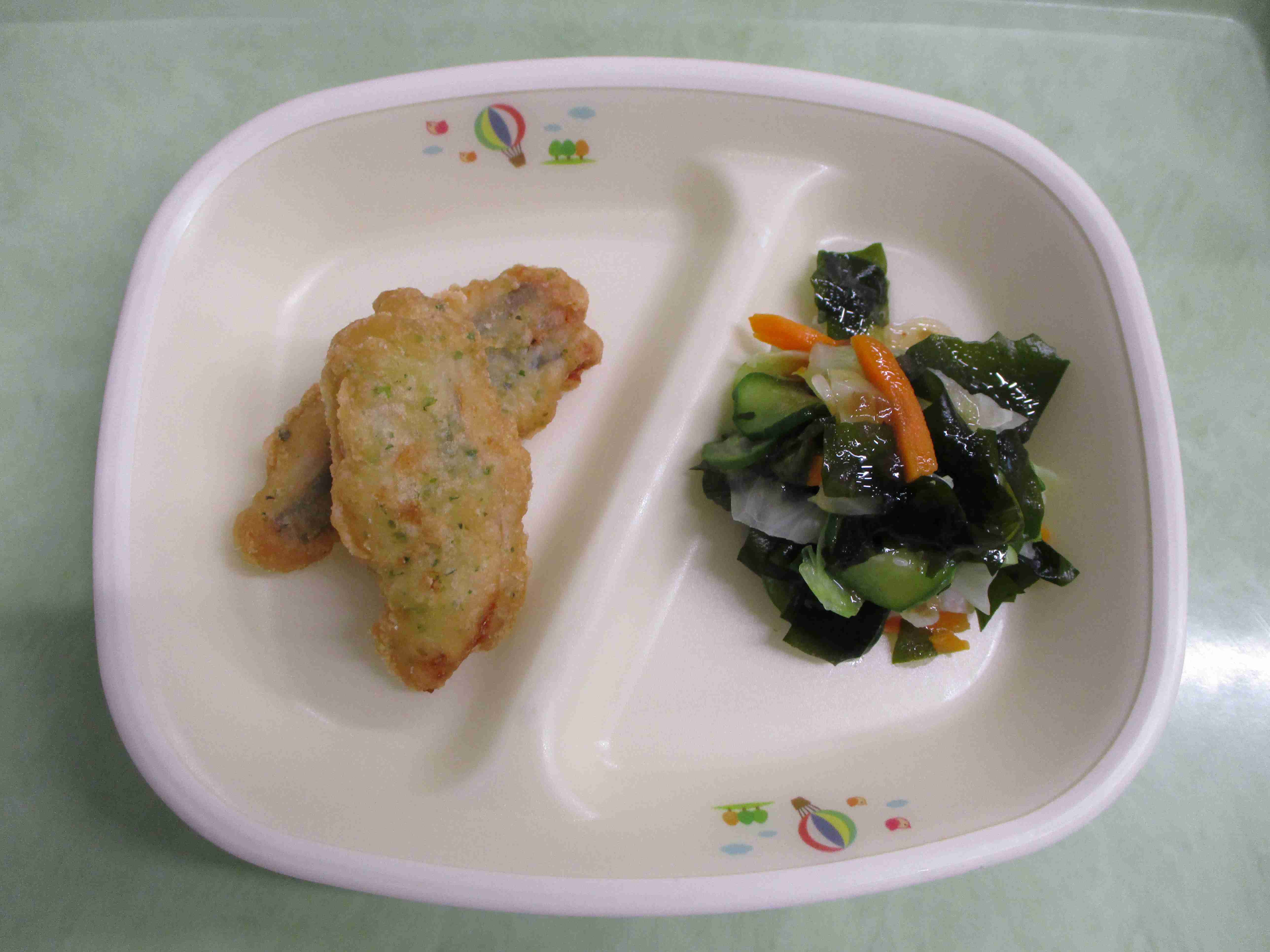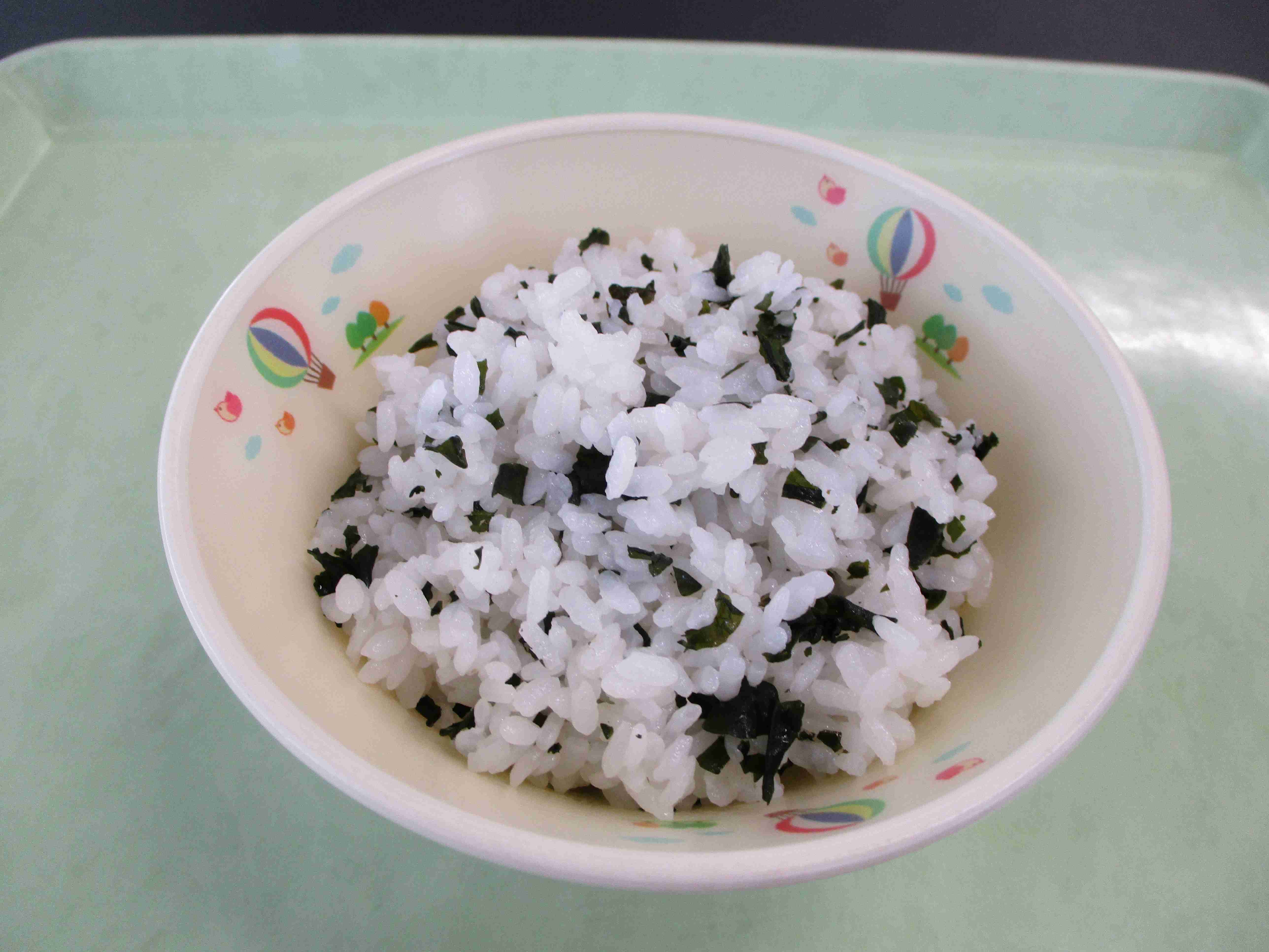 今日はわかめのお話です。わかめは日本各地でとれますが、波の荒いところで育ったものほどおいしいといわれます。収穫は春から初夏にかけてで、とれたては生でも食べられます。海にあるときは褐色ですが、お湯に通すと鮮やかな緑色に変わります。カロリーがほとんどなく、ビタミンやミネラルが豊富なヘルシーな食品です。今日はサラダにしました。残さず食べましょう。