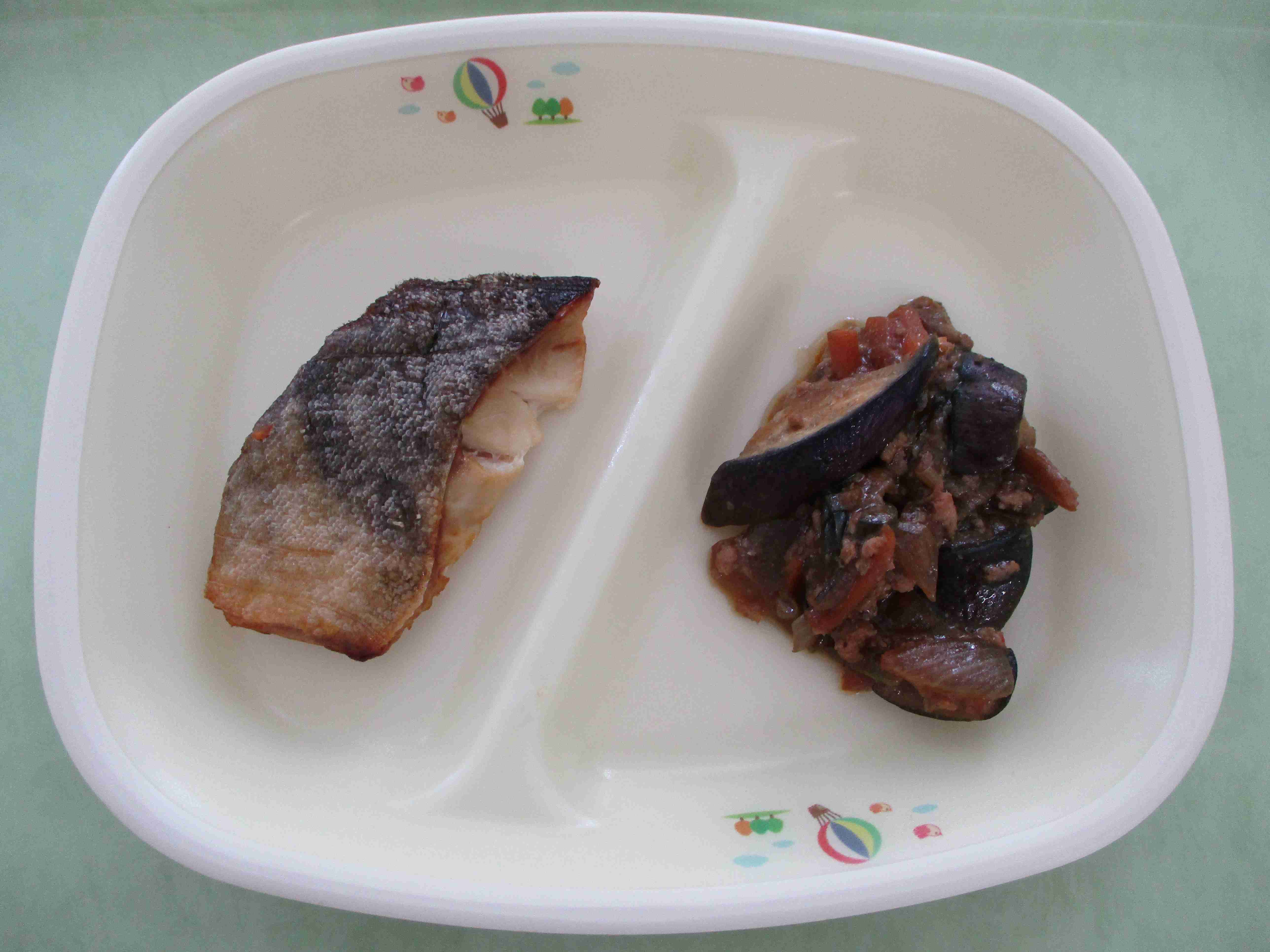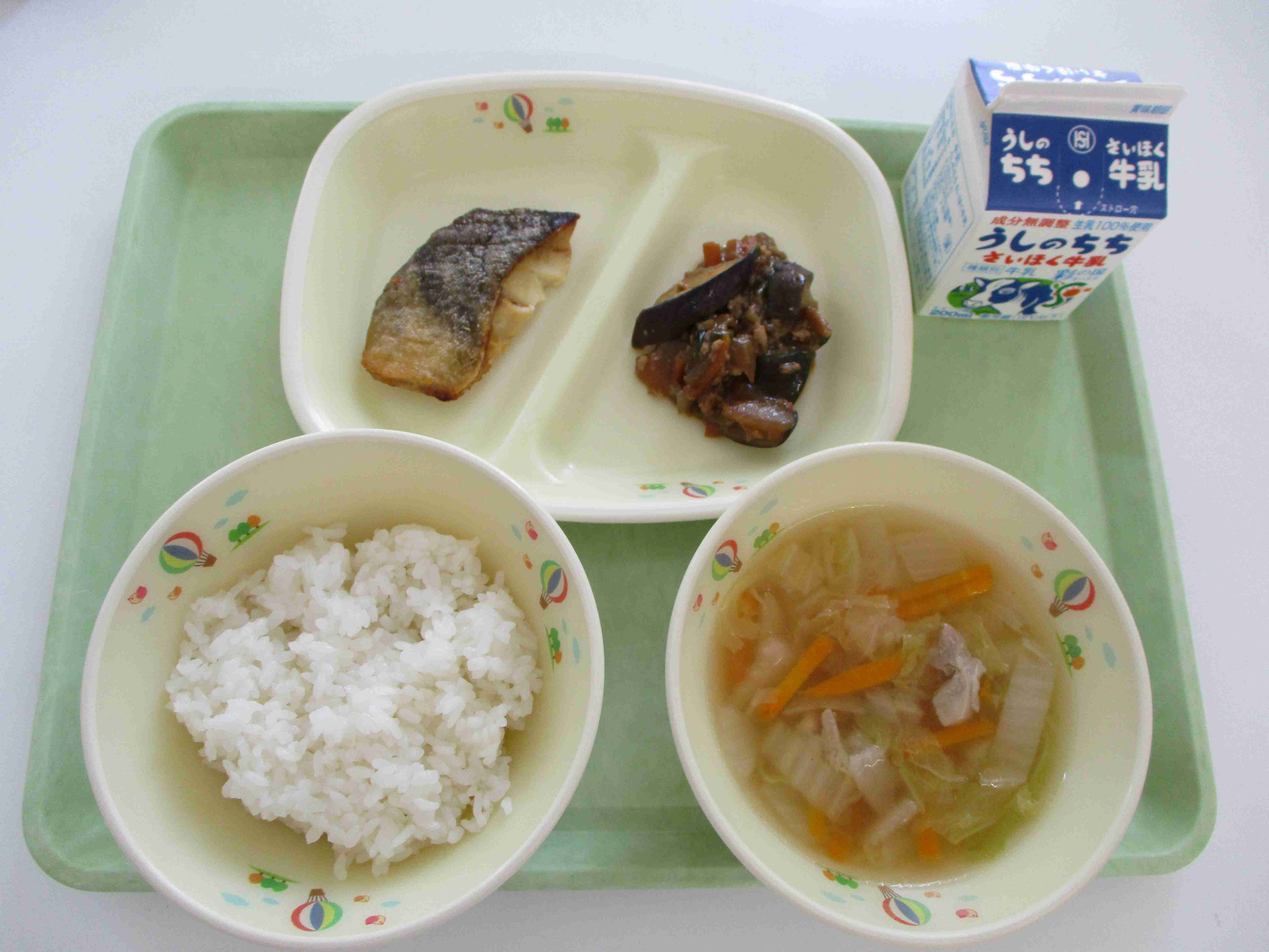 今日はなすのお話です。なすの生まれはインドです。日本には平安時代に伝わりました。なすの紫色は「ナスニン」と呼ばれ、私たちの体を病気から守ってくれます。また、日本にはちいきによっていろいろななすが栽培されています。形が長いもの・丸いもの・みどり色のものなどさまざまです。秋のなすは、皮がやわらかく、実がひきしまっておいしいといわれます。今日は、マーボーナスにしました。苦手なお友達もひとくちチャレンジしてみましょう。