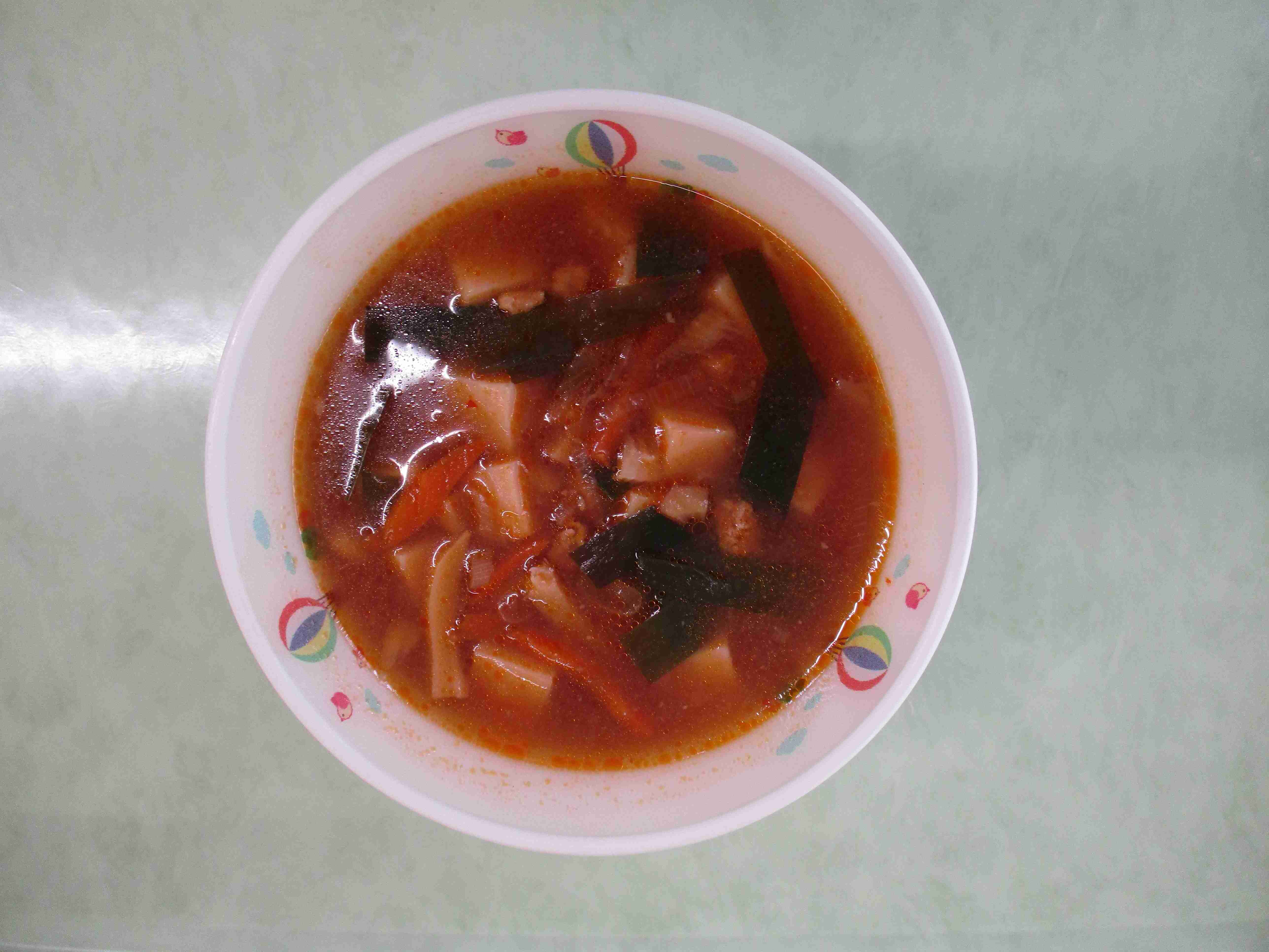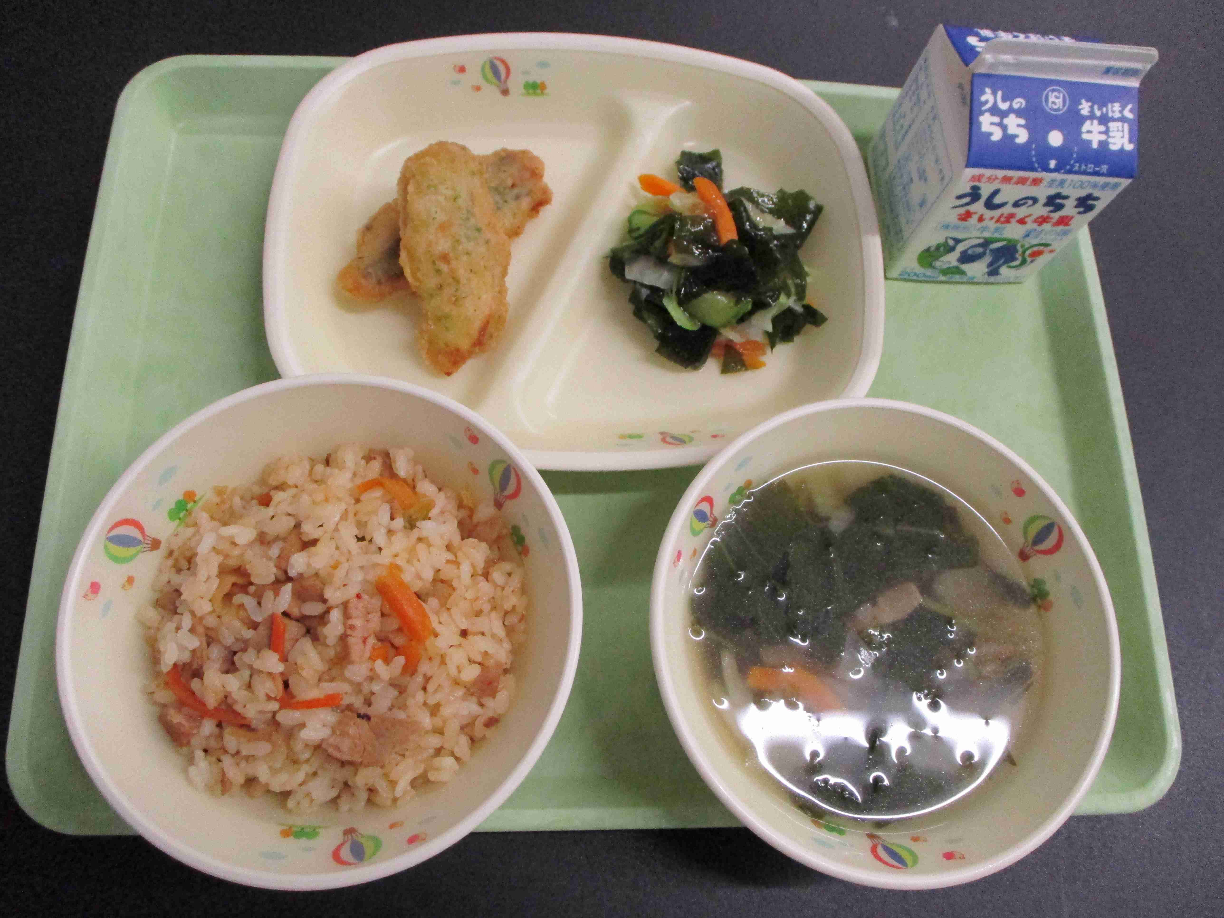 キムチチャーハン 牛乳 あじフリッター わかめサラダ チンゲン菜のスープ
