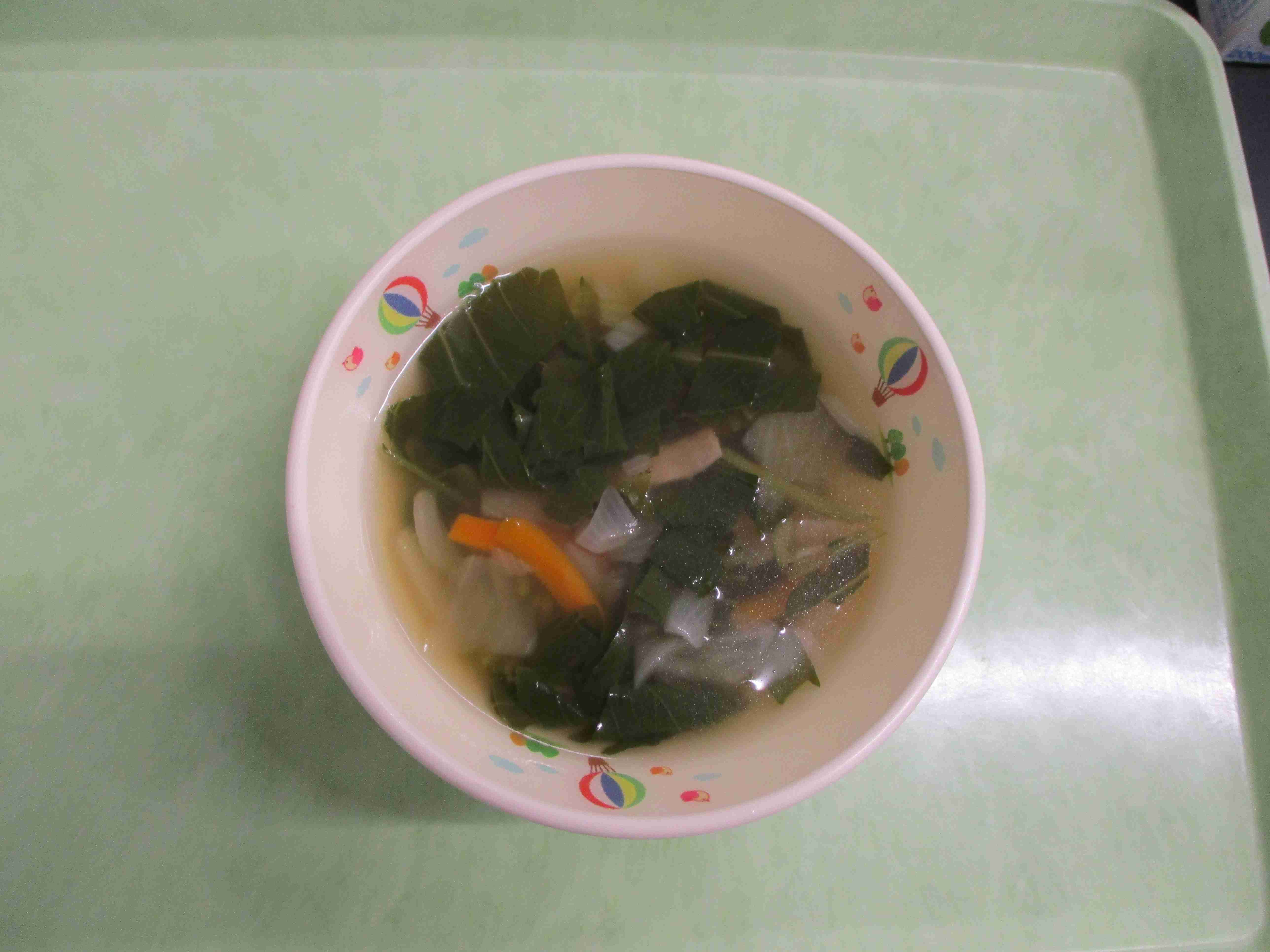 今日はこまつなのお話です。昔は冬にとれるため冬菜、雪菜などと呼ばれていましたが、東京都江戸川区の小松川が原産地であるため、小松菜の名前がつきました。スーパーなどでは1年中見かける野菜ですね。緑黄色野菜の代表でほうれん草と似ていますが、骨を丈夫にするカルシウムがほうれん草の5倍もあります。さらにビタミンCも豊富です。今日はおひたしにしました。残さず食べましょう。