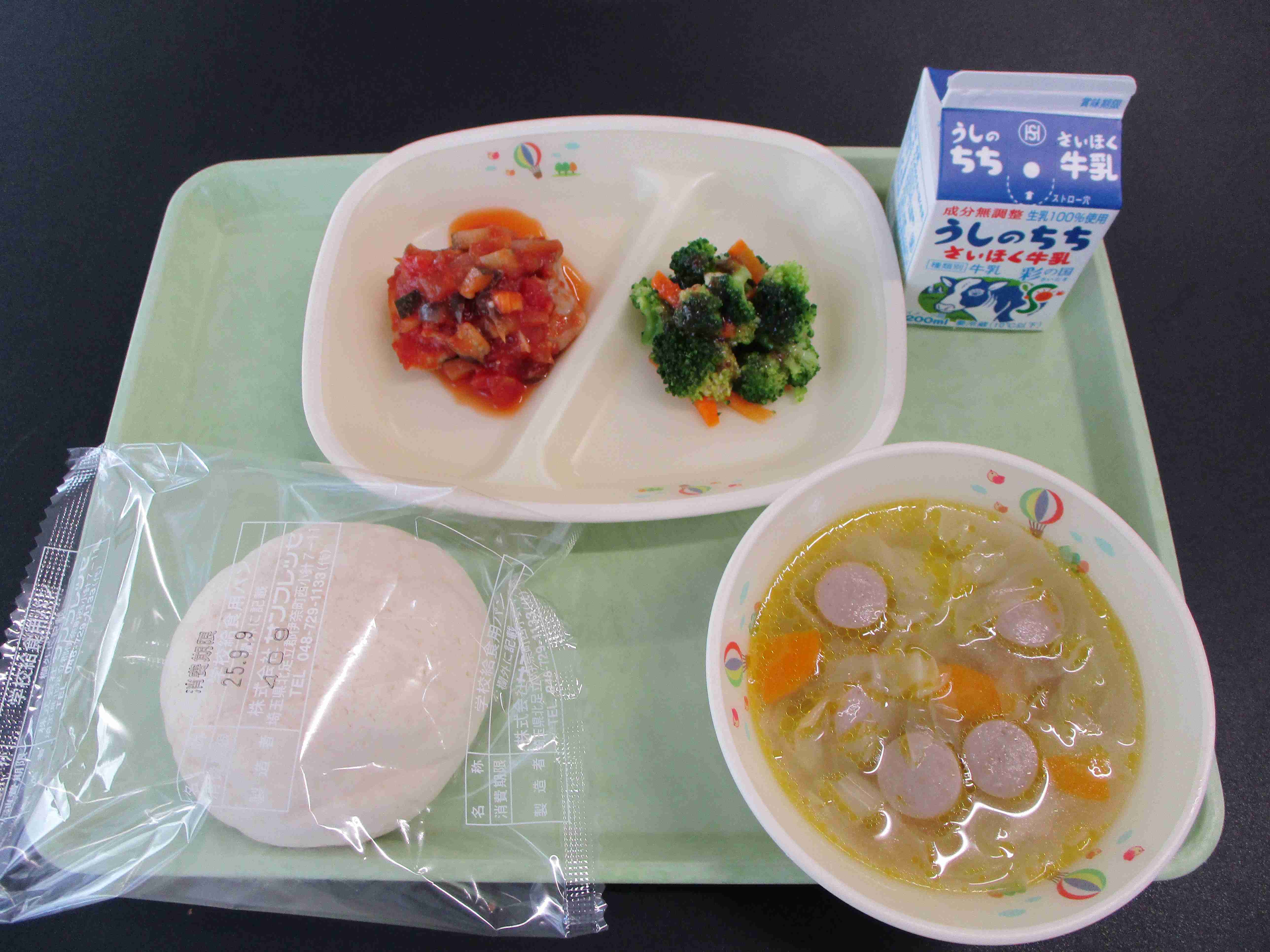 メロンパン 牛乳 とり肉のラタトゥユソース ブロコッリーのサラダ コンソメスープ