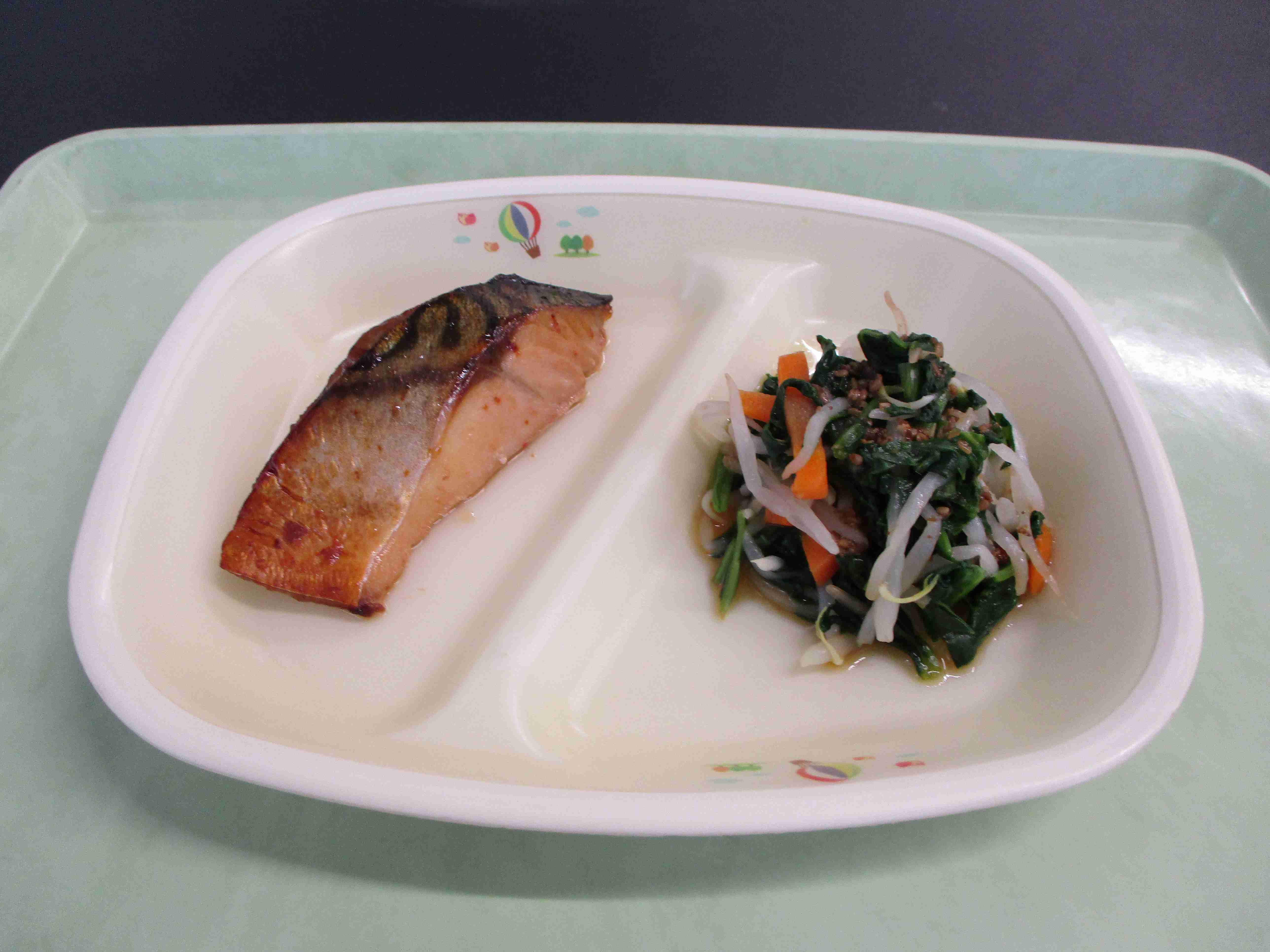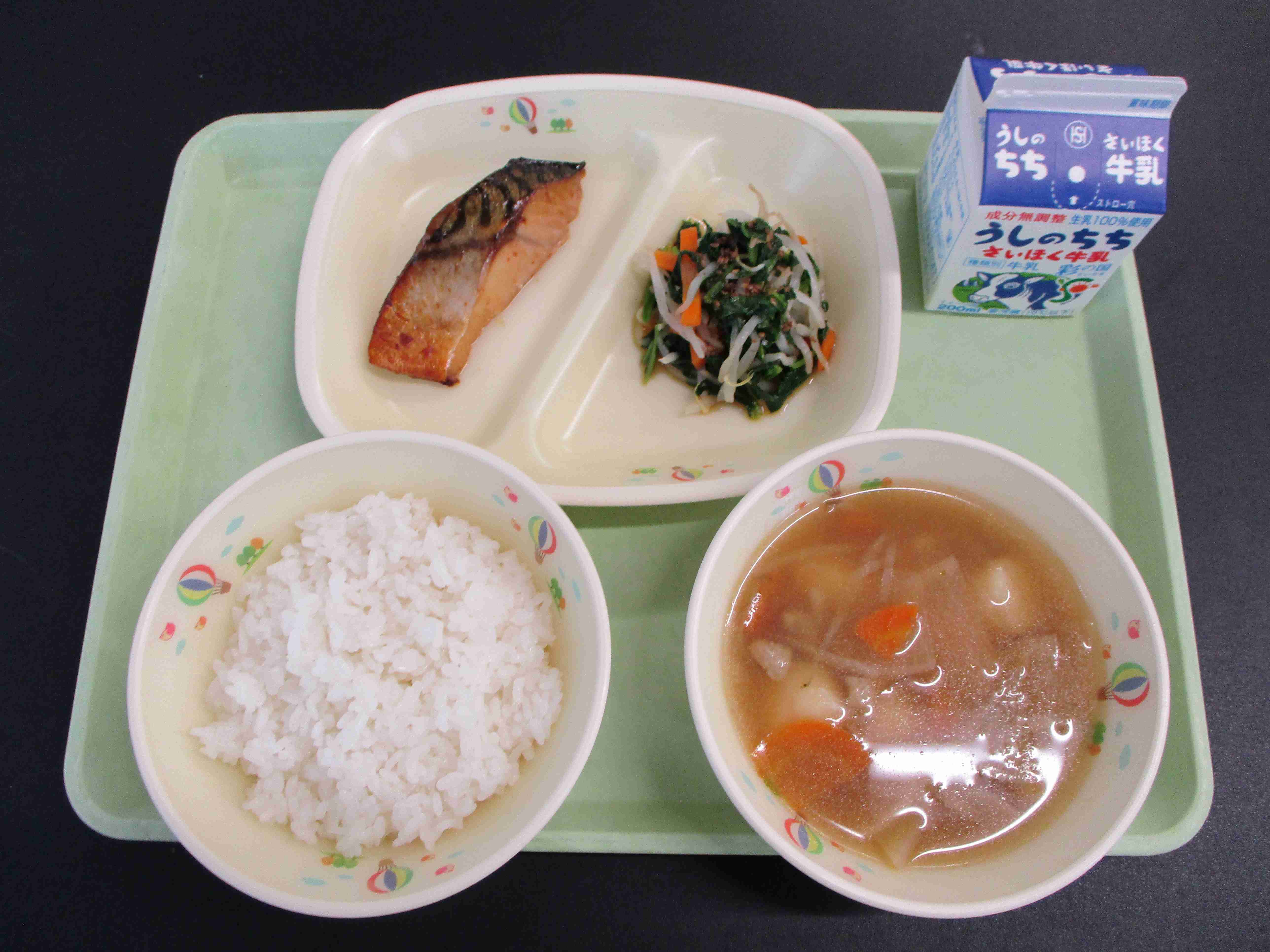 ごはん 牛乳 さばの詩仙焼き ほうれんそうのサラダ いも団子汁