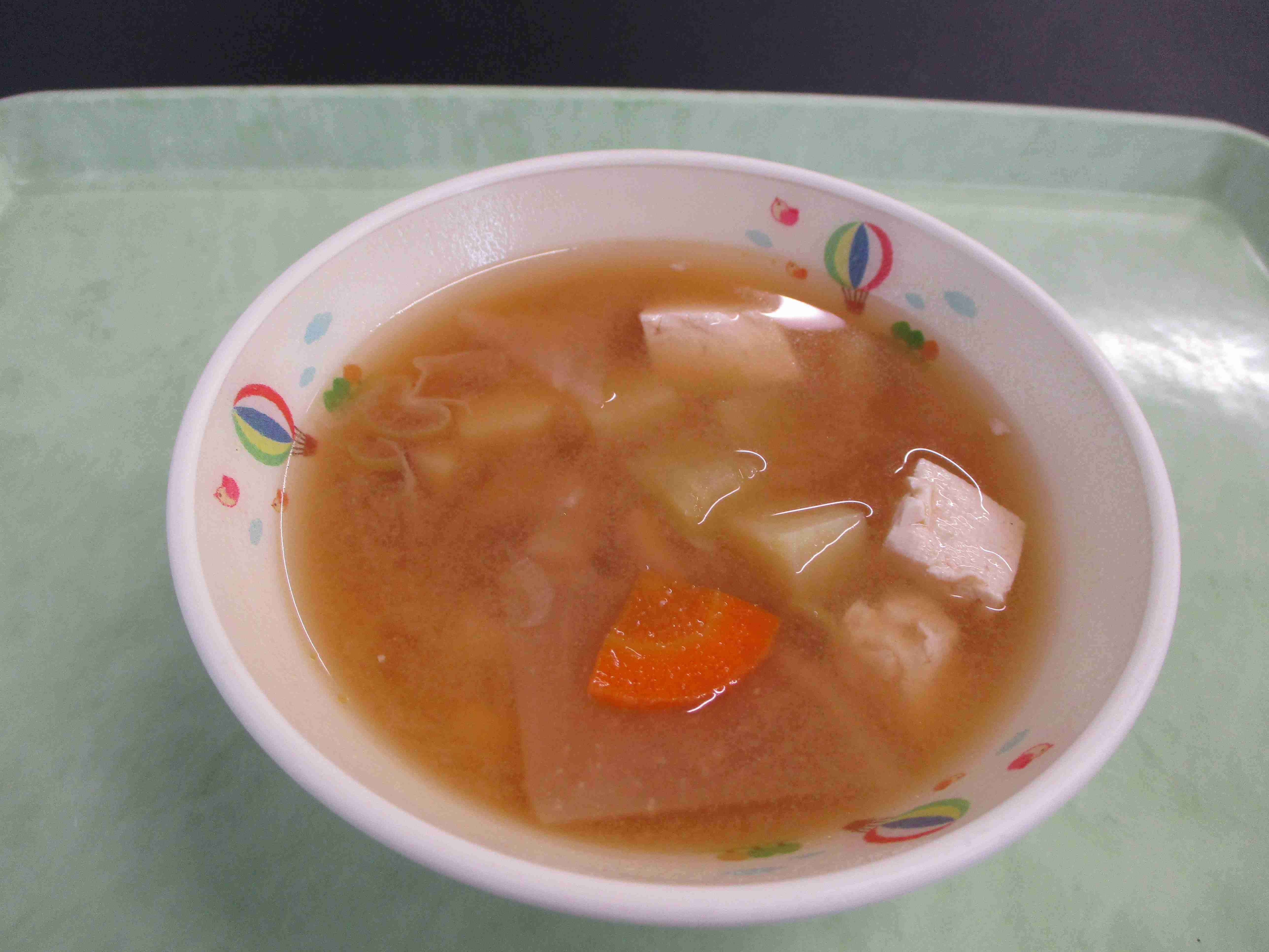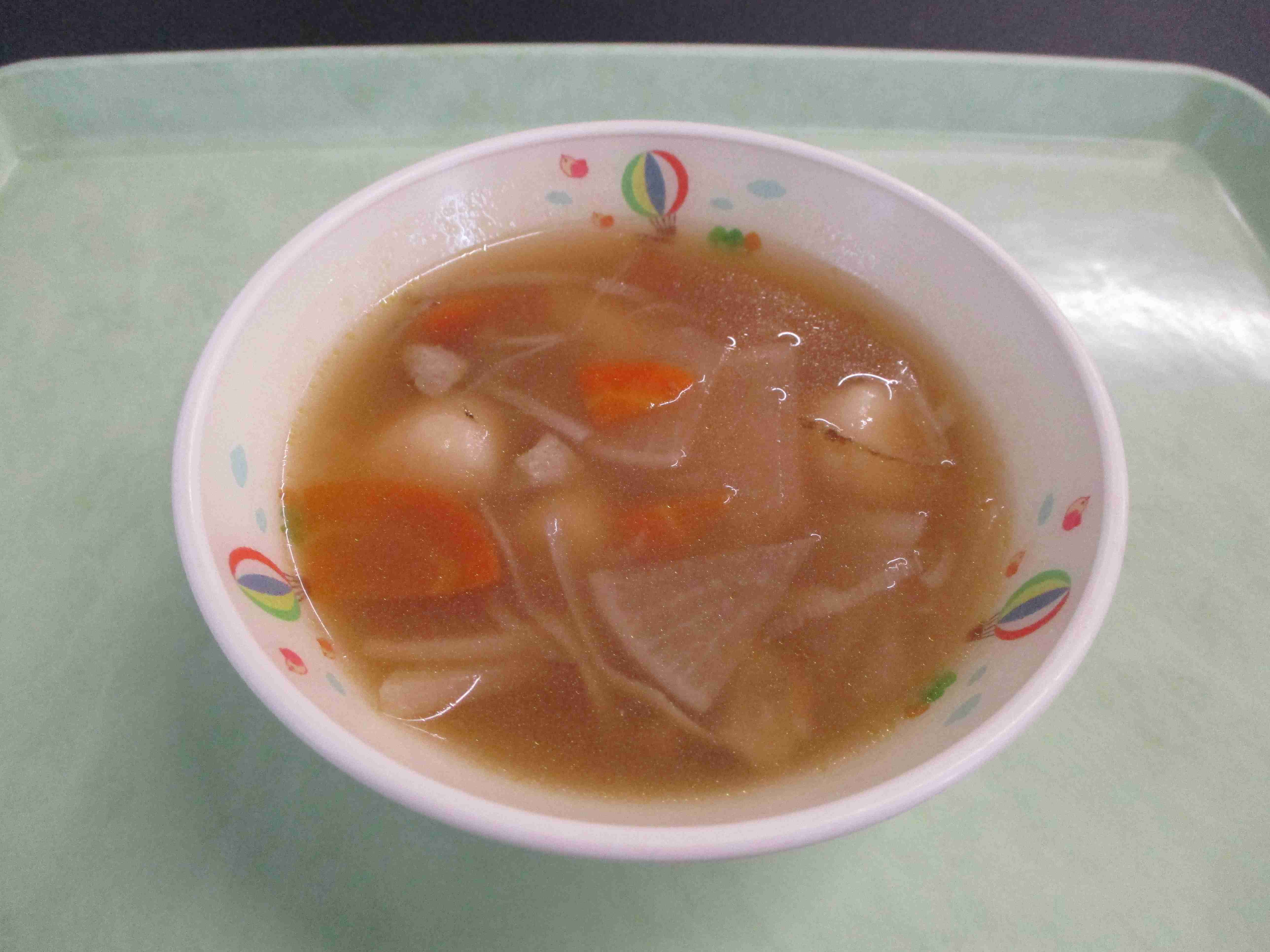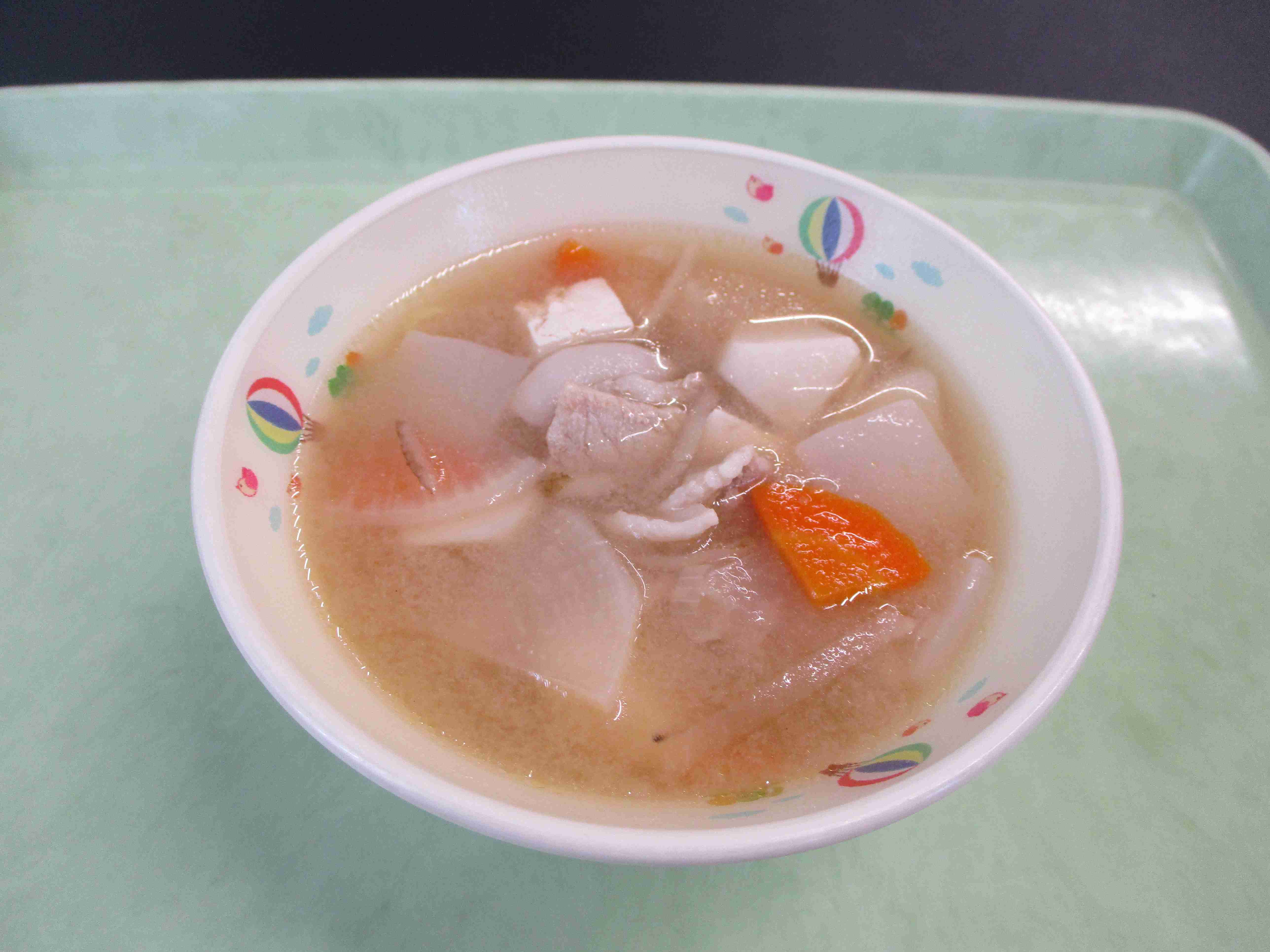 今日は里いものお話です。里いもは縄文時代に中国からやってきました。山に自然にできる「山のいも」に対し、里で作られるので「里いも」と呼ばれるようになりました。里いもには、エネルギーのもとになるでんぷんや体を作るたんぱく質がたくさん入っています。また、里いものヌルヌルは食物繊維で、胃を守り、腸の働きを助けてくれます。今日はとん汁に使っています。残さず食べましょう。
