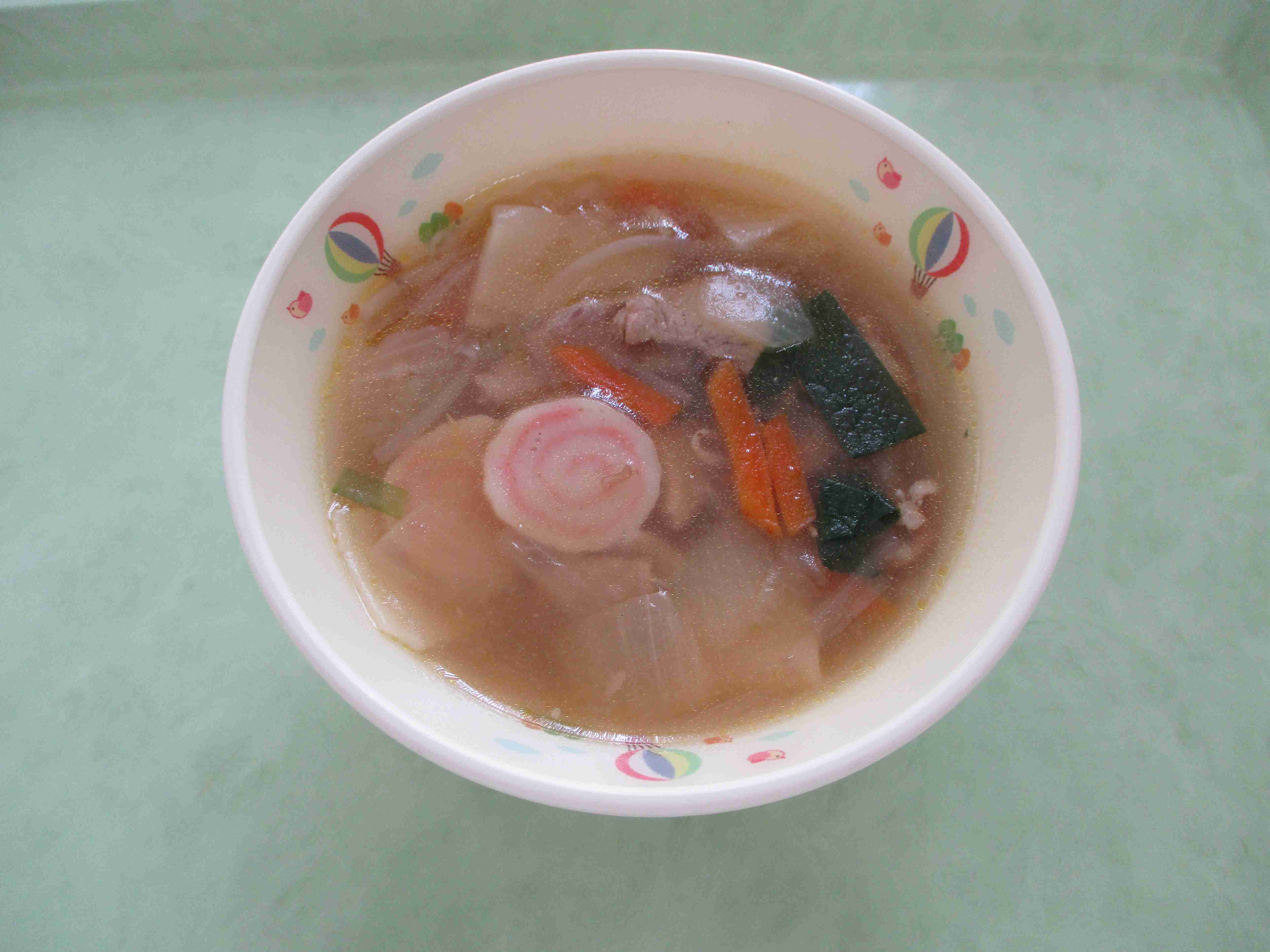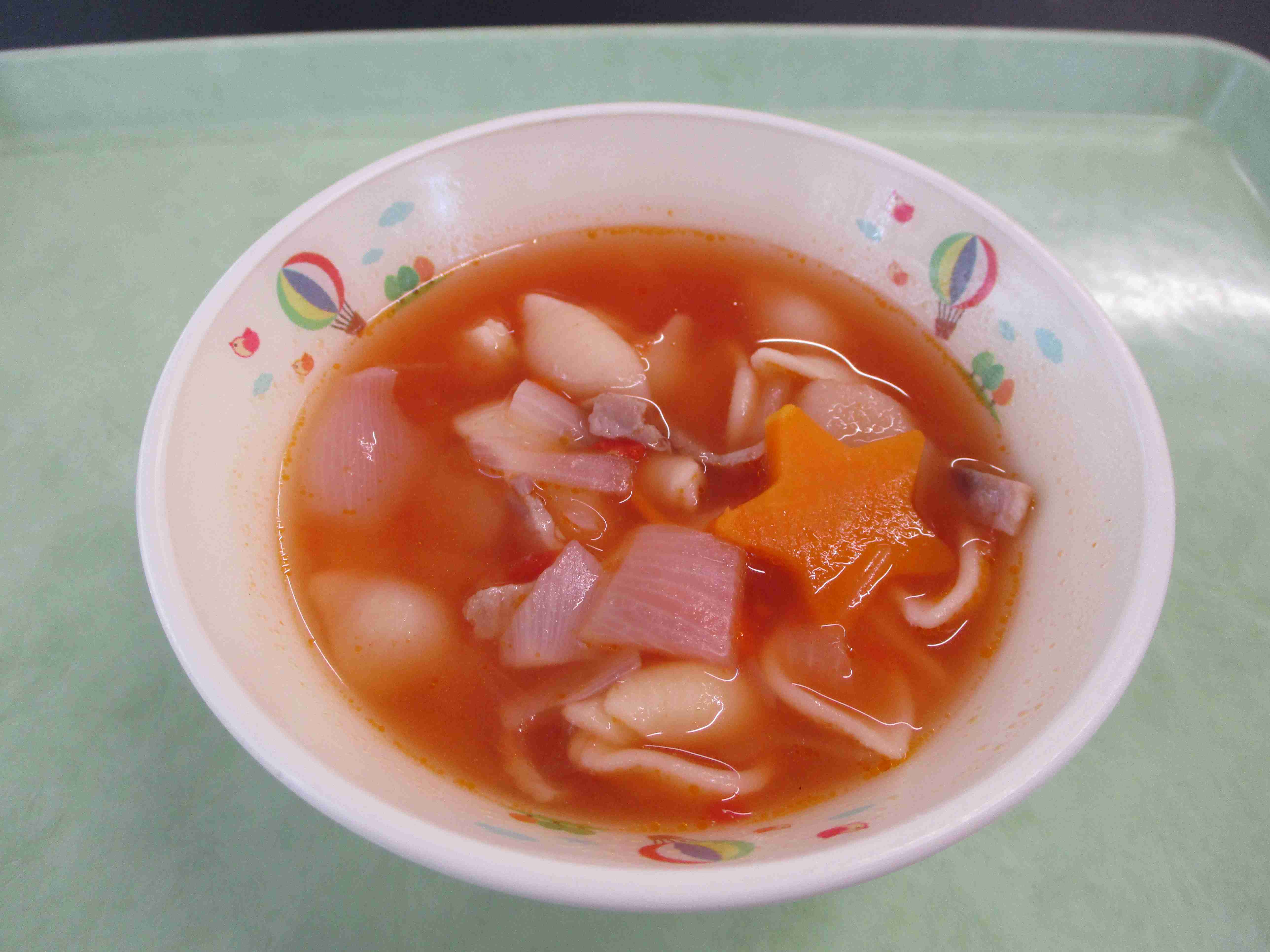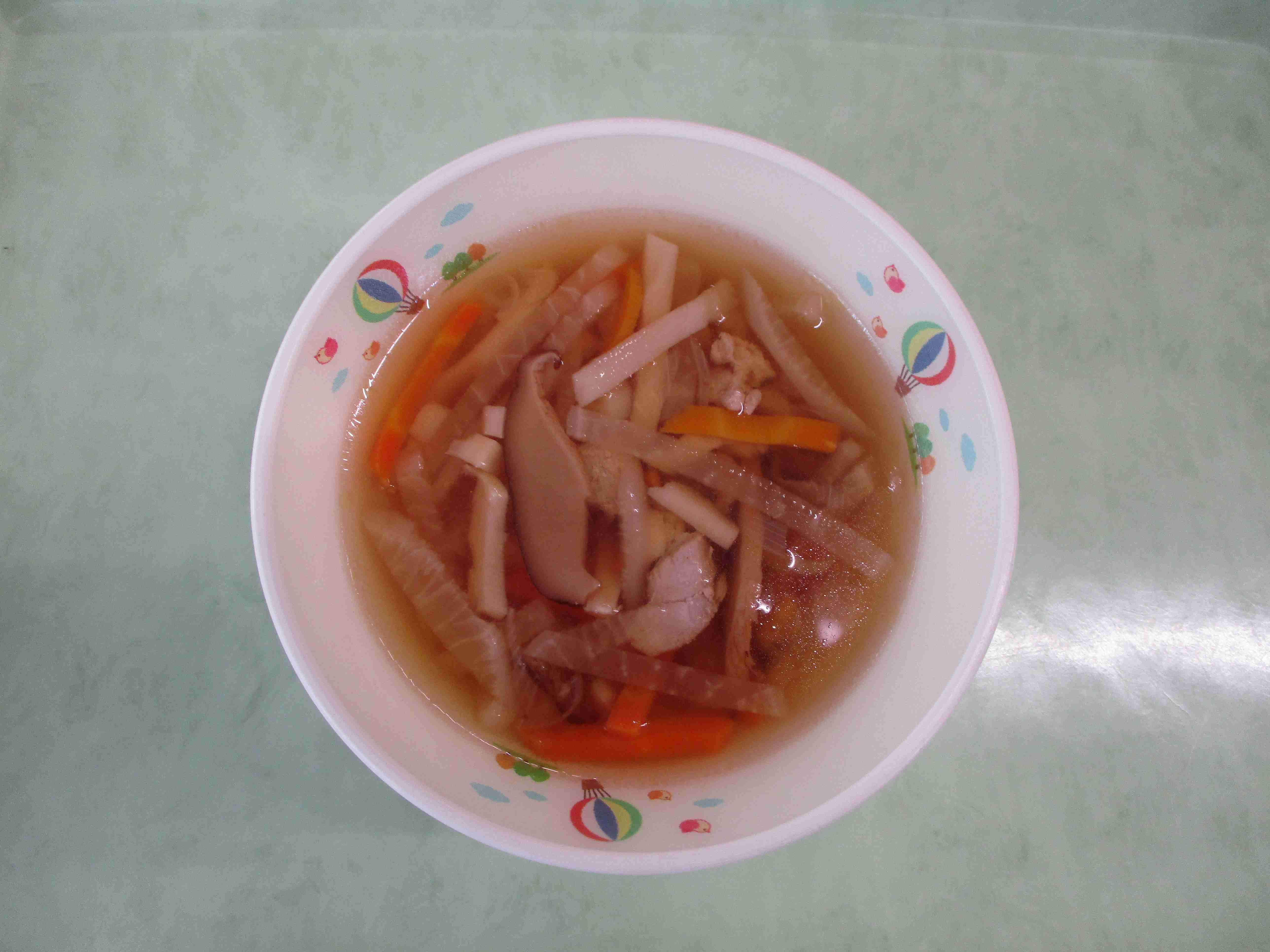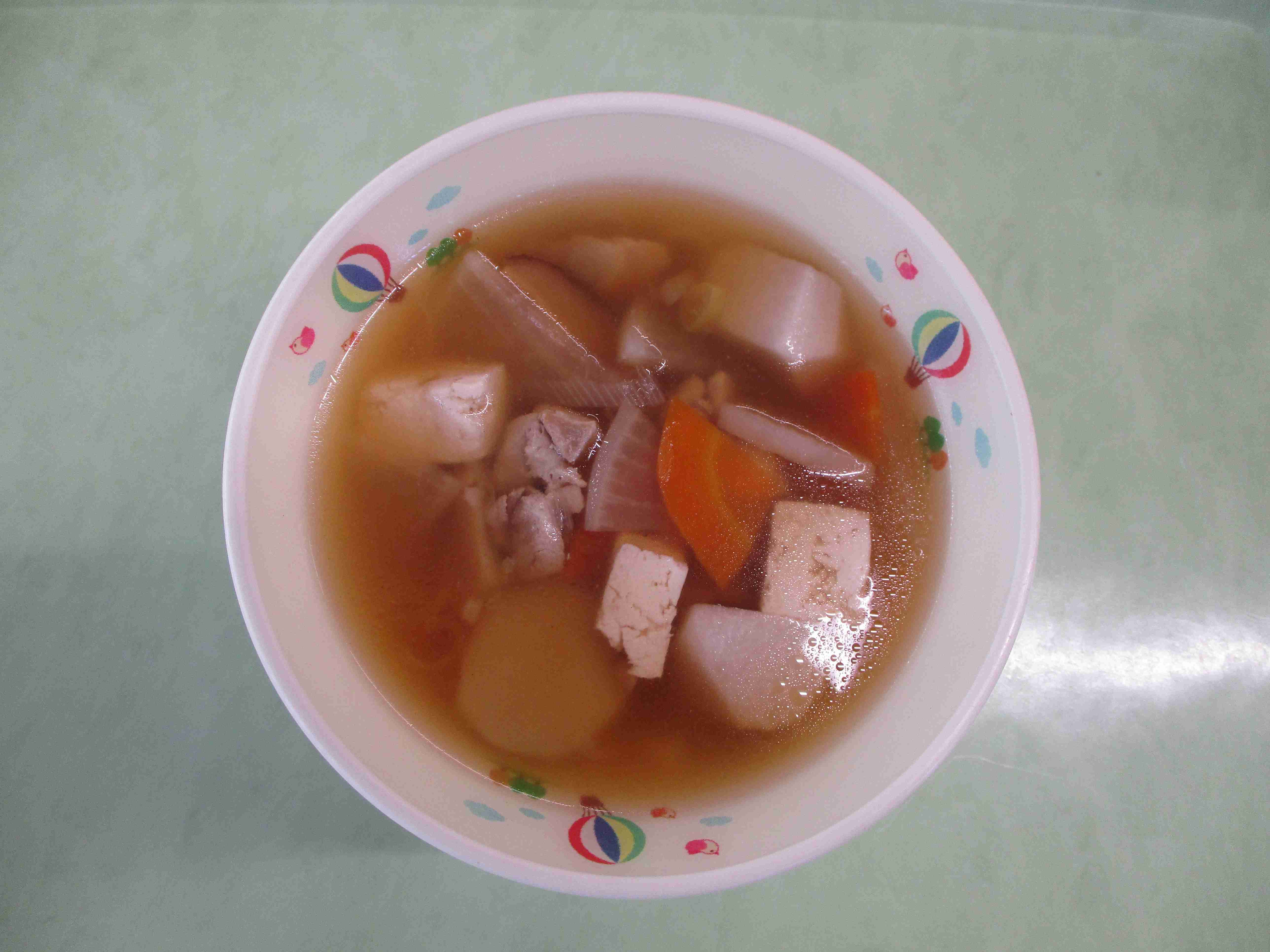 今日は里いものお話です。里いもは縄文時代に中国からやってきました。山に自然にできる「山のいも」に対し、里で作られるので「里いも」と呼ばれるようになりました。里いもには、エネルギーのもとになるでんぷんや体を作るたんぱく質がたくさん入っています。また、里いものヌルヌルは食物繊維で、胃を守り、腸の働きを助けてくれます。今日はとん汁に使っています。残さず食べましょう。