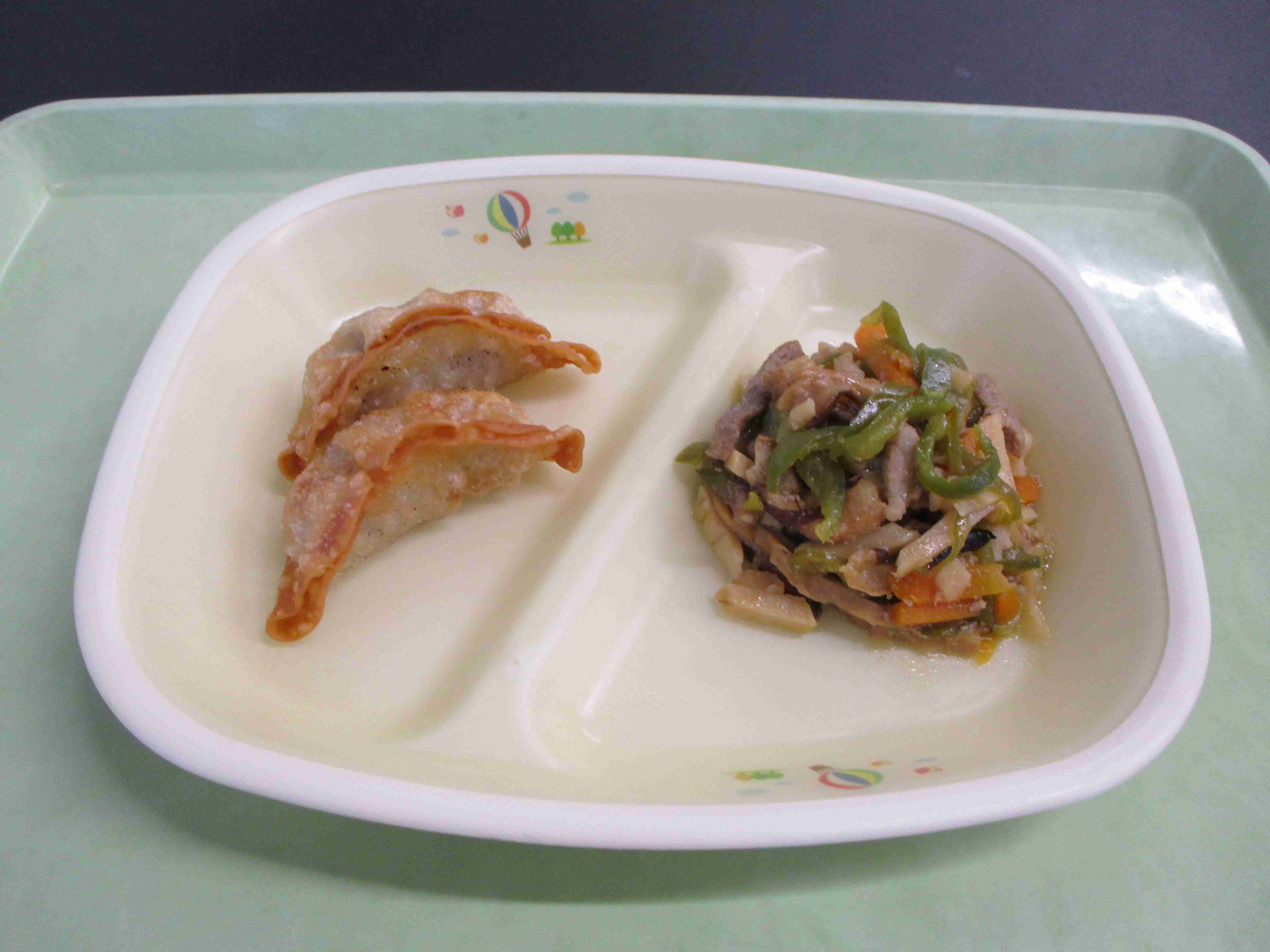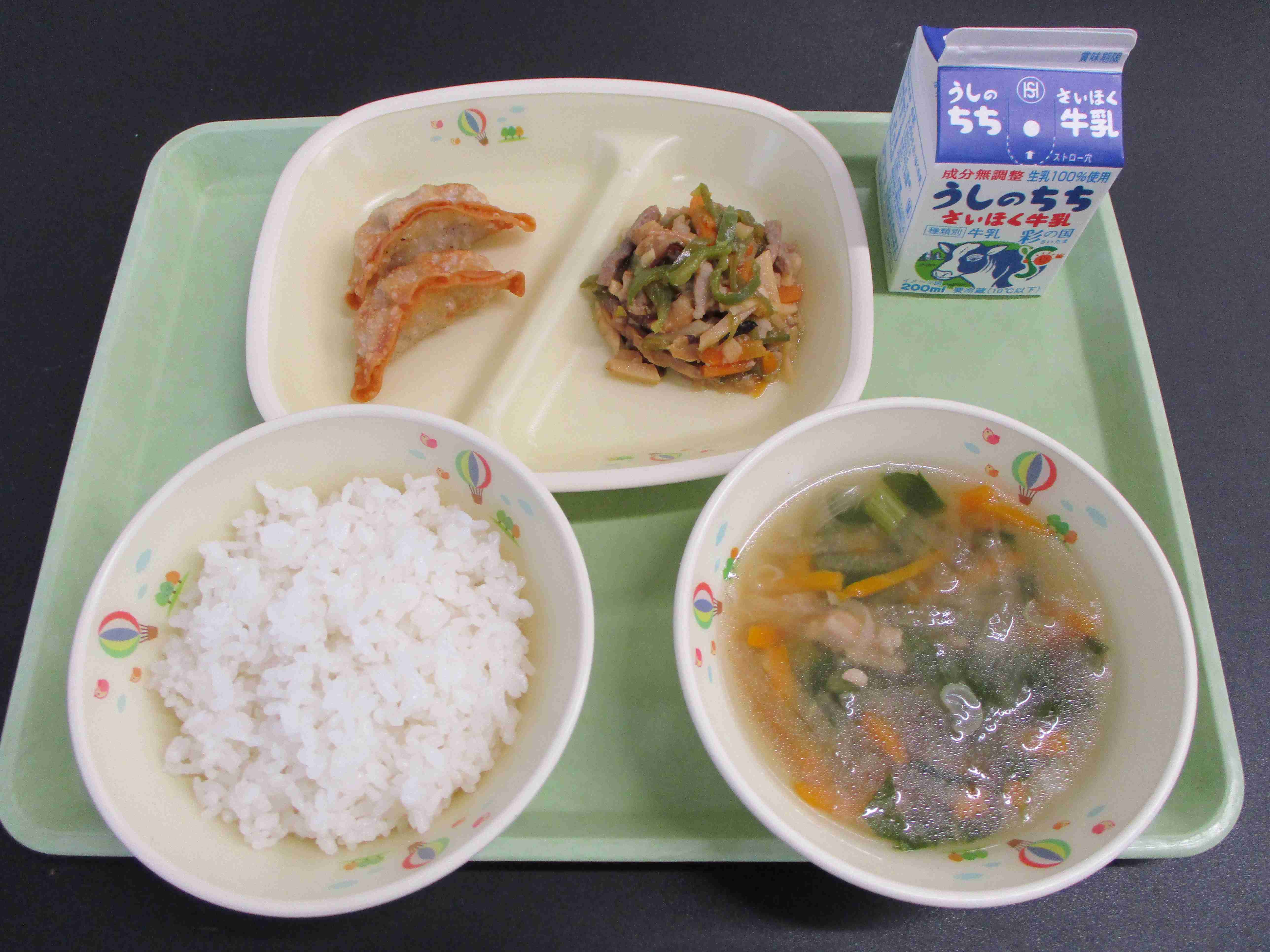 ごはん 牛乳 揚げぎょうざ チンジャオロース 冬瓜のスープ