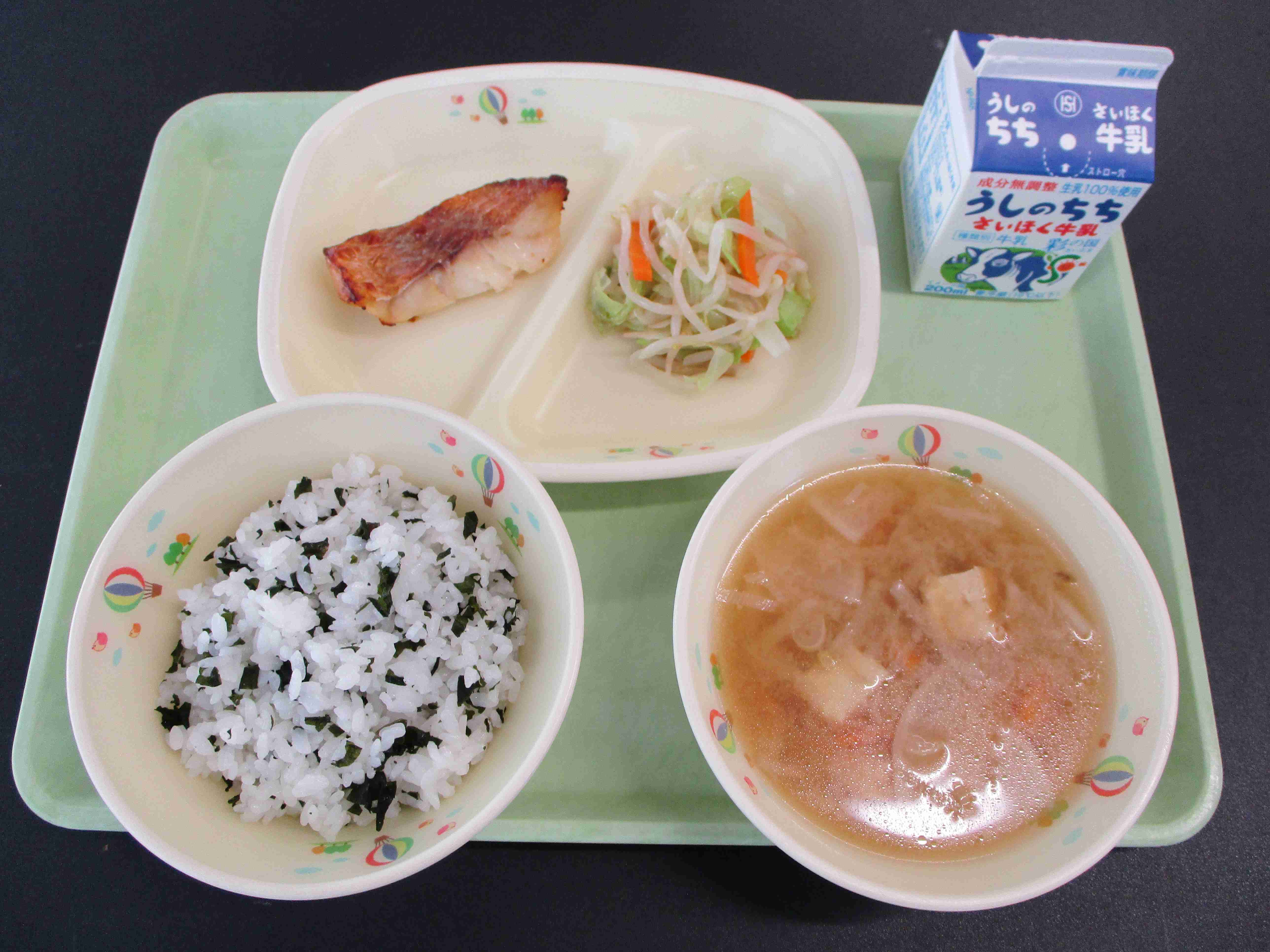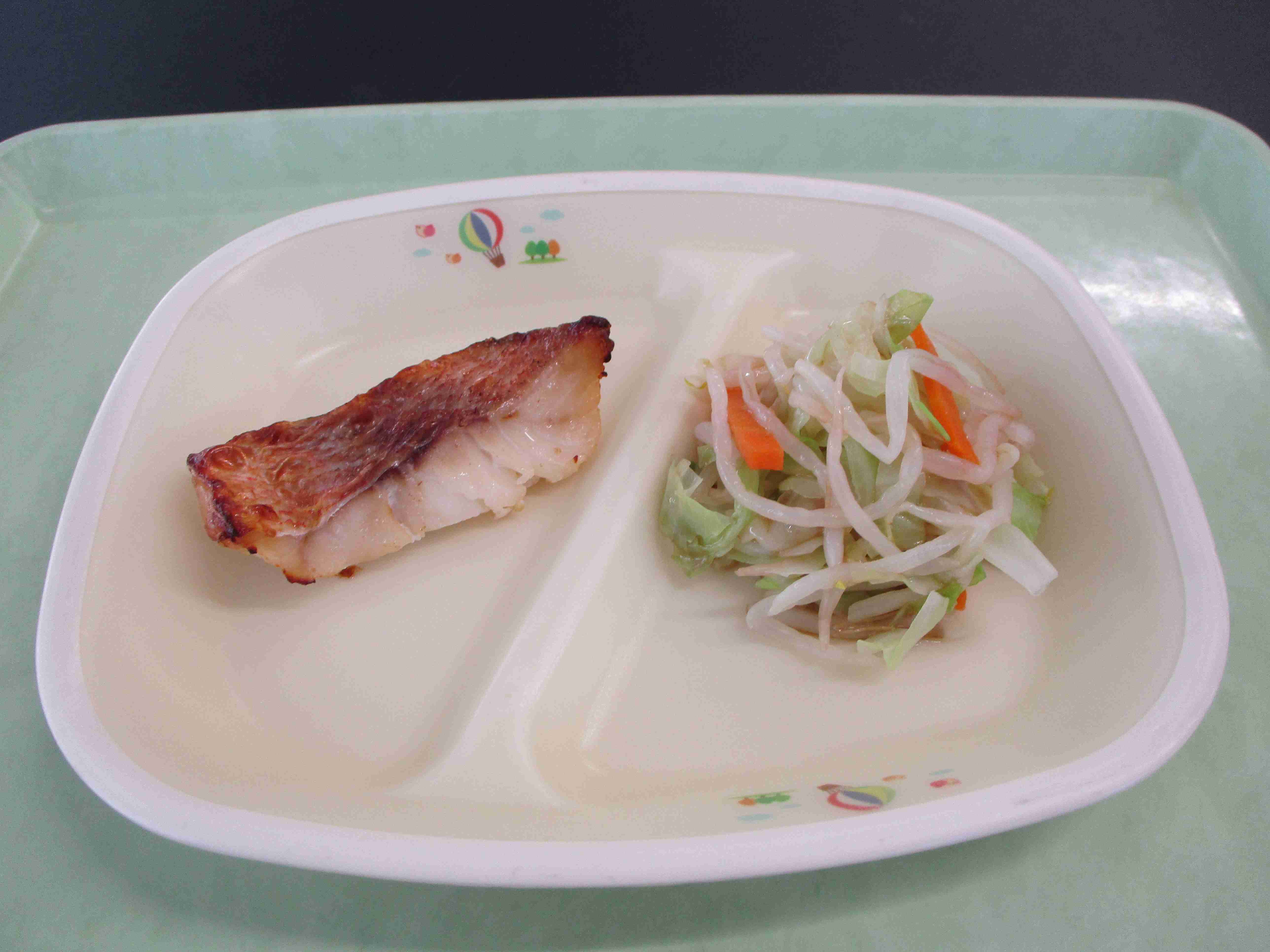 わかめごはん 牛乳 赤魚の白醤油焼き 中華サラダ 田舎汁