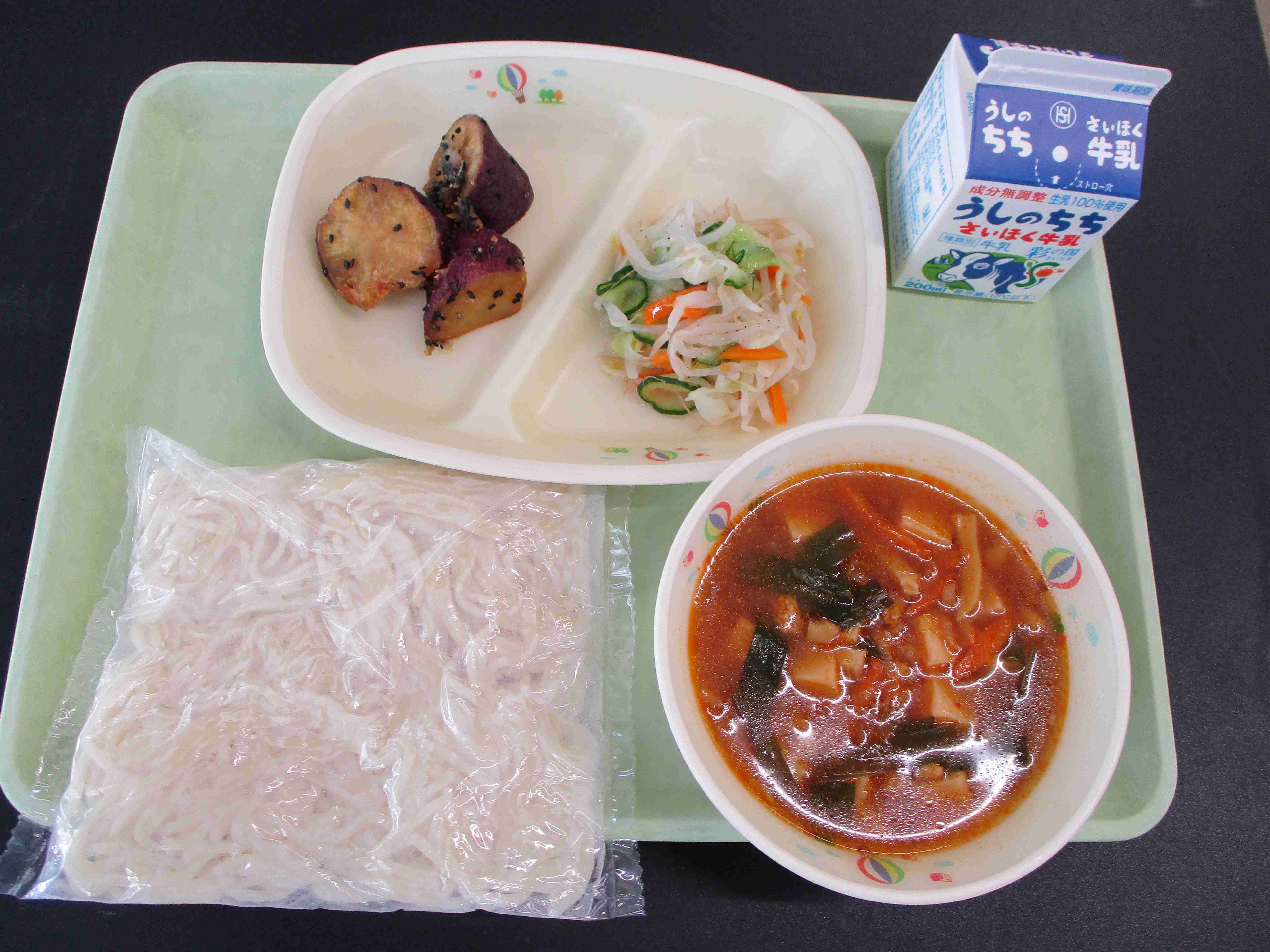 マーボーラーメン 牛乳 大学芋 もやしサラダ