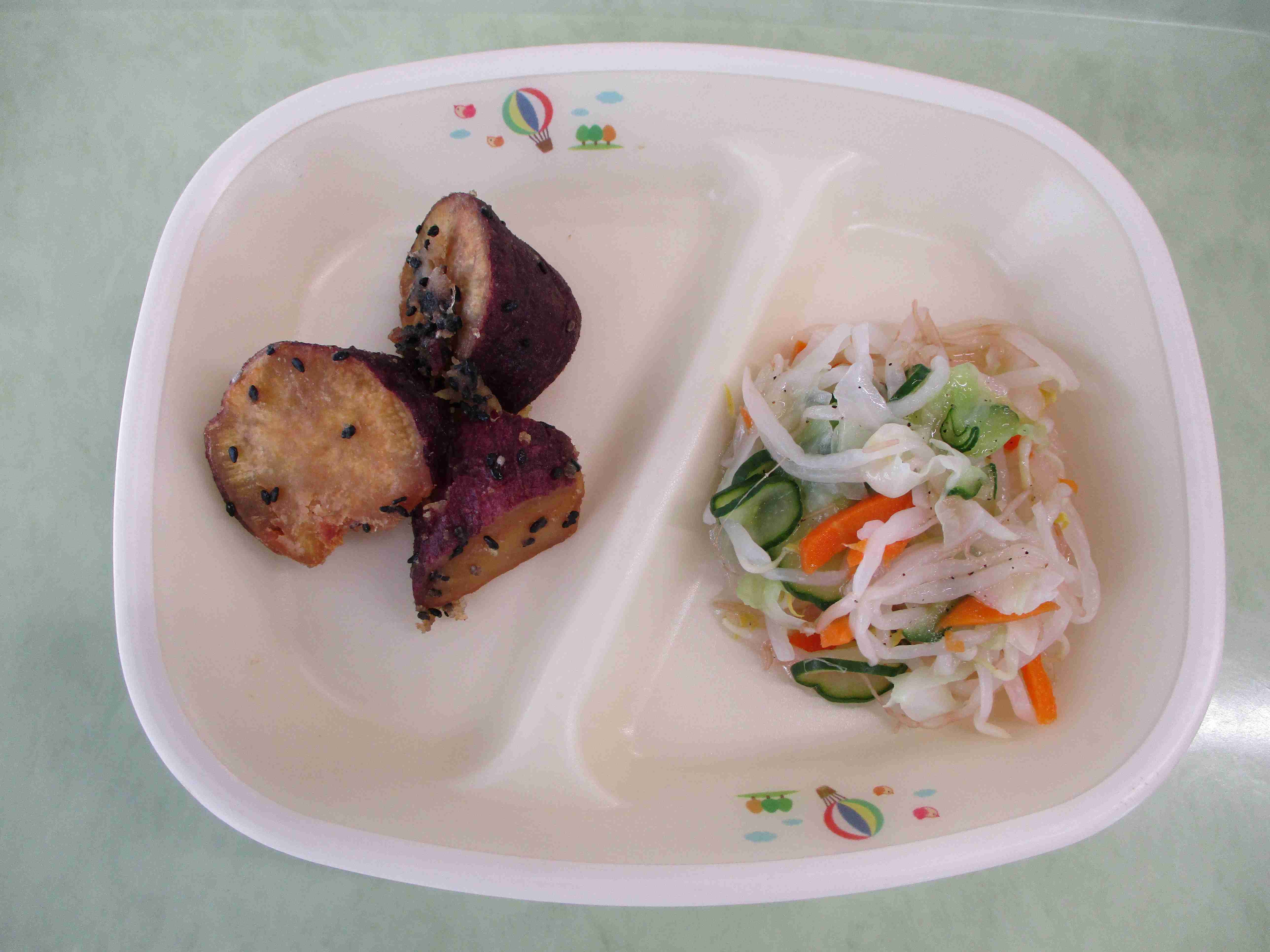 今日はさつまいものお話です。中央アメリカが原産で、コロンブスがヨーロッパに持ち帰り、世界中に広まりました。日本には17世紀の初めに沖縄に伝わり、その後薩摩藩を中心とした南九州地方に広まりました。さつまいもの名前は薩摩藩で栽培が盛んだったことからきています。私たちのエネルギーになるでんぷんが豊富で、加熱すると甘味がます。食物繊維もたっぷりでおなかをきれいにしてくれます。今日は大学芋にしました。お味はいかがですか?