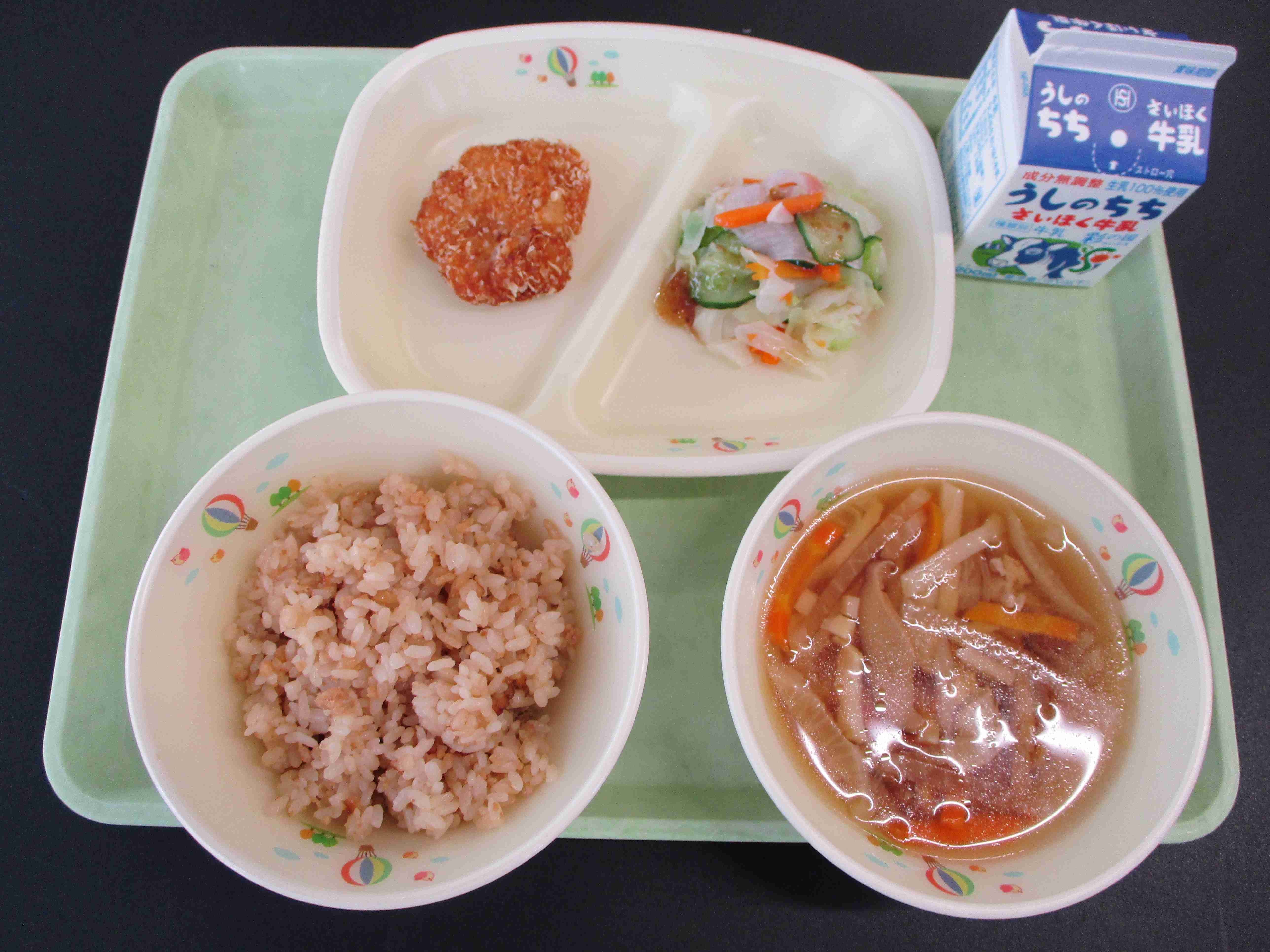 そぼろごはん 牛乳 ポテトとお米のささみカツ こんにゃくサラダ 沢煮碗