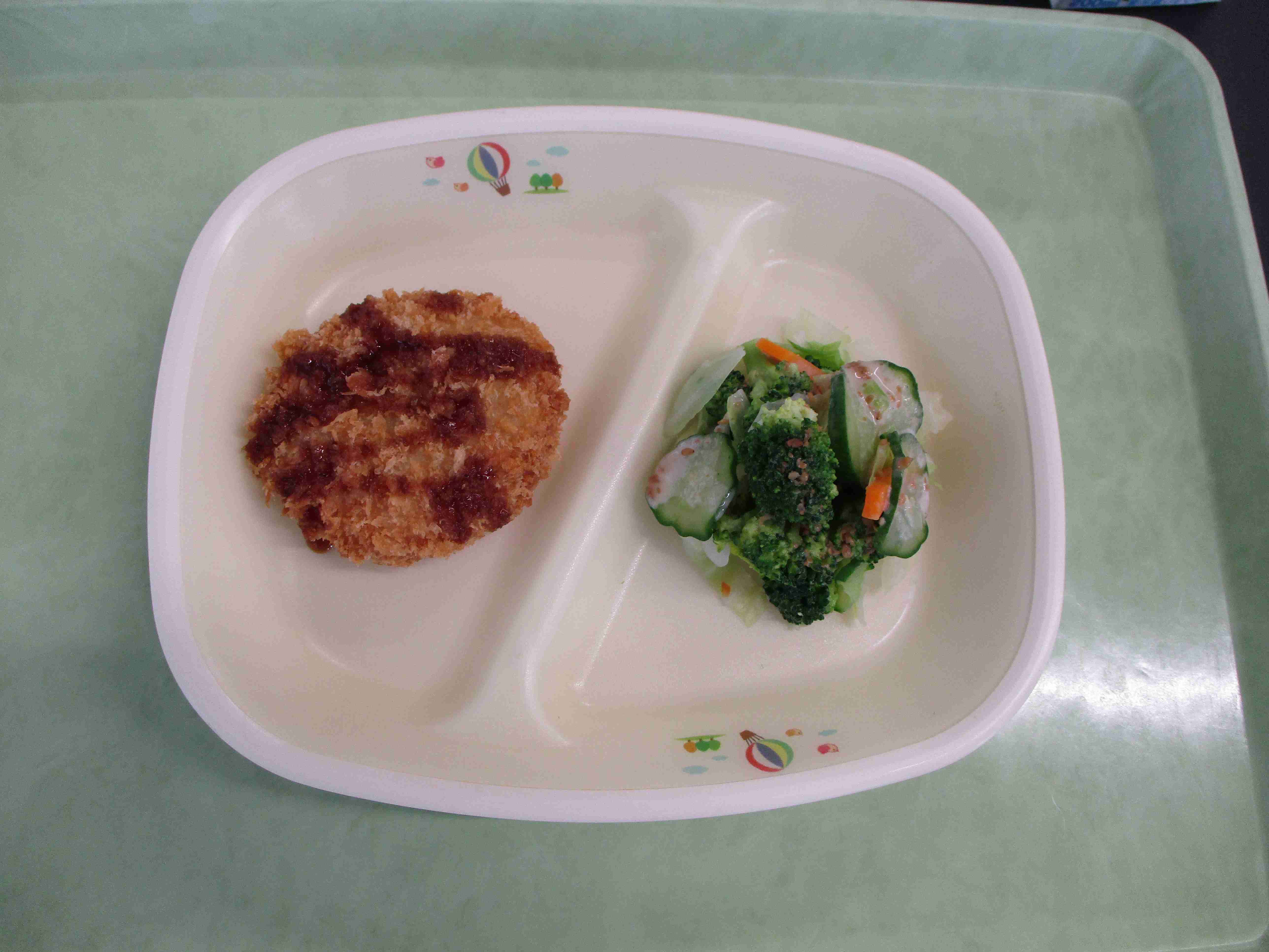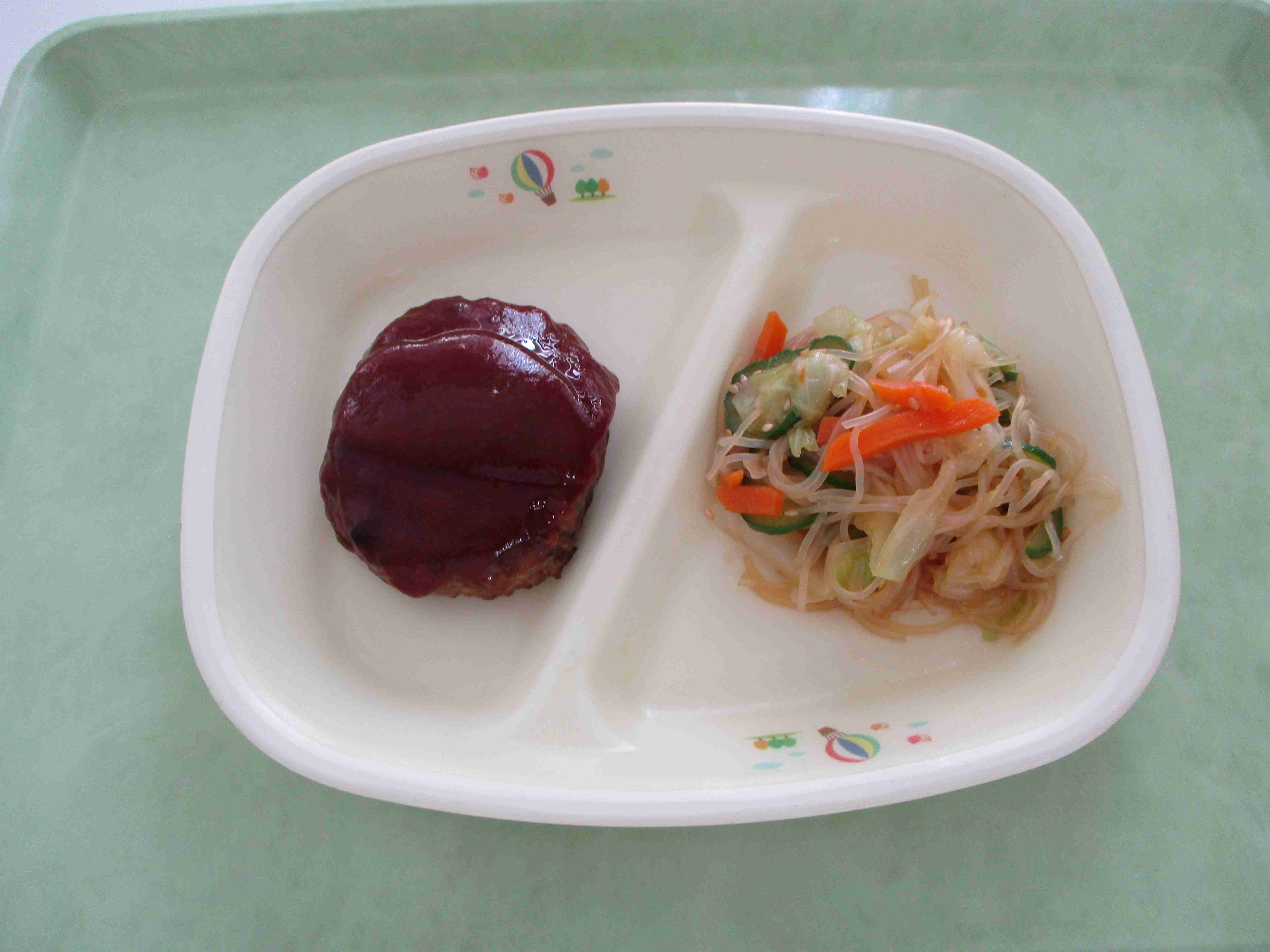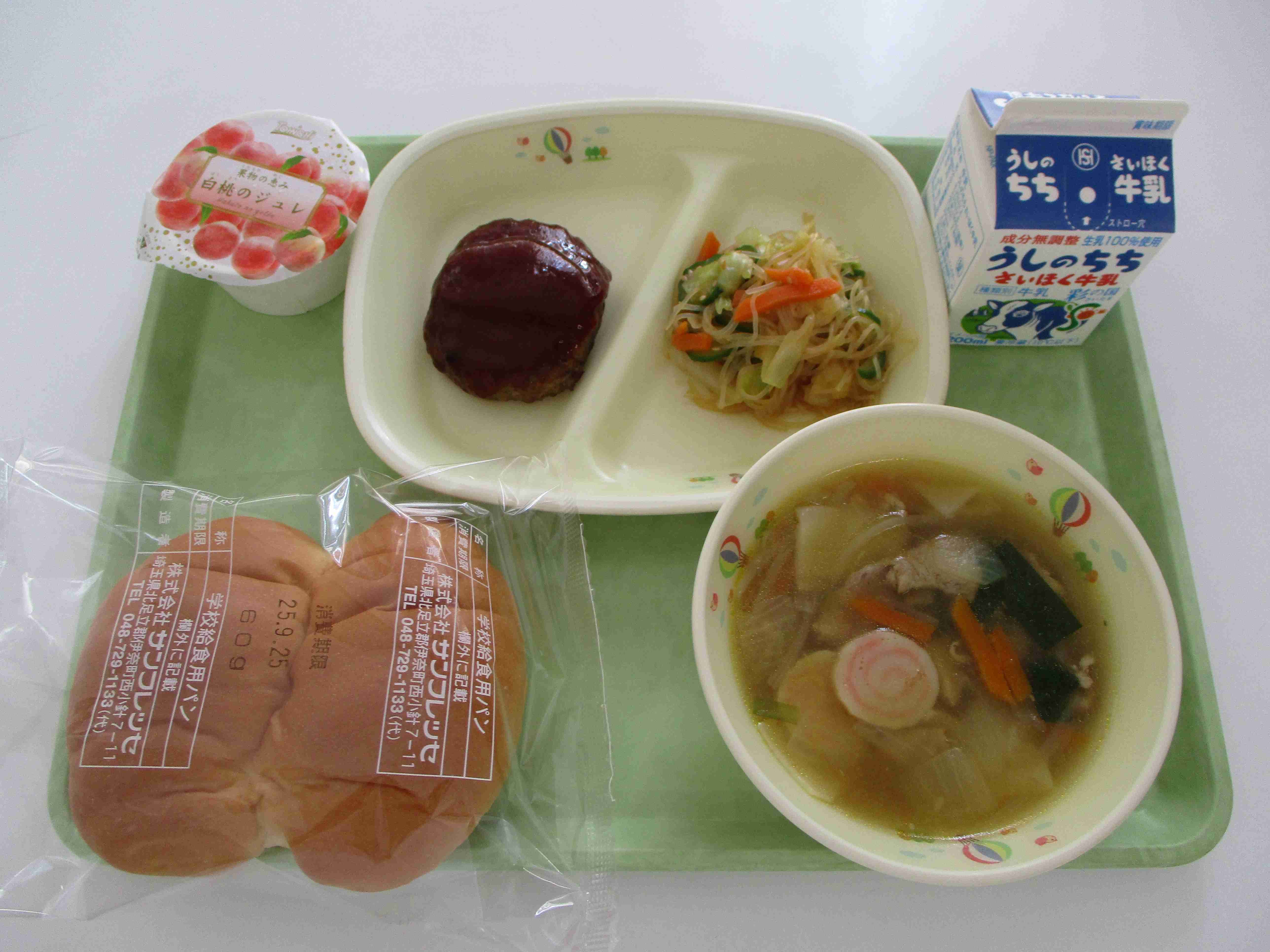 バターロール 牛乳 ハンバーグ 春雨サラダ ワンタンスープ 白桃ジュレ