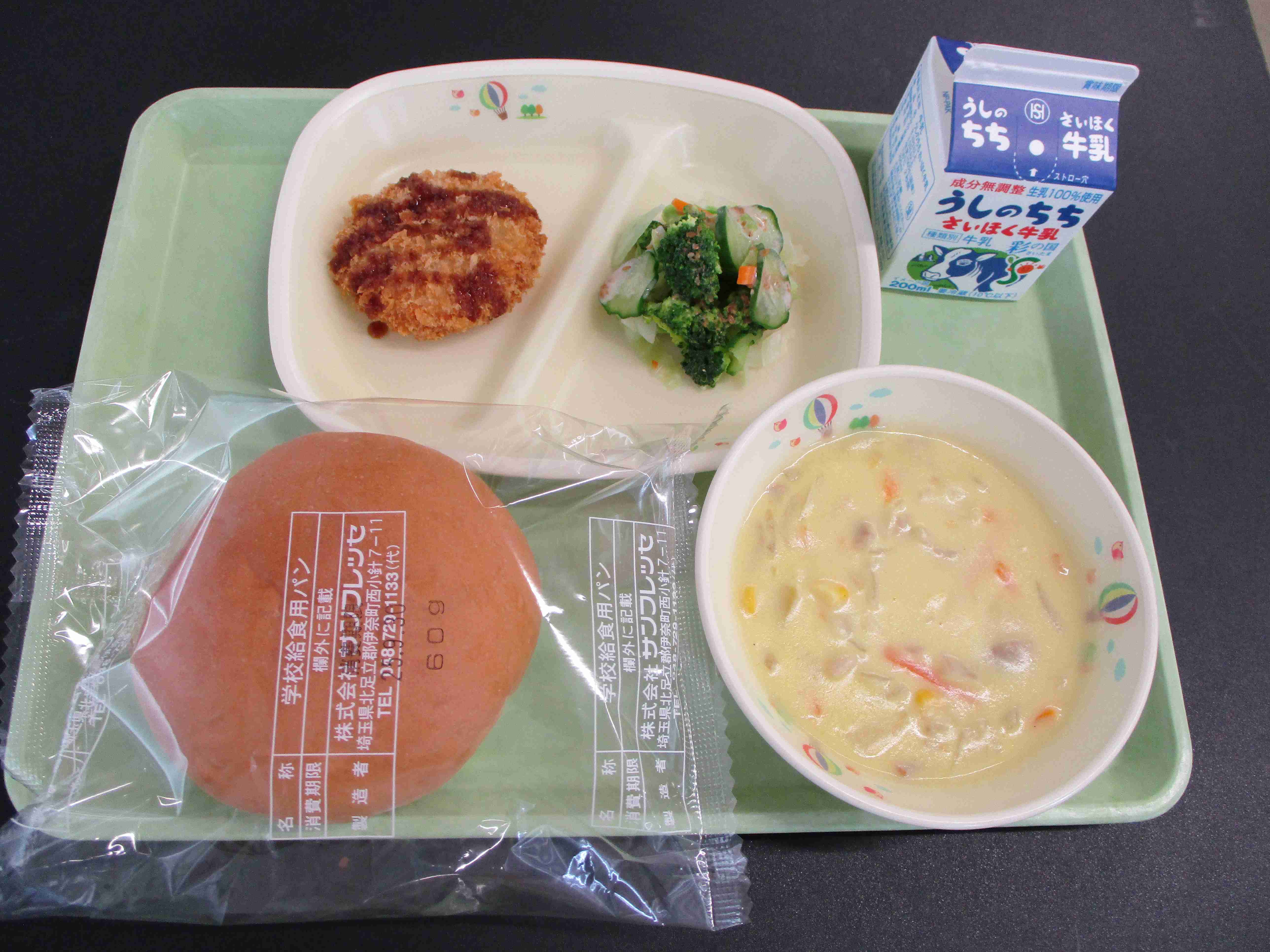 こどもパン 牛乳 えびカツ グリーンサラダ コーンスープ