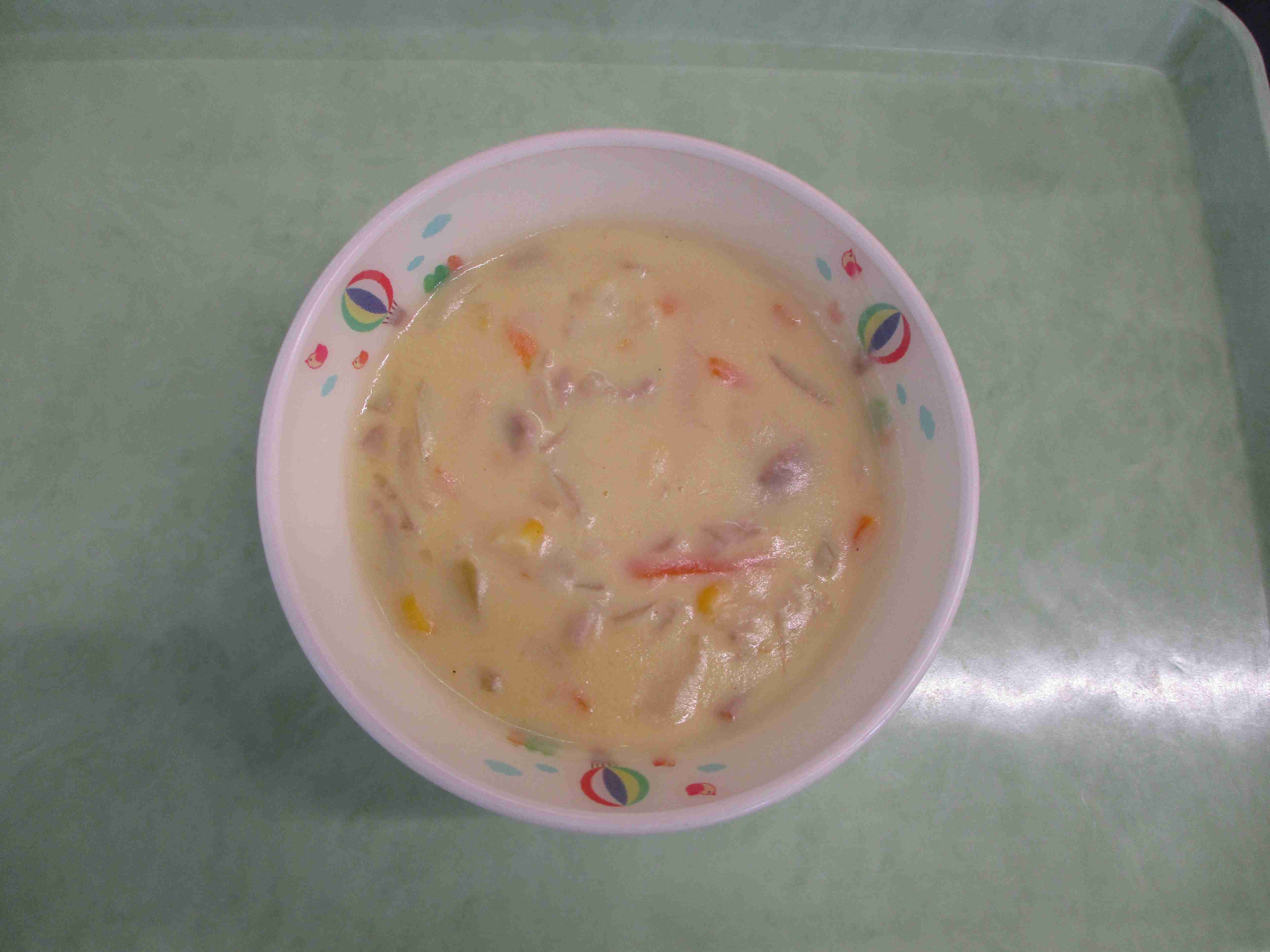 今日は玉ねぎのお話です。玉ねぎには、甘いものと辛いものがあります。日本で食べられている玉ねぎはほとんどが辛い種類のものですが、欧米では甘い種類の玉ねぎが多いそうです。玉ねぎを切ると涙が出ますが、これは硫化アリルという刺激成分のせいで、この刺激成分は加熱すると一部が分解されて甘くなります。ですから、辛い玉ねぎもよく炒めて料理に使えば、甘味がでてまた違ったおいしさになります。今日はコーンスープです。お味はいかがですか?