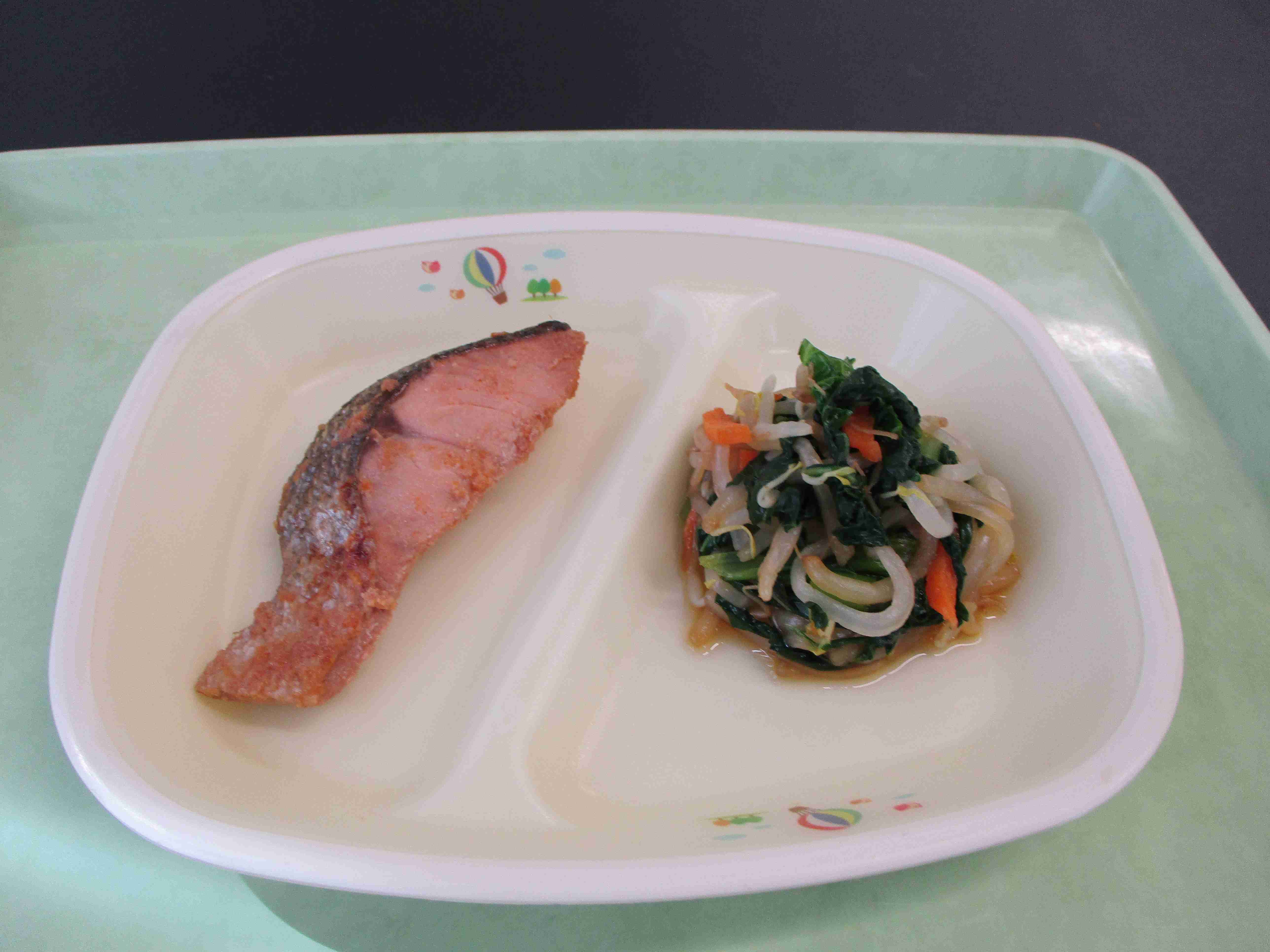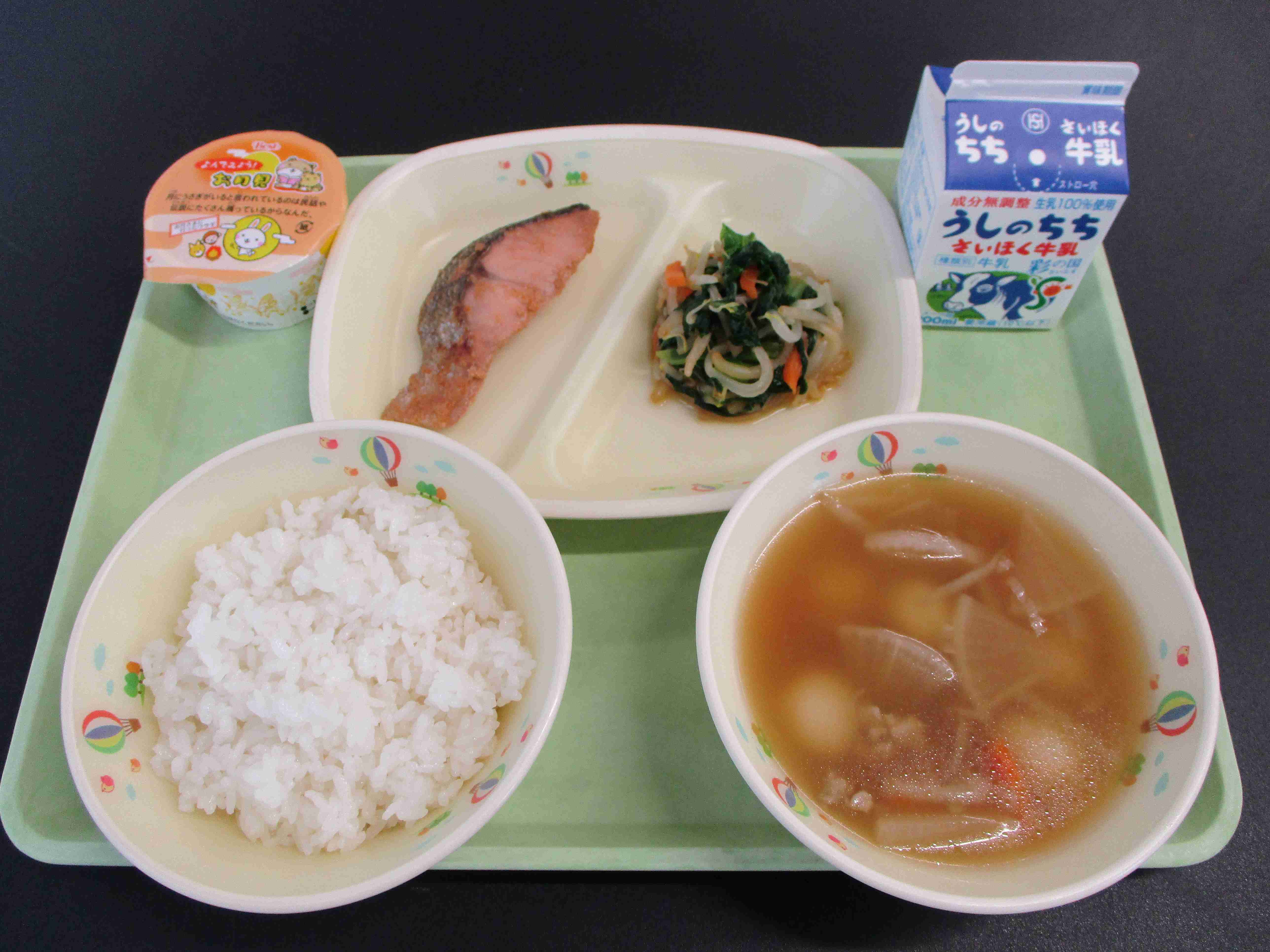 ごはん 牛乳 鮭の紅葉焼き おひたし だんご汁 お月見デザート