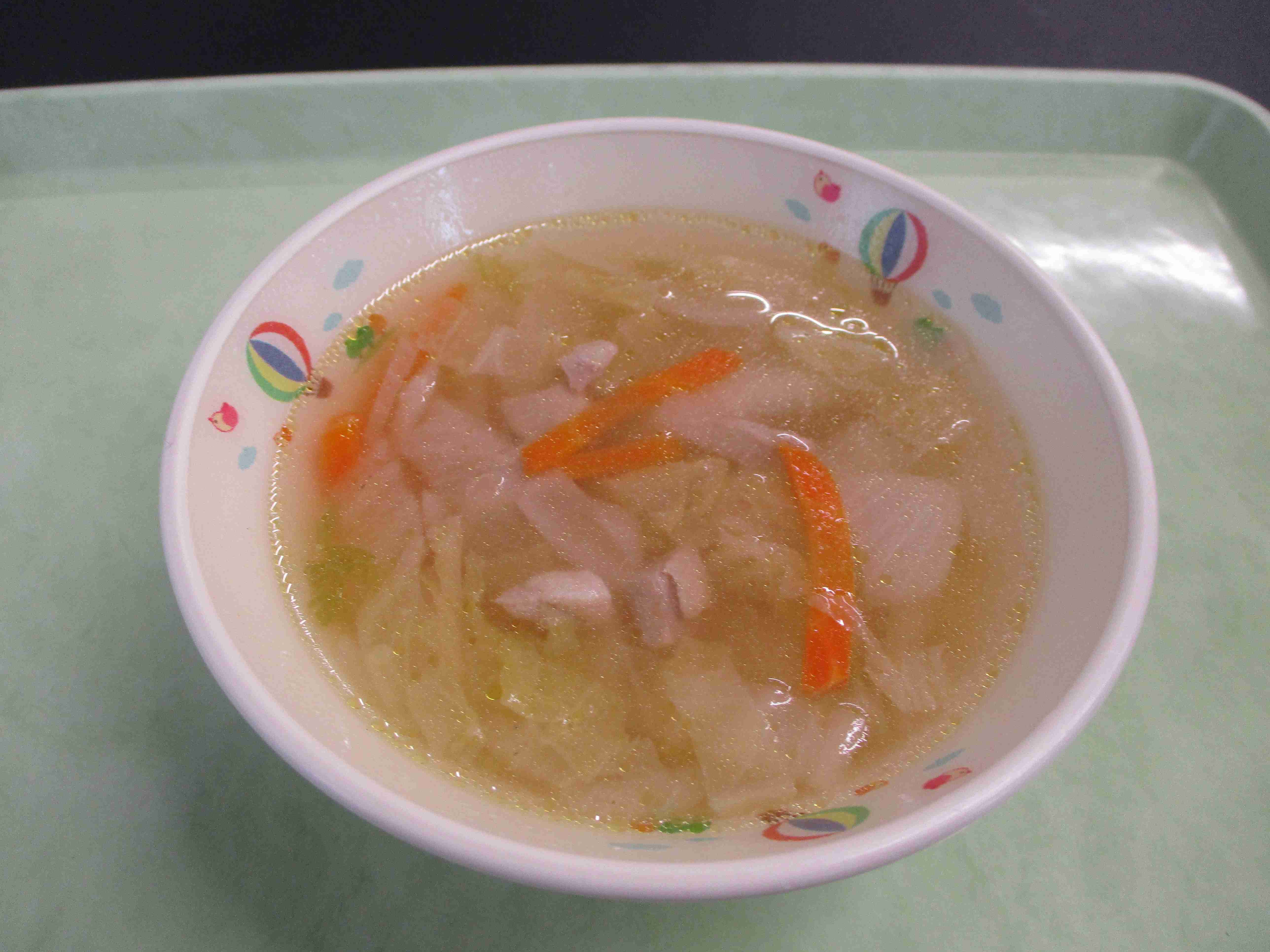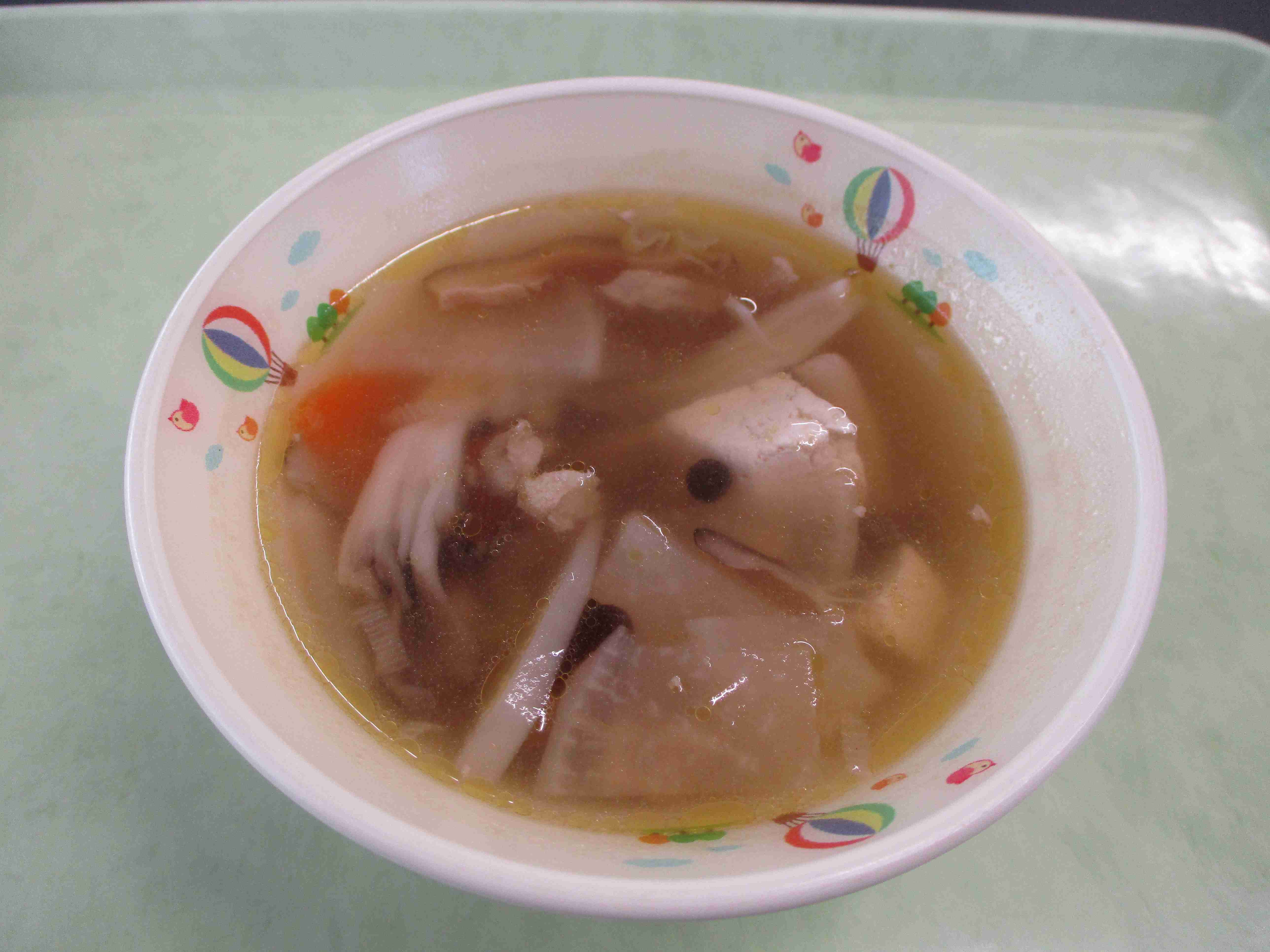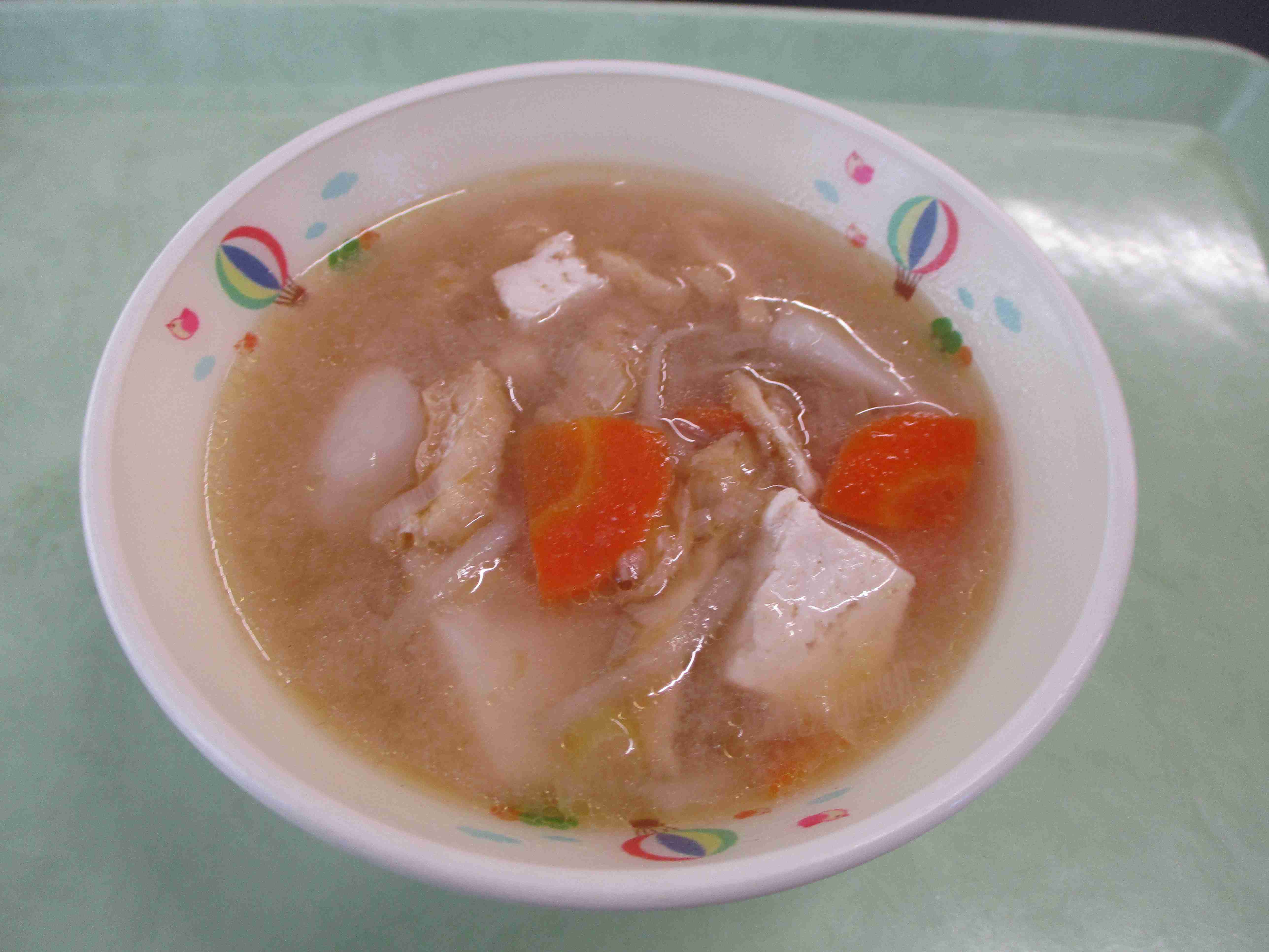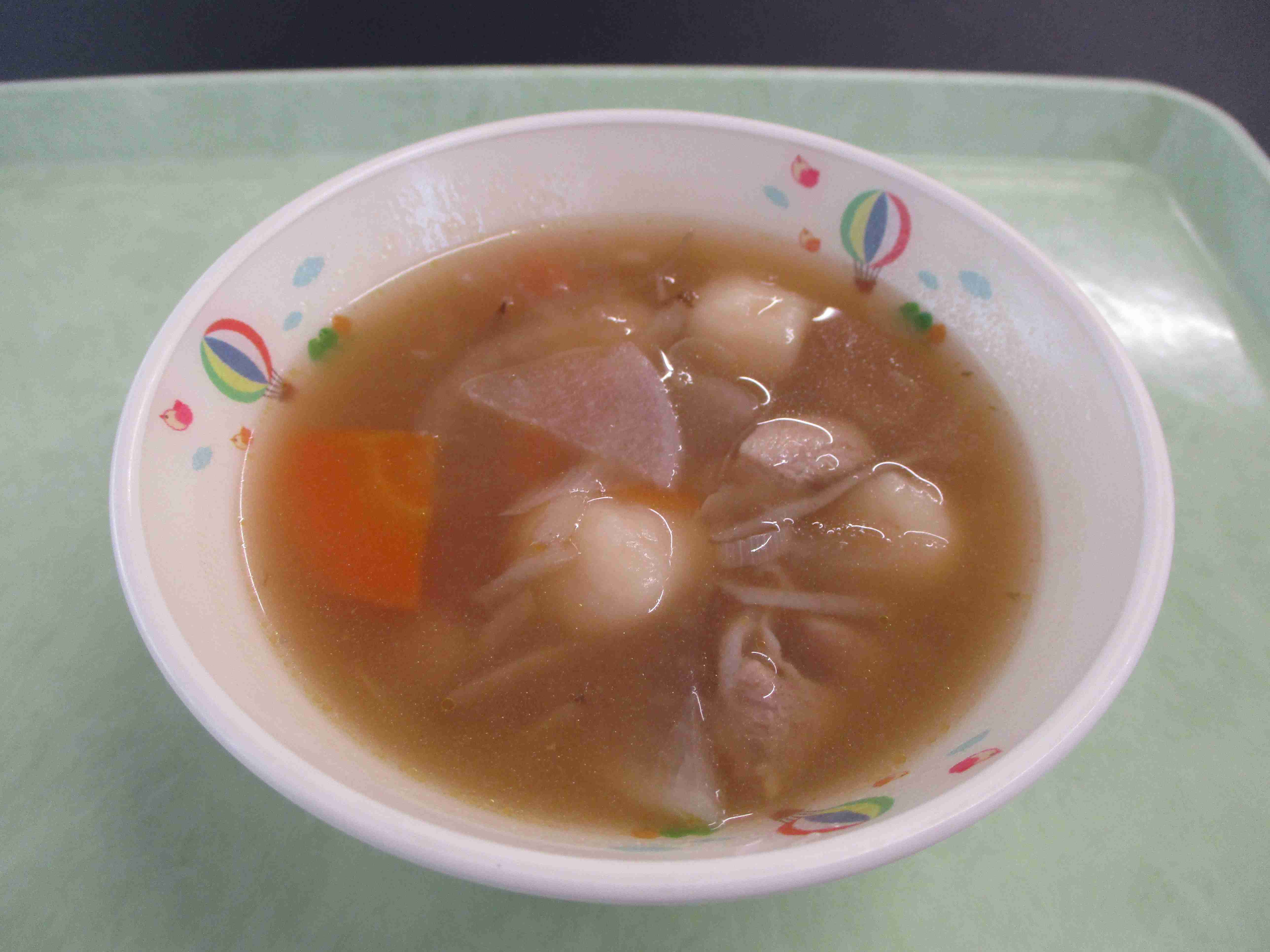 今日はのっぺい汁のお話です。のっぺい汁は、新潟県や奈良県、島根県など全国各地に伝わる郷土料理で、鶏肉やにんじん、里芋、しいたけなど季節の野菜をだし汁で煮て、醤油や塩であじを調え片栗粉でとろみをつけた汁物です。お祭りやお正月などに作られることが多い料理です。地域によってのっぺい汁、のっぺ、のっぺ汁などいろいろな呼び方をします。また、材料の組み合わせや切り方なども少しずつ違っています。味わって食べてください。
