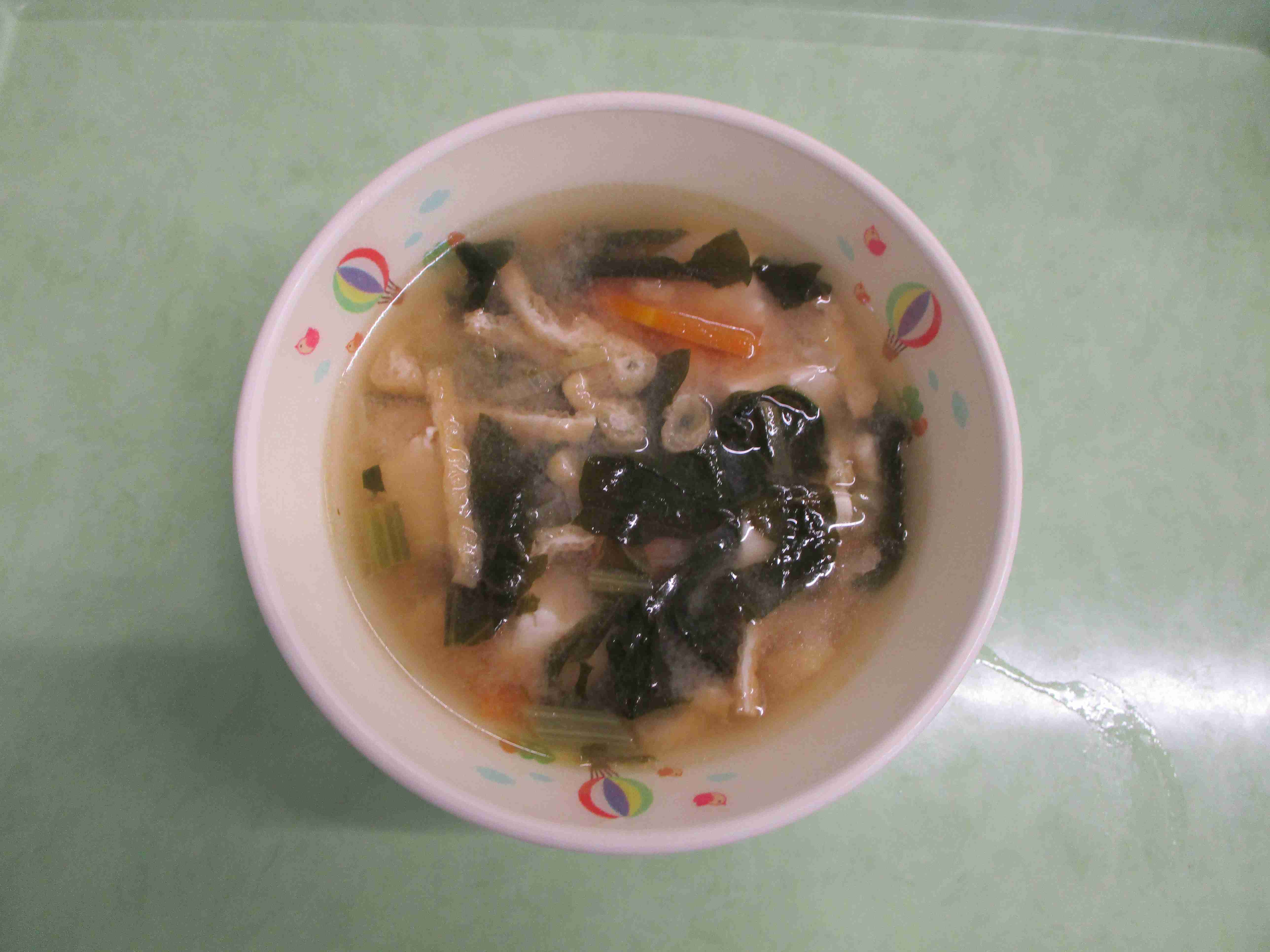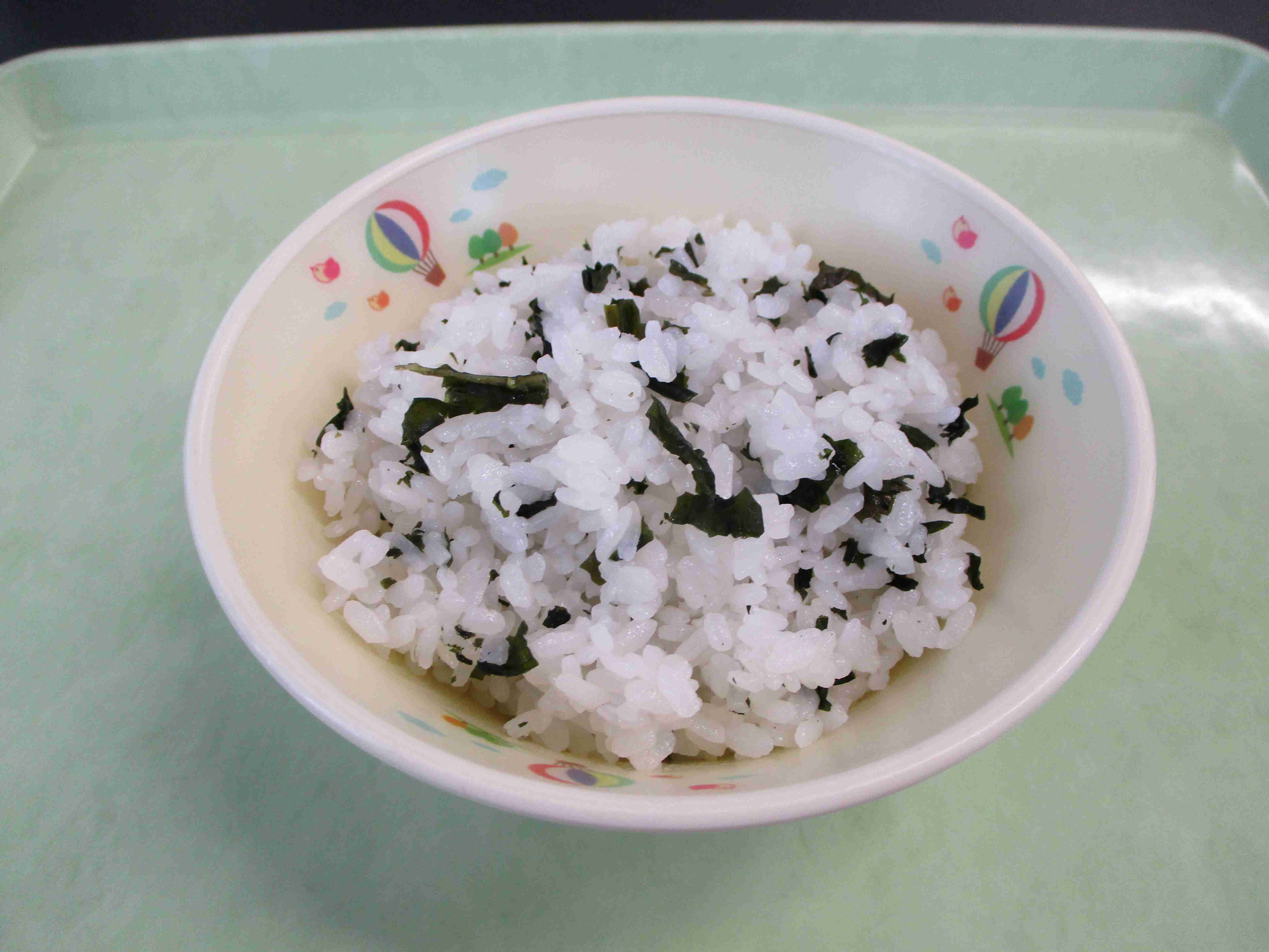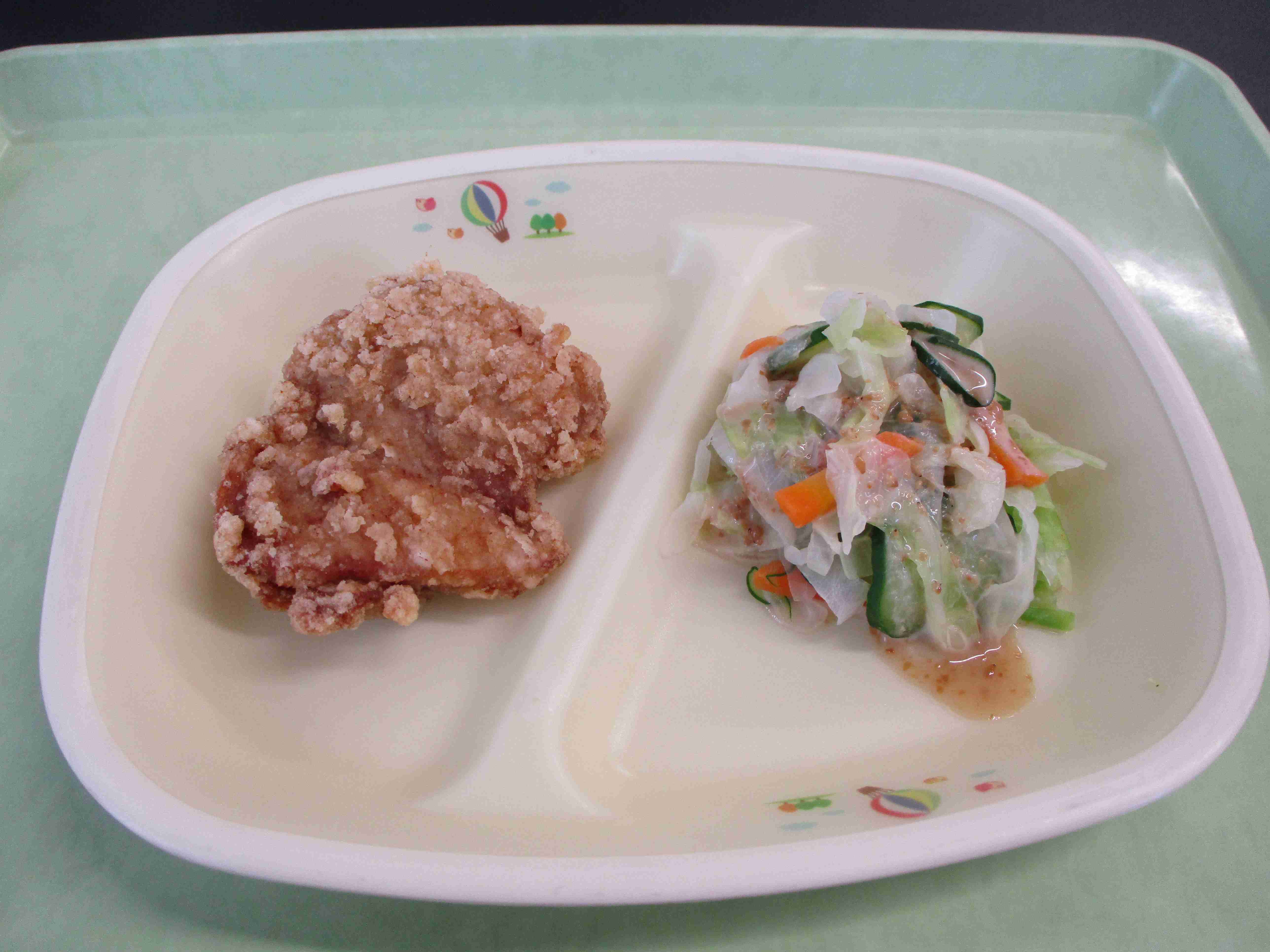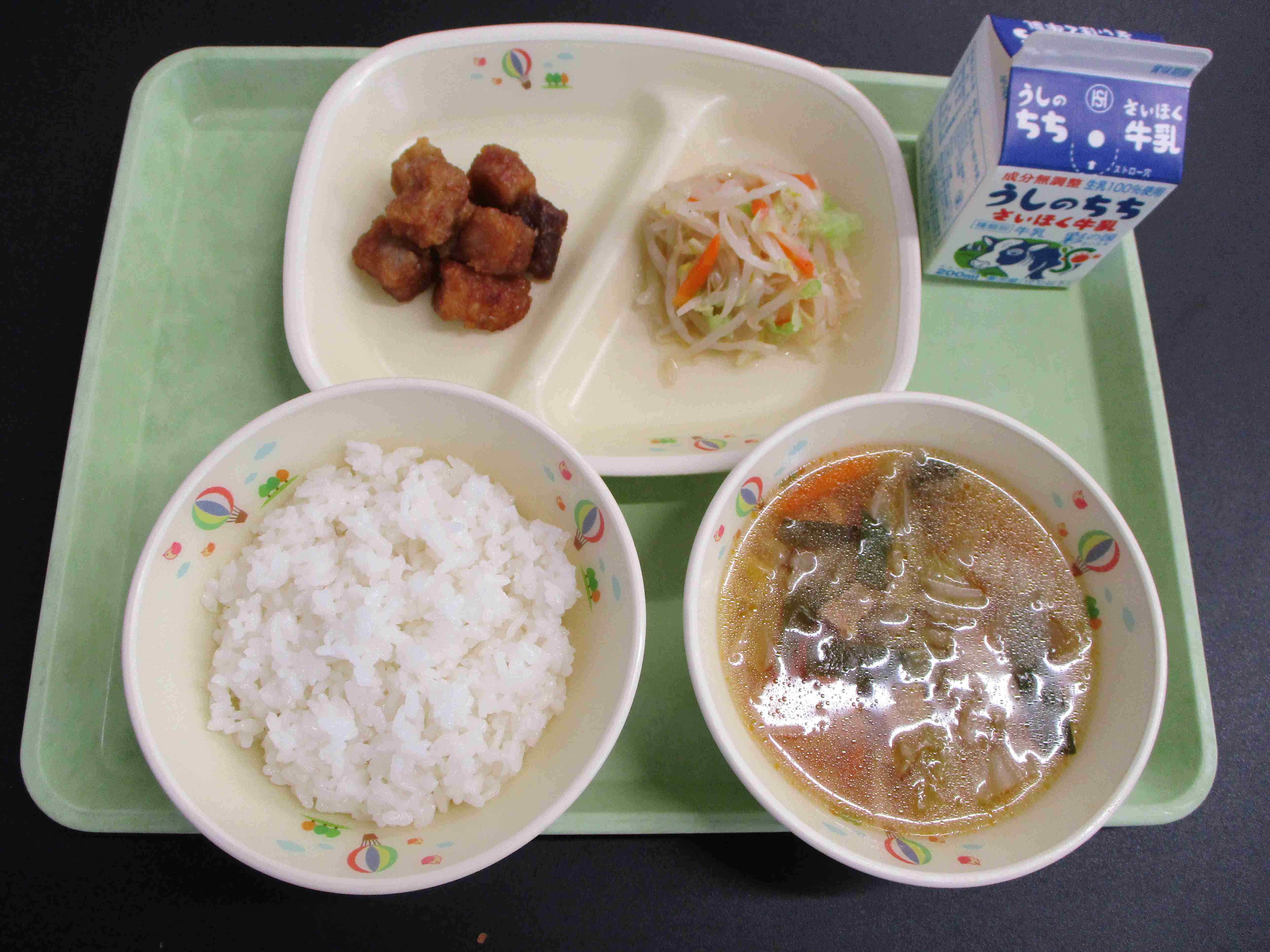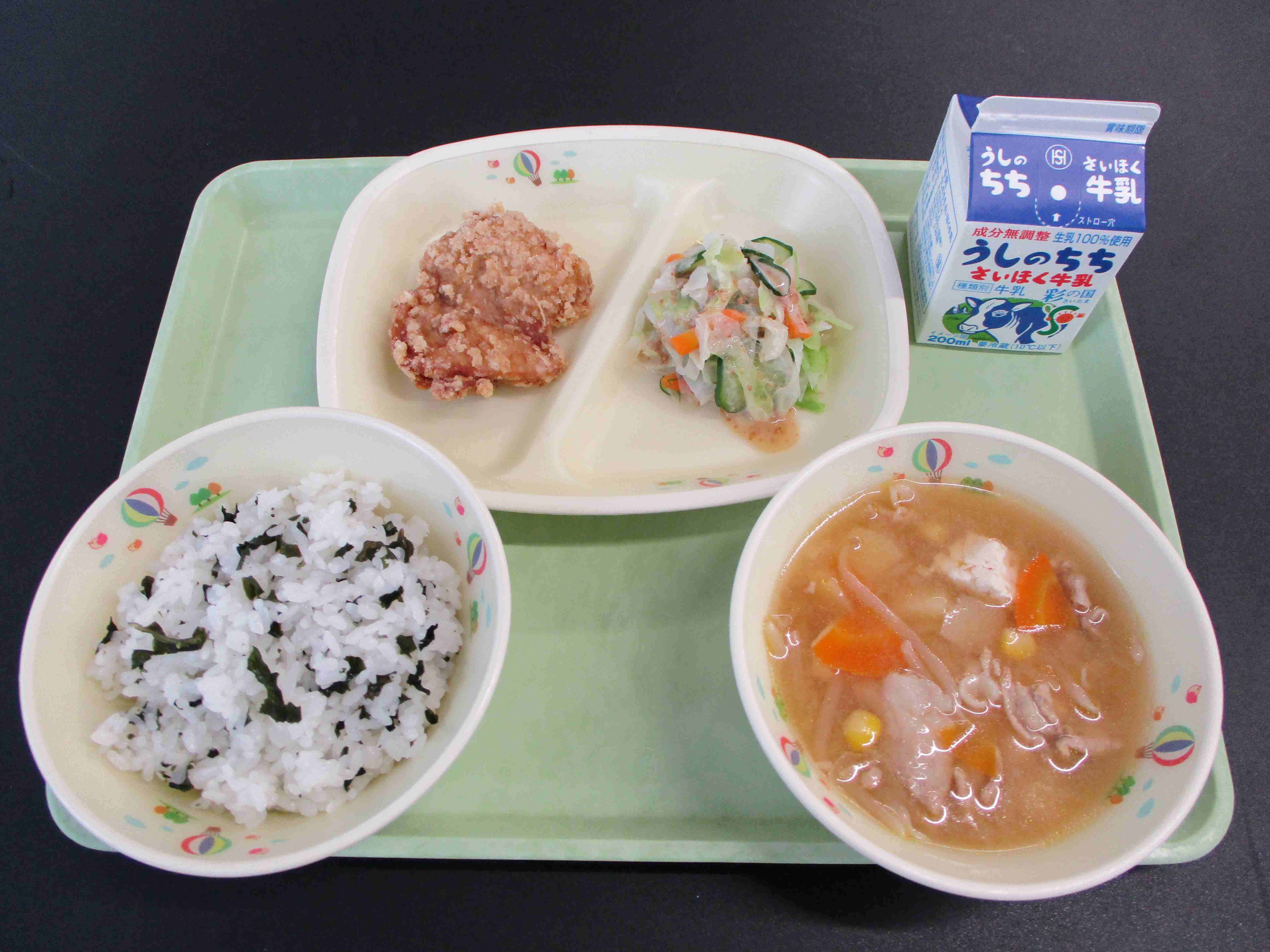 わかめごはん 牛乳 鶏のから揚げ キャベツのサラダ どさんこ汁