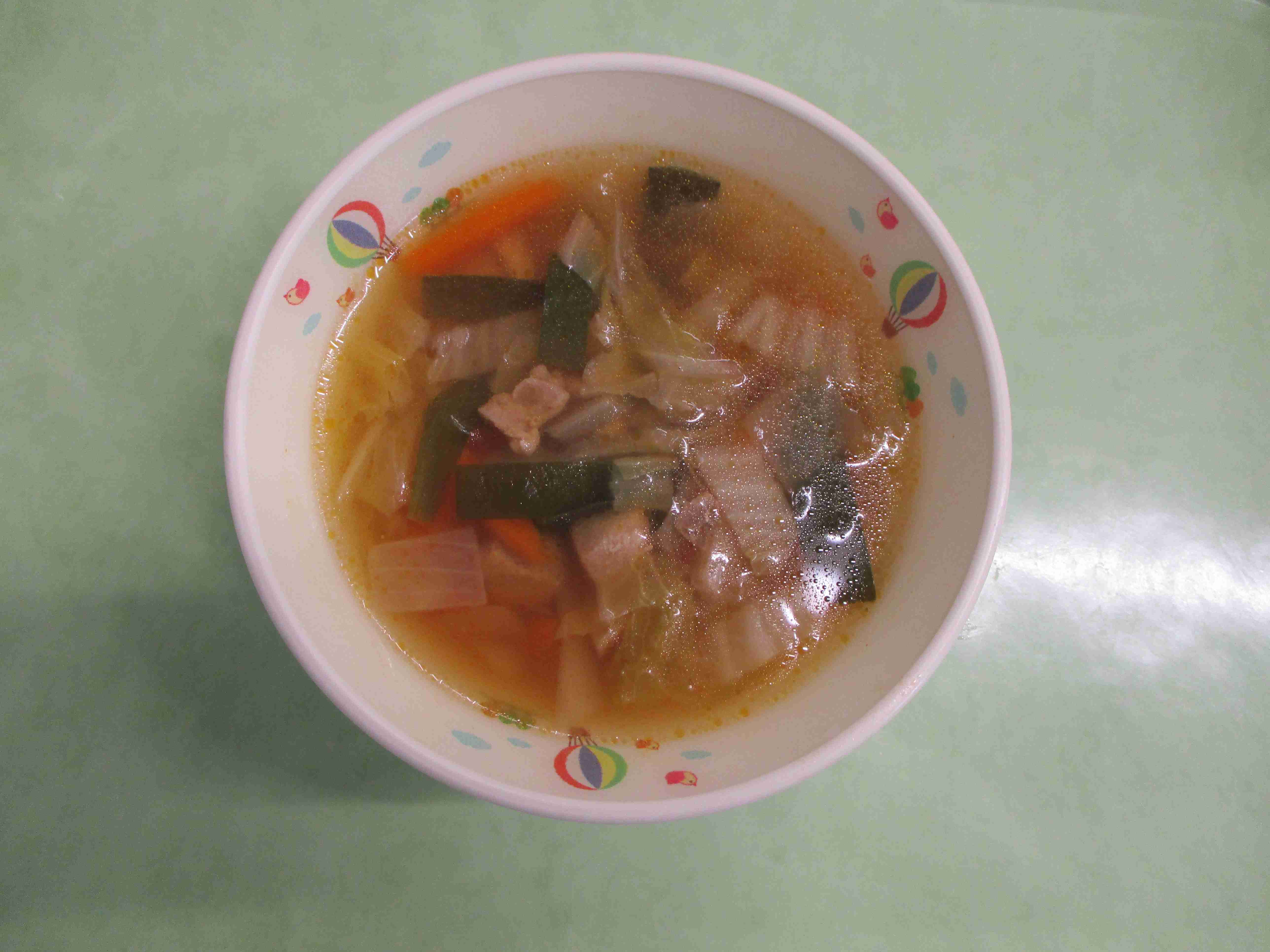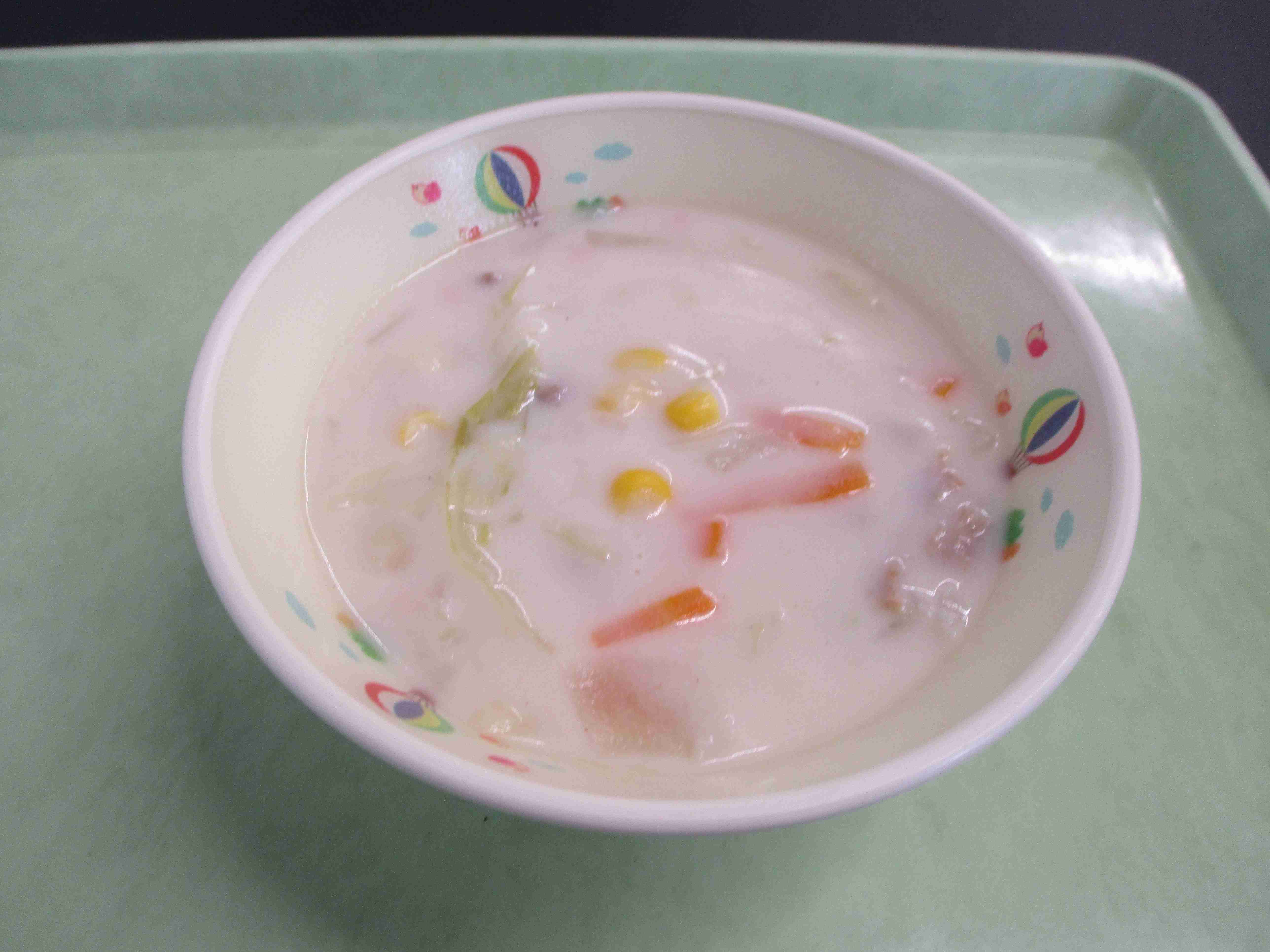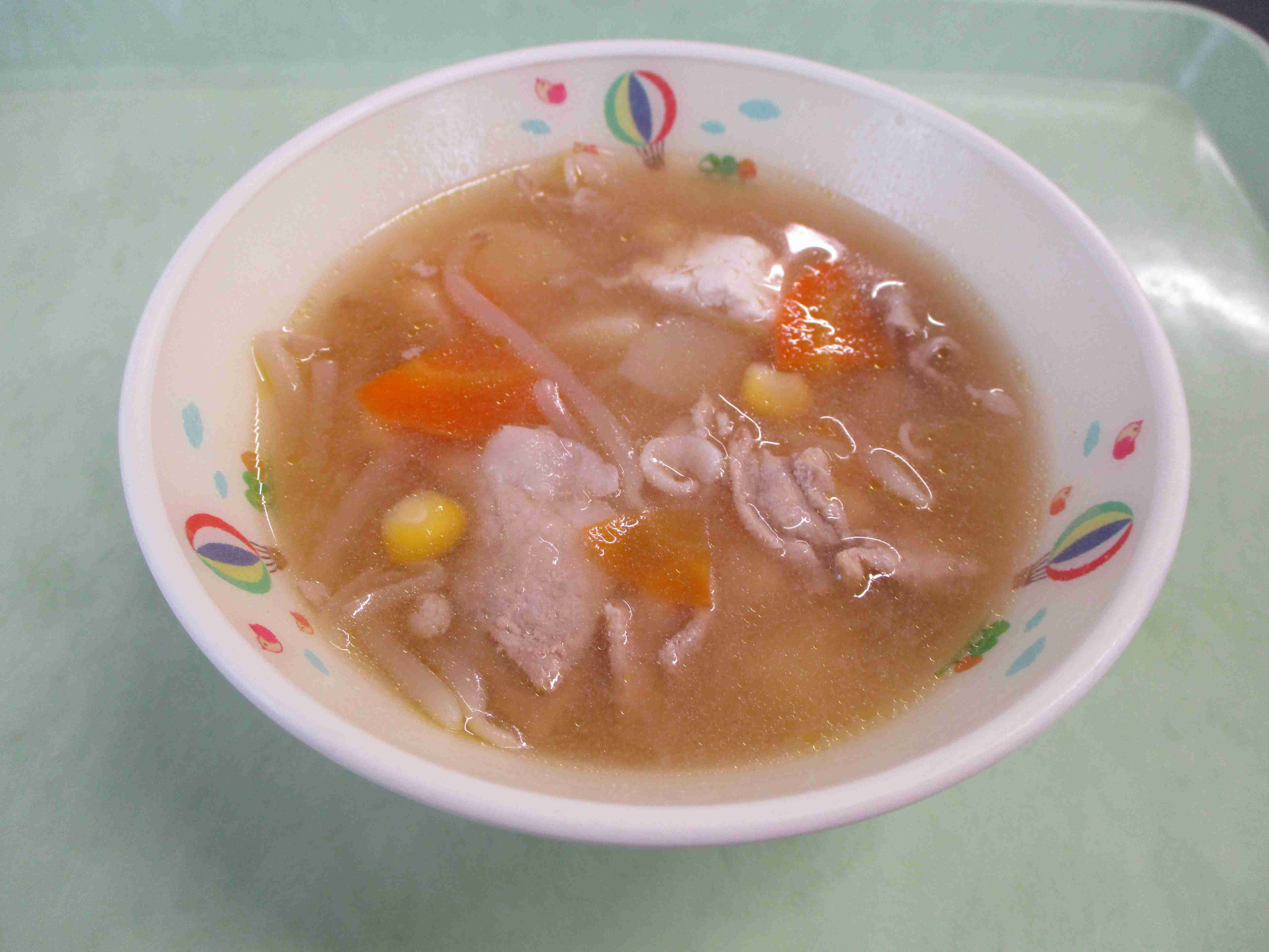 今日はどさんこ汁のお話です。どさんこ汁は北海道生まれの食材を」使ったみそ汁です。北海道で収穫された「とうもろこし」や「じゃがいも」などが入っています。その他にもぶた肉やにんじん、もやし、豆腐などが入っているので栄養満点です。かぜの予防にもなりますので、たくさん食べて元気に過ごしましょう。