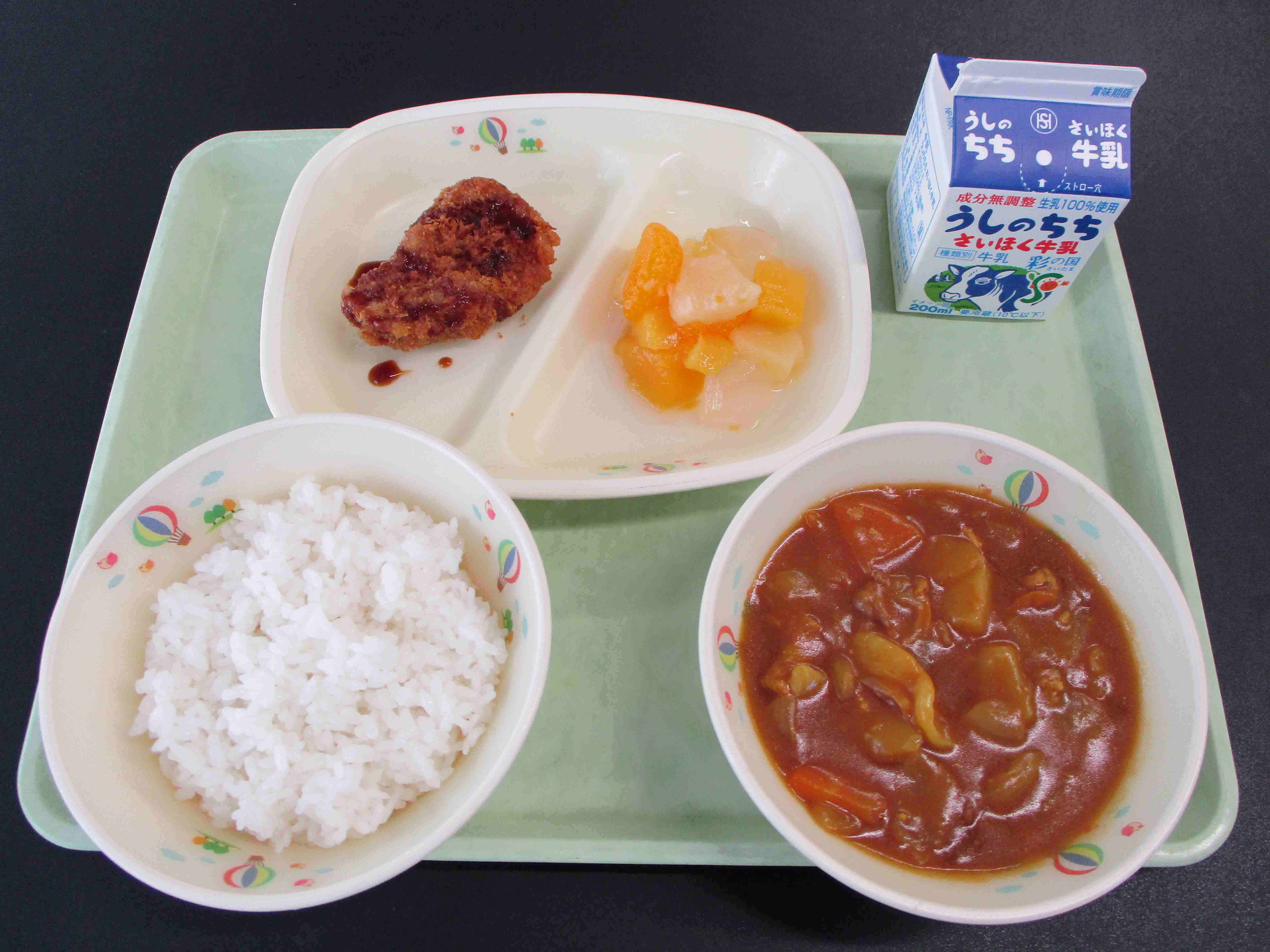 ごはん 牛乳 ピーマンの肉詰めフライ カレー フルーツカクテル