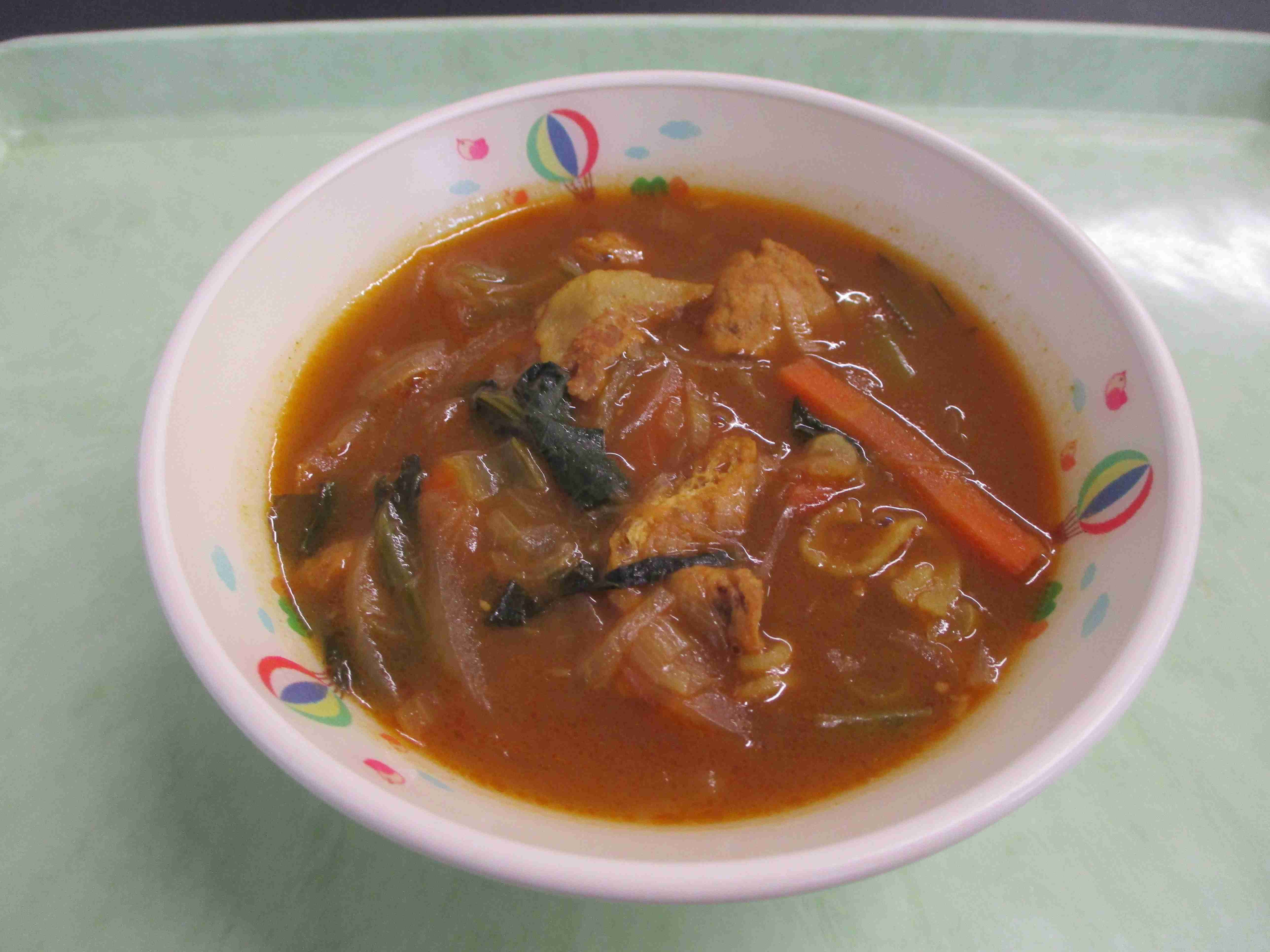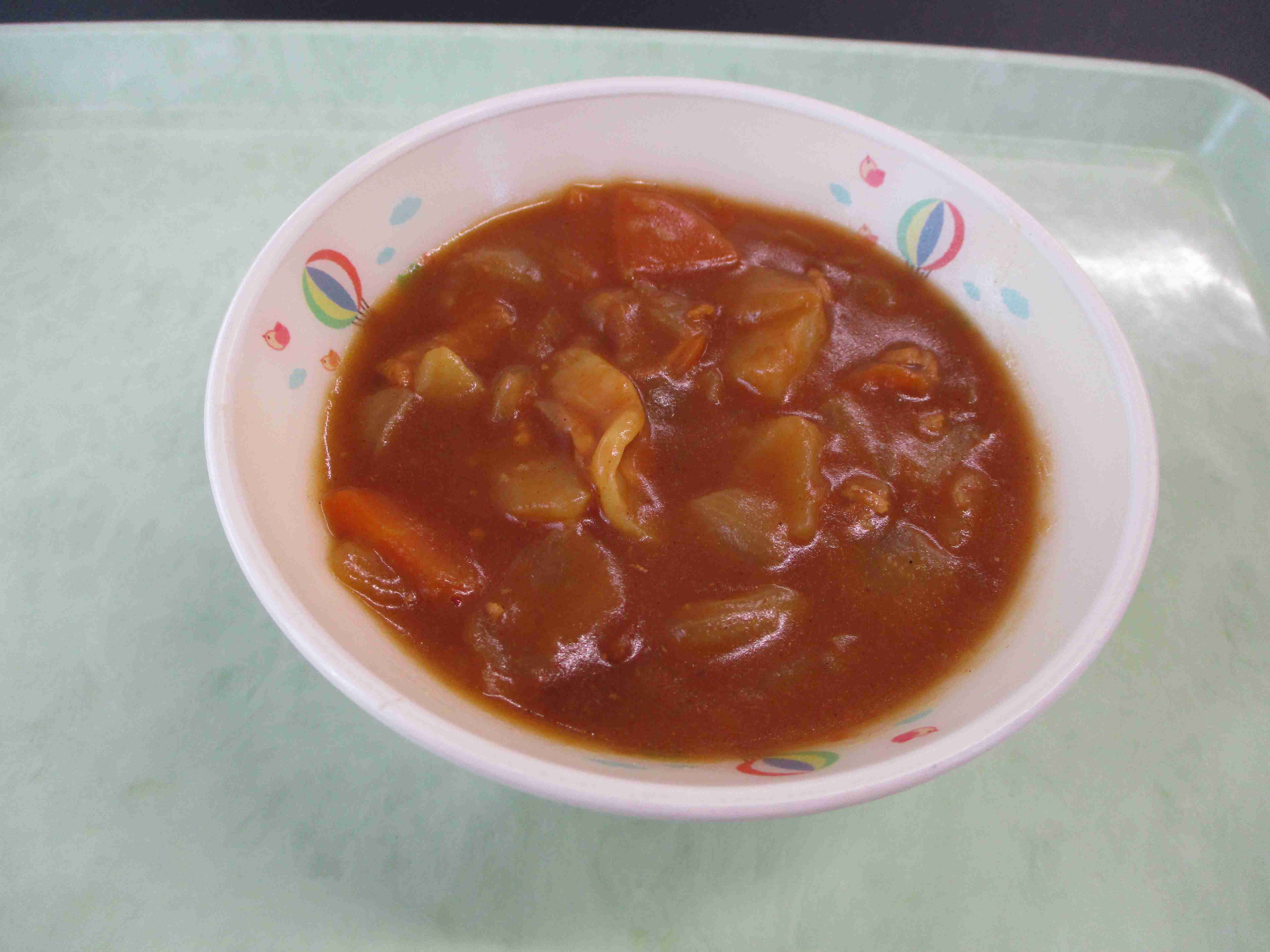 今日はカレーのお話です。カレーはどこの国の食べ物でしょうか?そう、インドですね。“カレー”という言葉は、インドの南の地方で使われているタミール語でソースという意味です。日本では、カレー粉やカレールーが売られていて、料理のときこれを使えば、おいしいカレーライスが食べられます。インドでは10種類以上のスパイスを混ぜて、最後にココナッツミルクを入れて仕上げるそうです。家庭ごとに使うスパイスの種類や量が違うので、同じ味のカレーはないそうです。給食のカレーのお味はいかがですか?