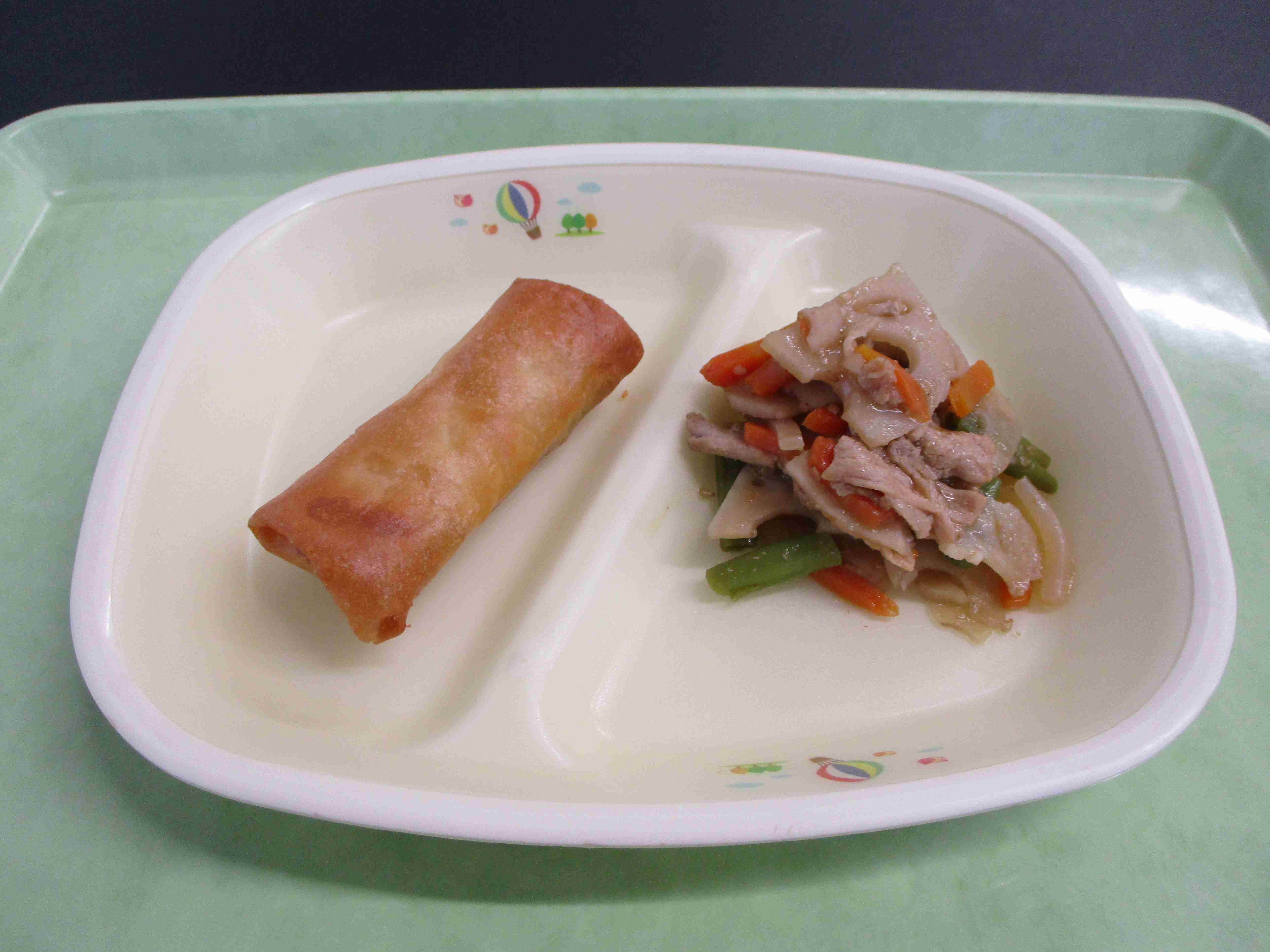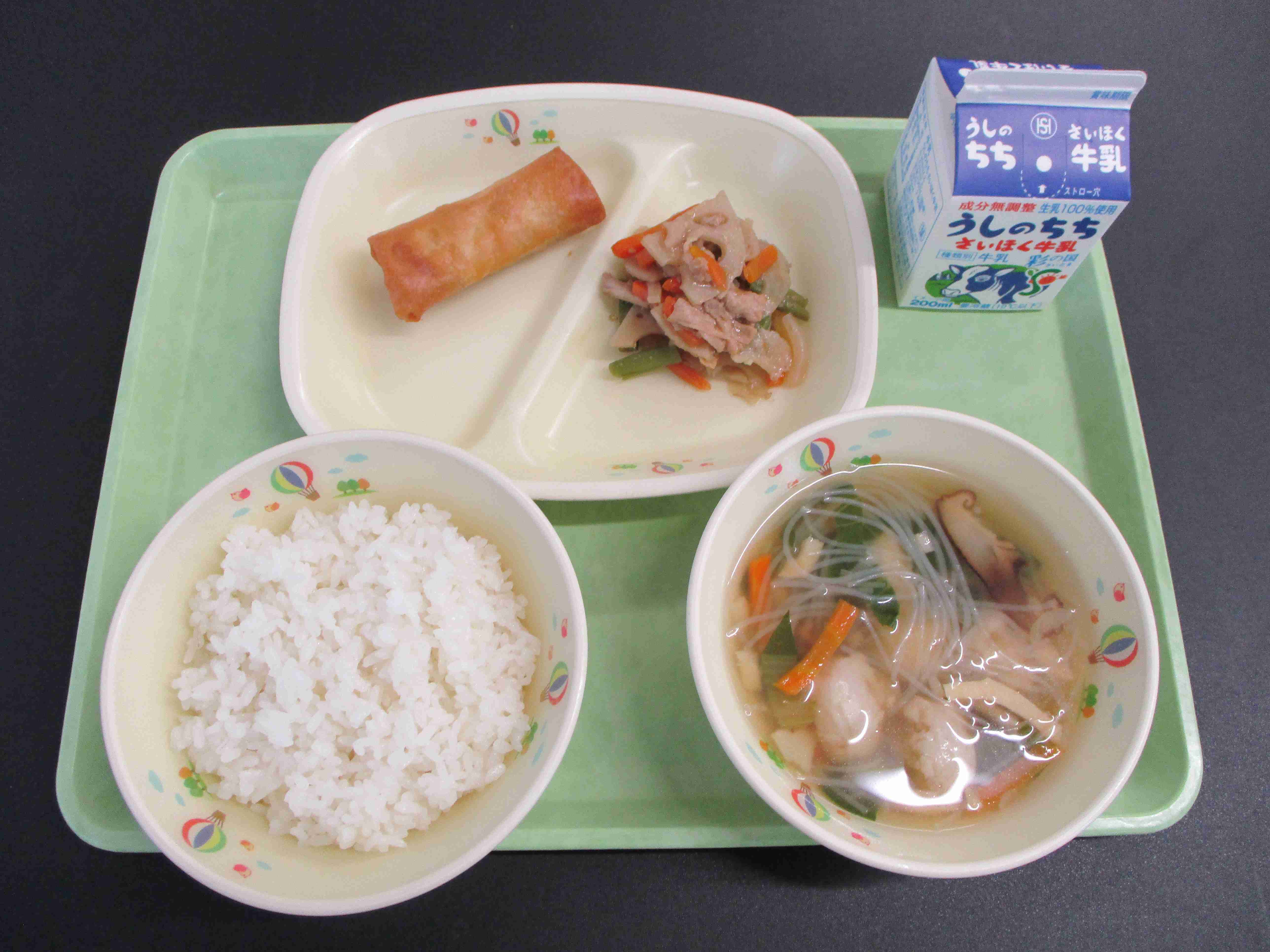 ごはん 牛乳 春巻き れんこんの炒めもの えび団子汁