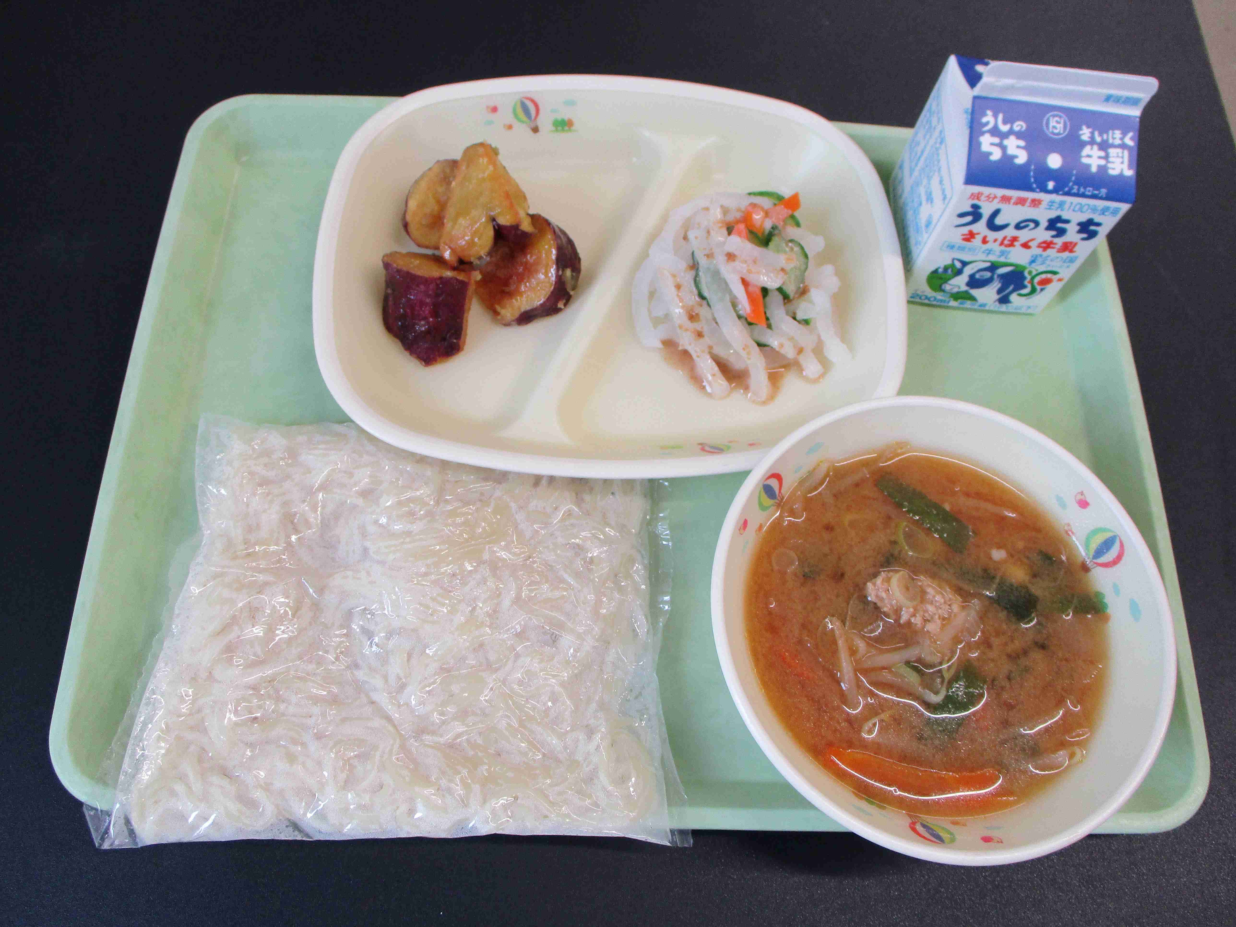 今日はうどんのお話です。給食のうどんは「さとのそら」という埼玉県産の小麦粉を100%使用して作られています。うどんは、ごはんやパンと同じエネルギーのもとになる食品です。給食では、主食としてごはん、パン、めんのいずれかが必ず出ます。うどんは、袋を開ける前に4つくらいに分けて、少しずつおわんに入れて食べてくださいね。よくかんで食べましょう。