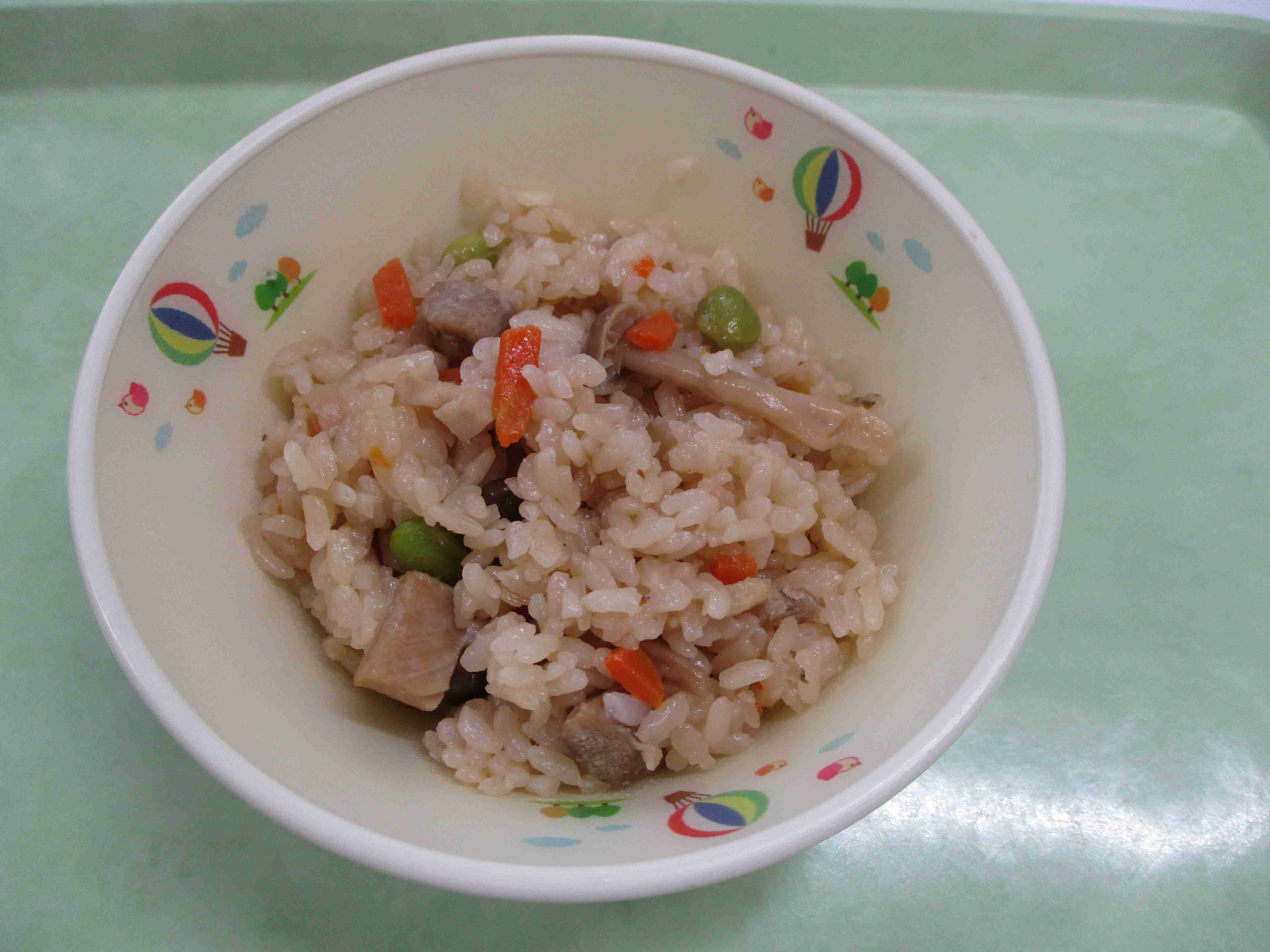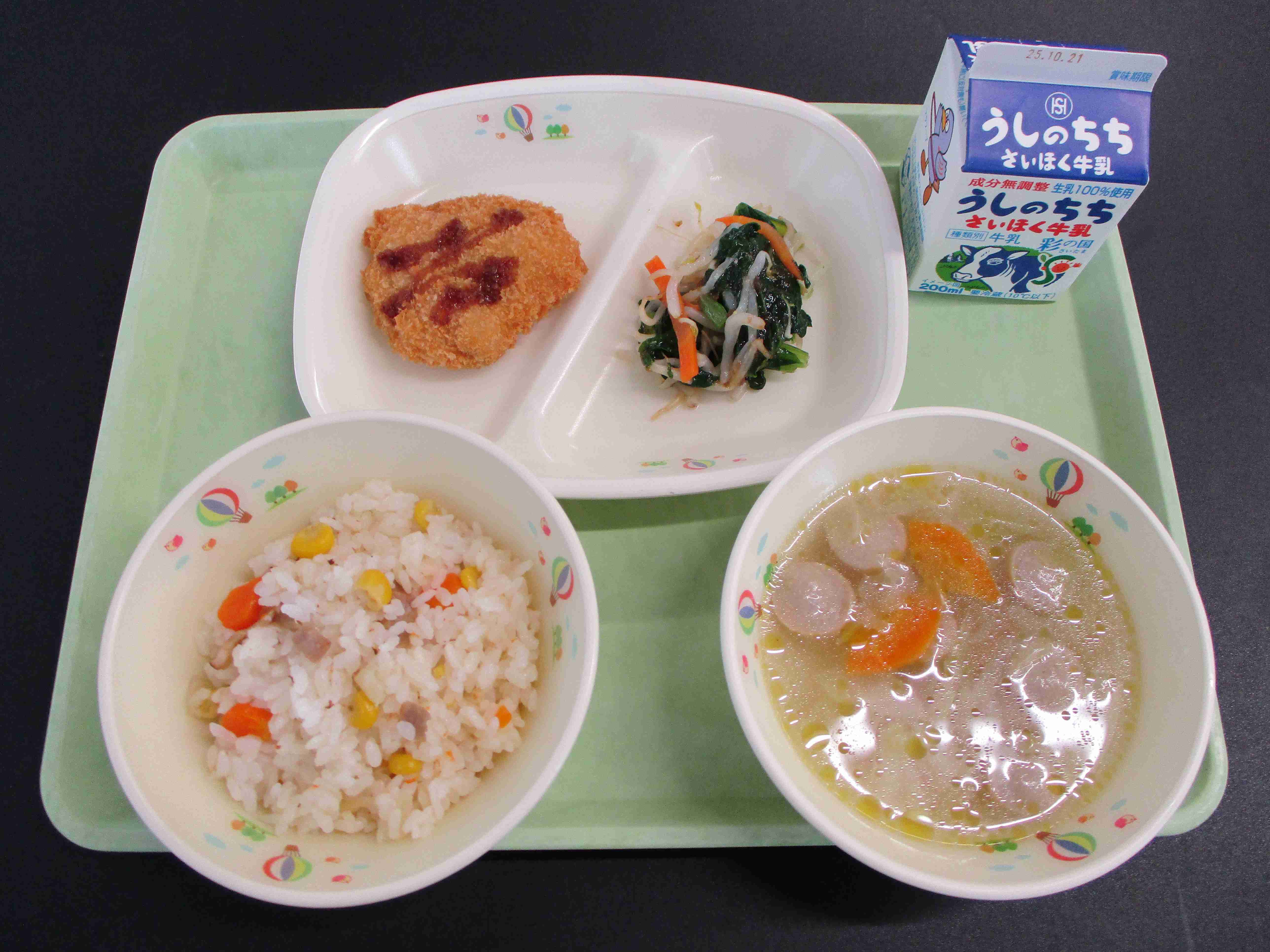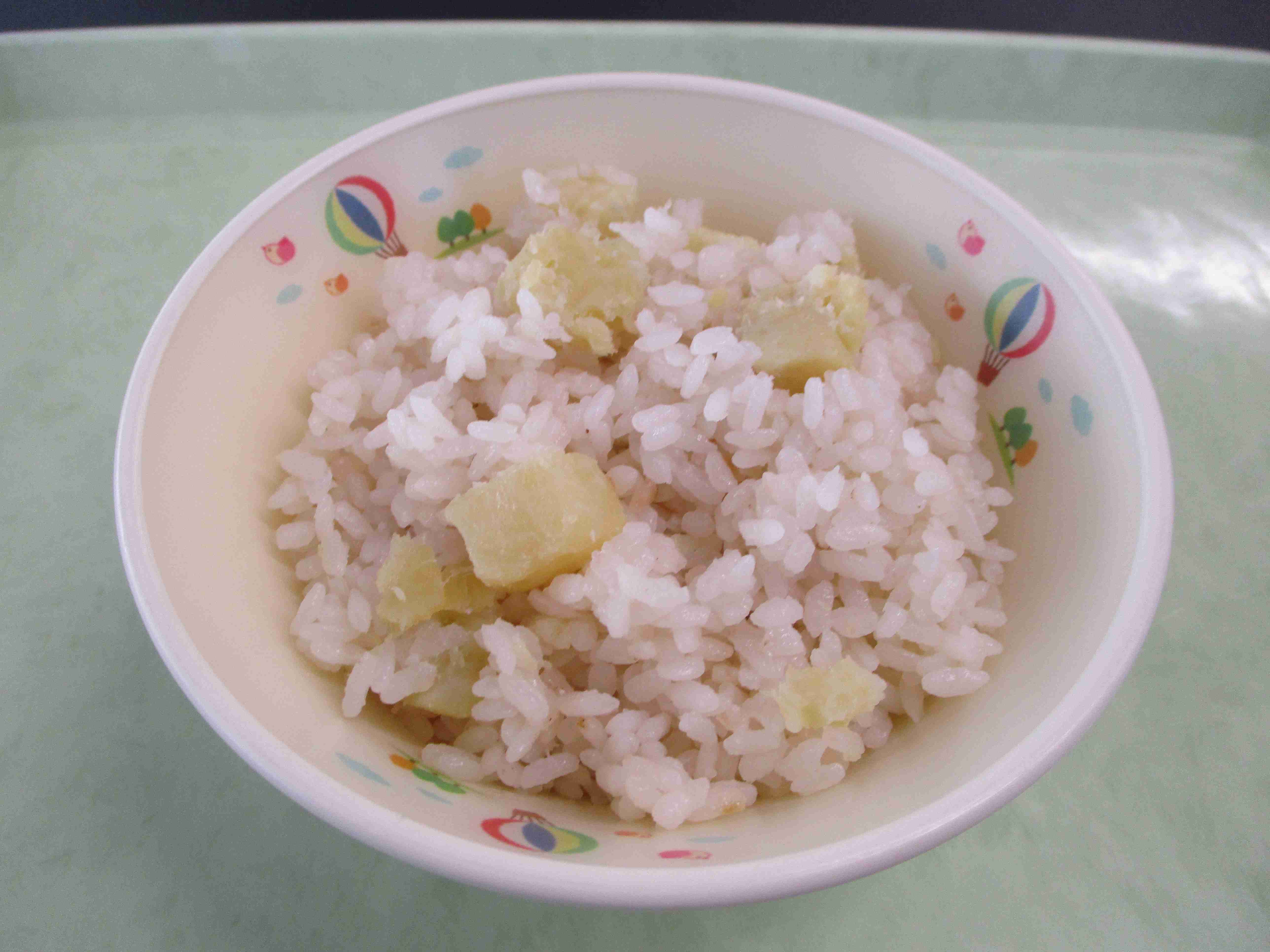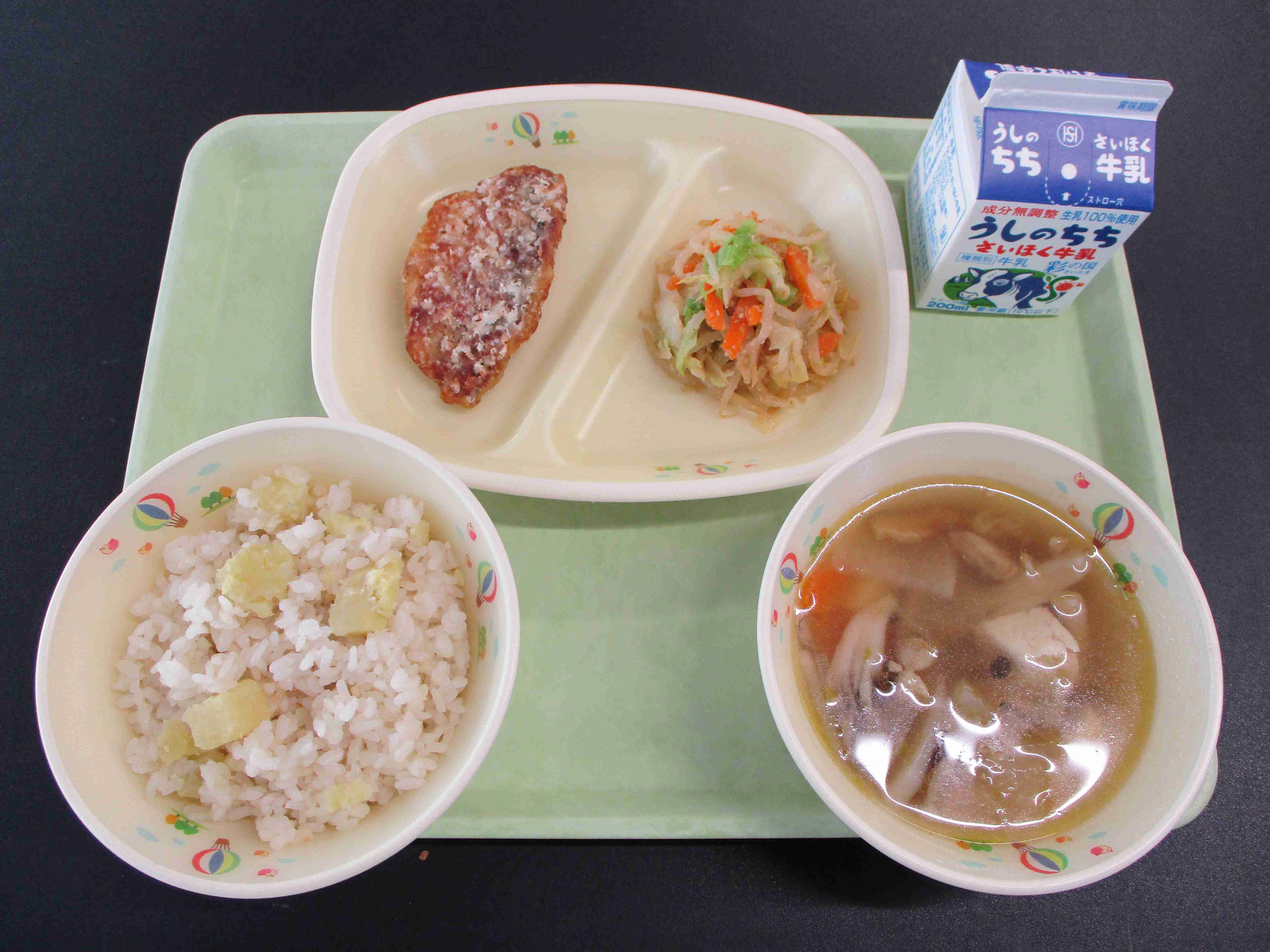 さつまいもごはん 牛乳 あじ竜田揚げ キャベツのごまあえ きのこ汁