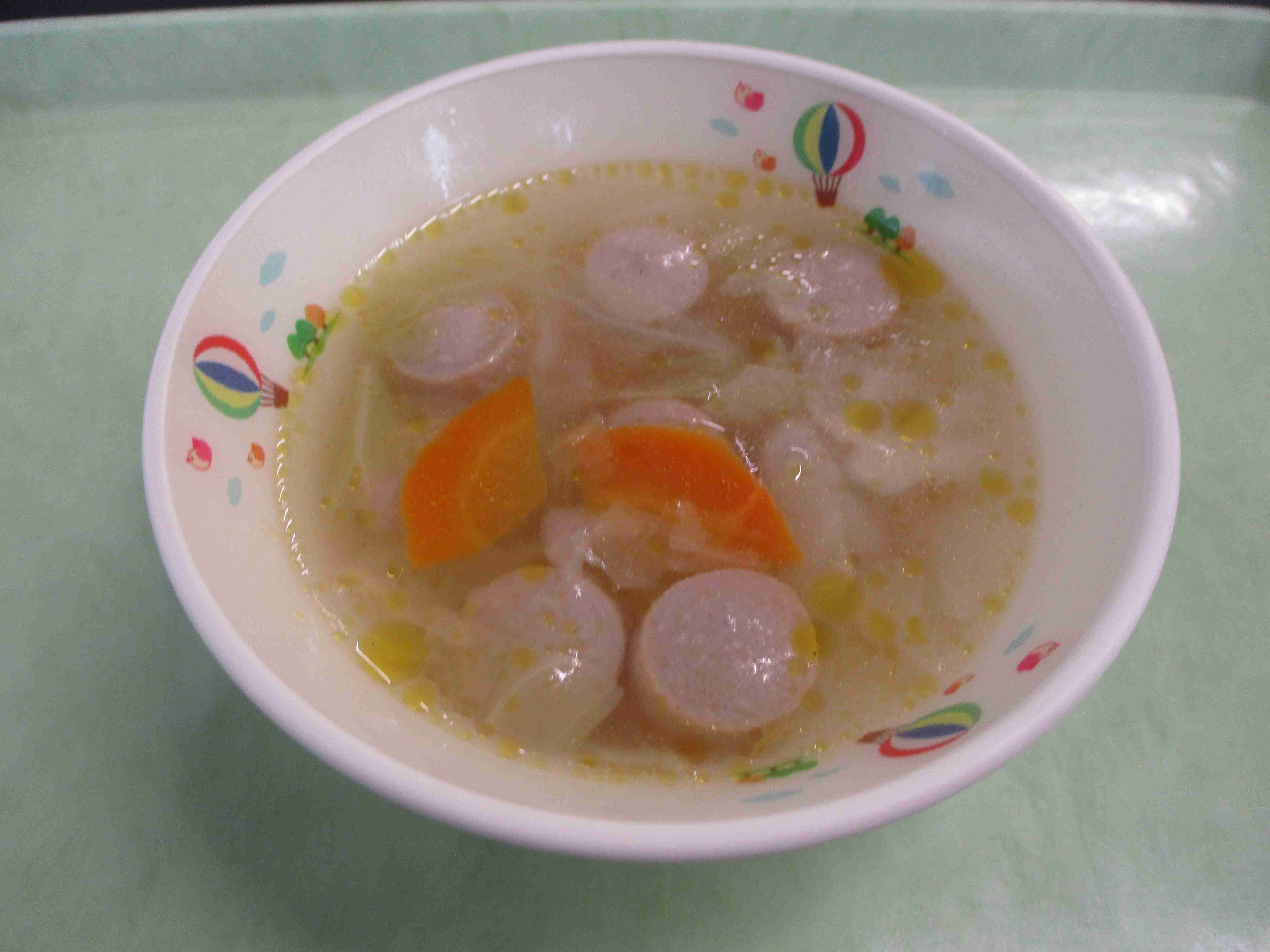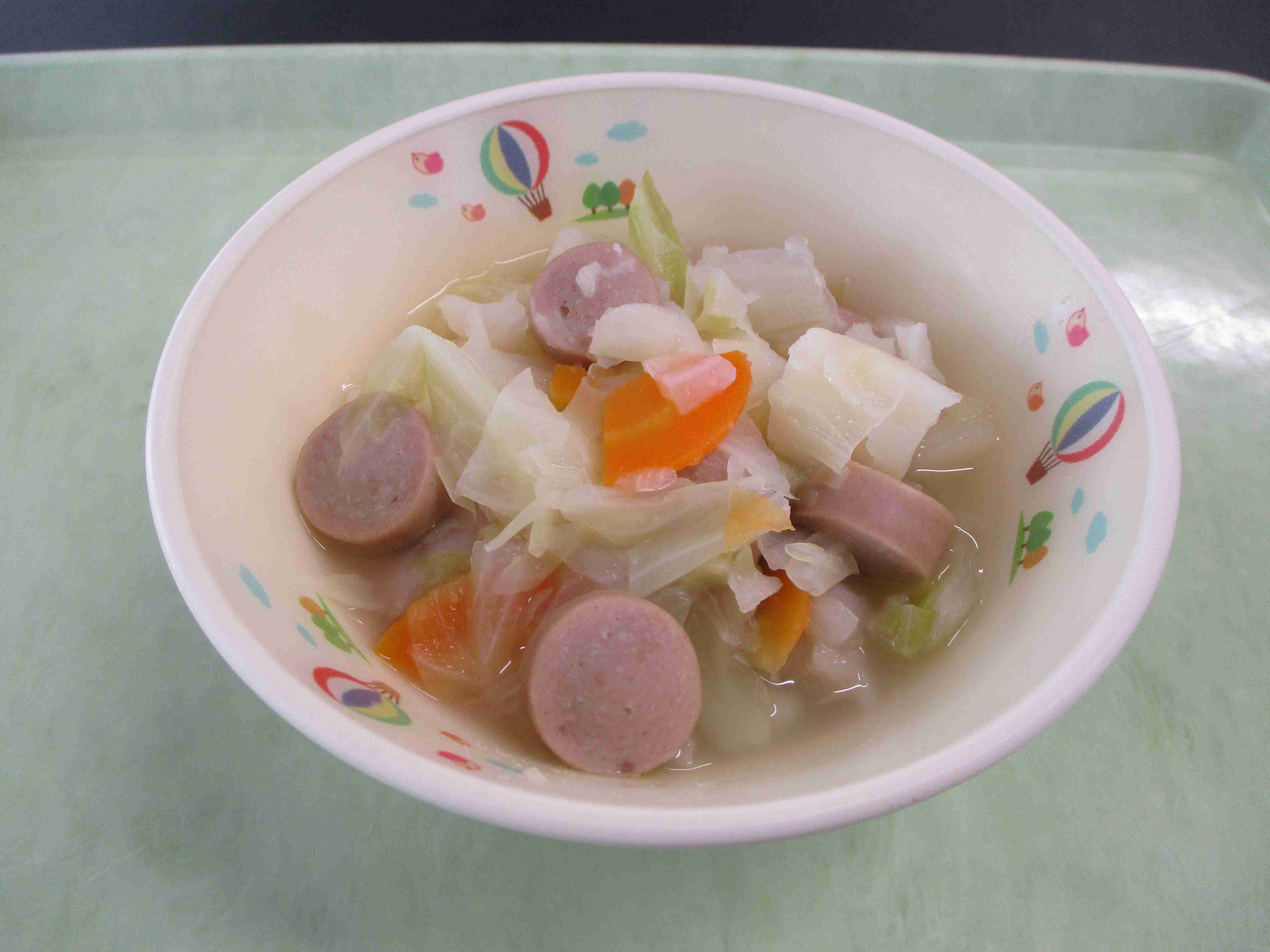 今日はポトフのお話です。ポトフは肉や野菜をじっくり煮込んだフランスの家庭料理です。フランス語で「火にかけた鍋」という意味があります。今日のポトフはフランクフルト、にんじん、玉ねぎ、じゃがいも、キャベツを煮込みました。フランクフルトの旨味や野菜の甘みと栄養がスープにたくさん溶けているので、スープも残さず飲んでくださいね。