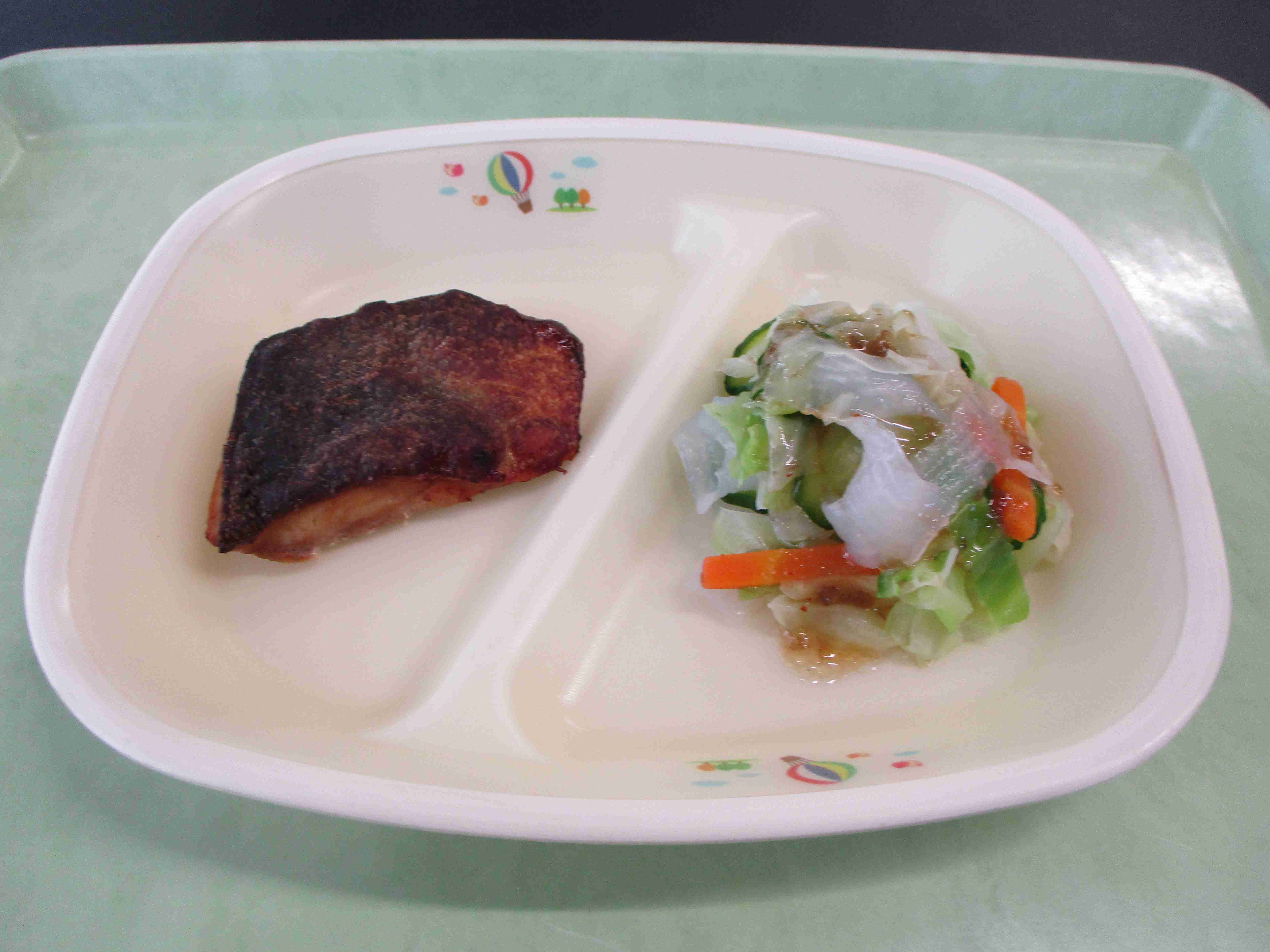 今日は鱈のお話です。鱈は、身が雪のように白いことから漢字で魚へんに雪と書く魚です。たんぱく質を多く含み脂肪が少ない魚で、鍋物や照焼き、ムニエルやフライ、かまぼこやすり身の原料などになります。今日は、角切りにして、しょうゆとみりんで下味をつけ片栗粉をまぶして油で揚げてからソースをかけました。味わって食べてください。