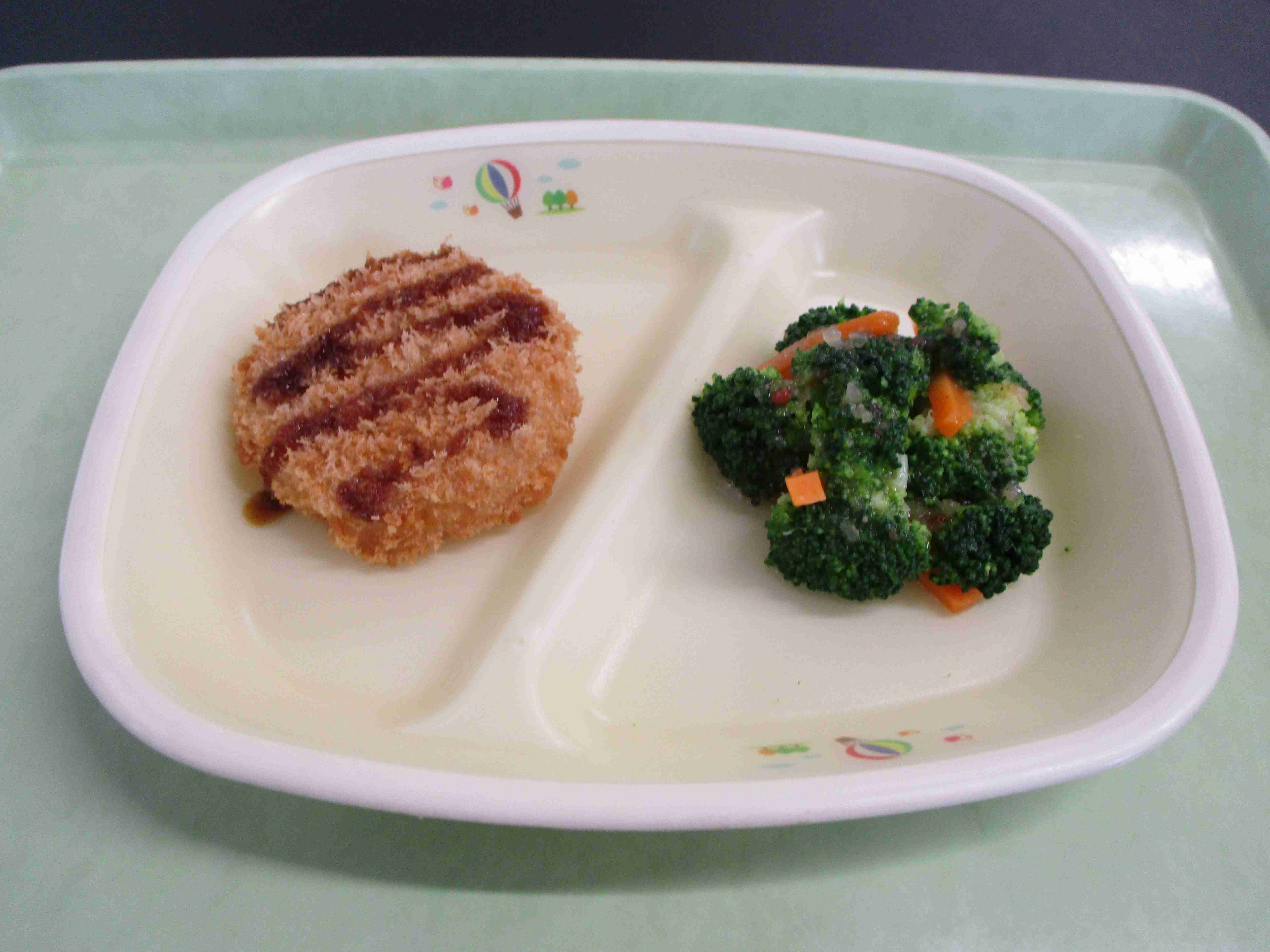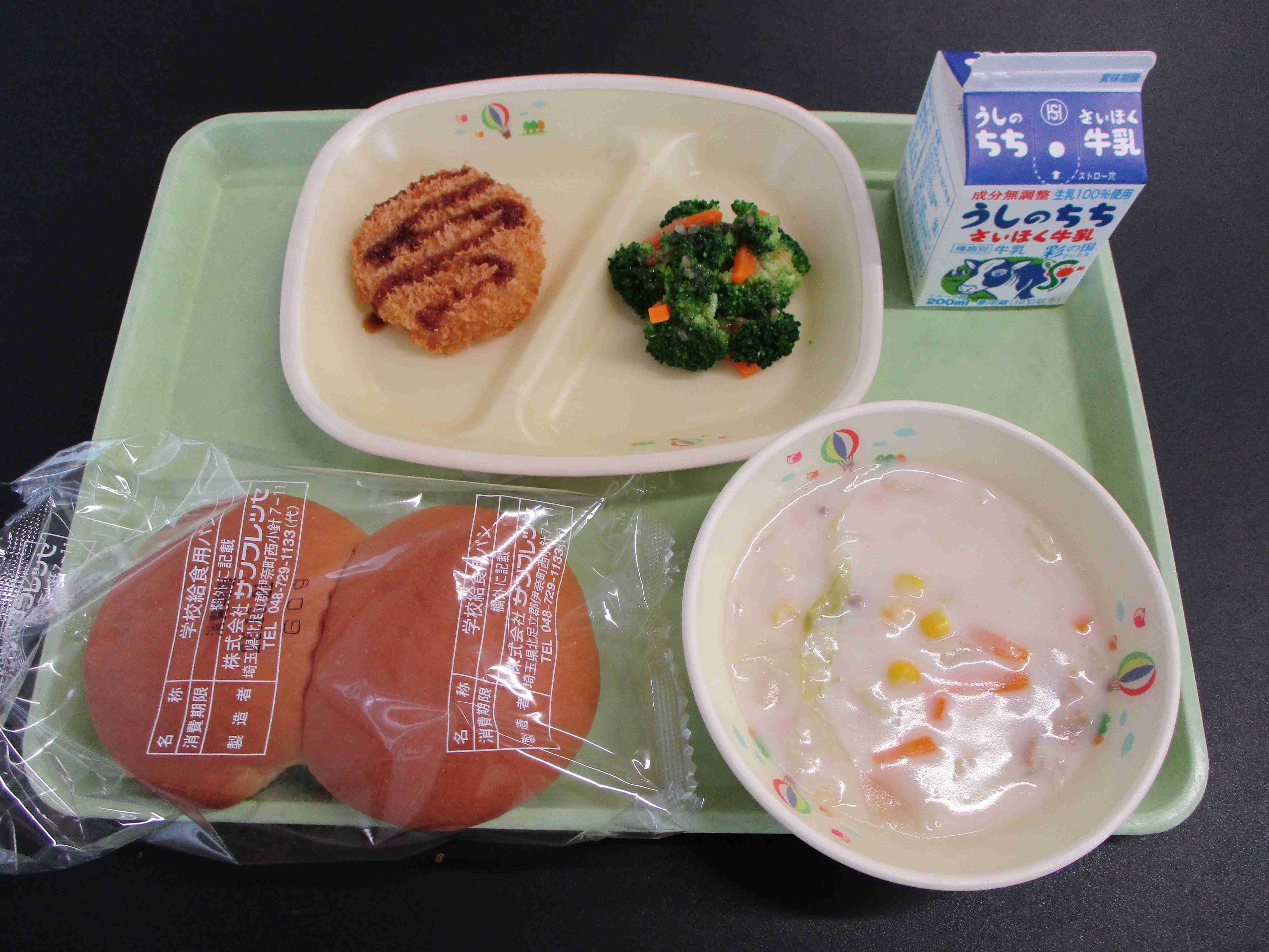 はちみつパン 牛乳 コロッケ ブロッコリーのサラダ キャベツのクリームスープ