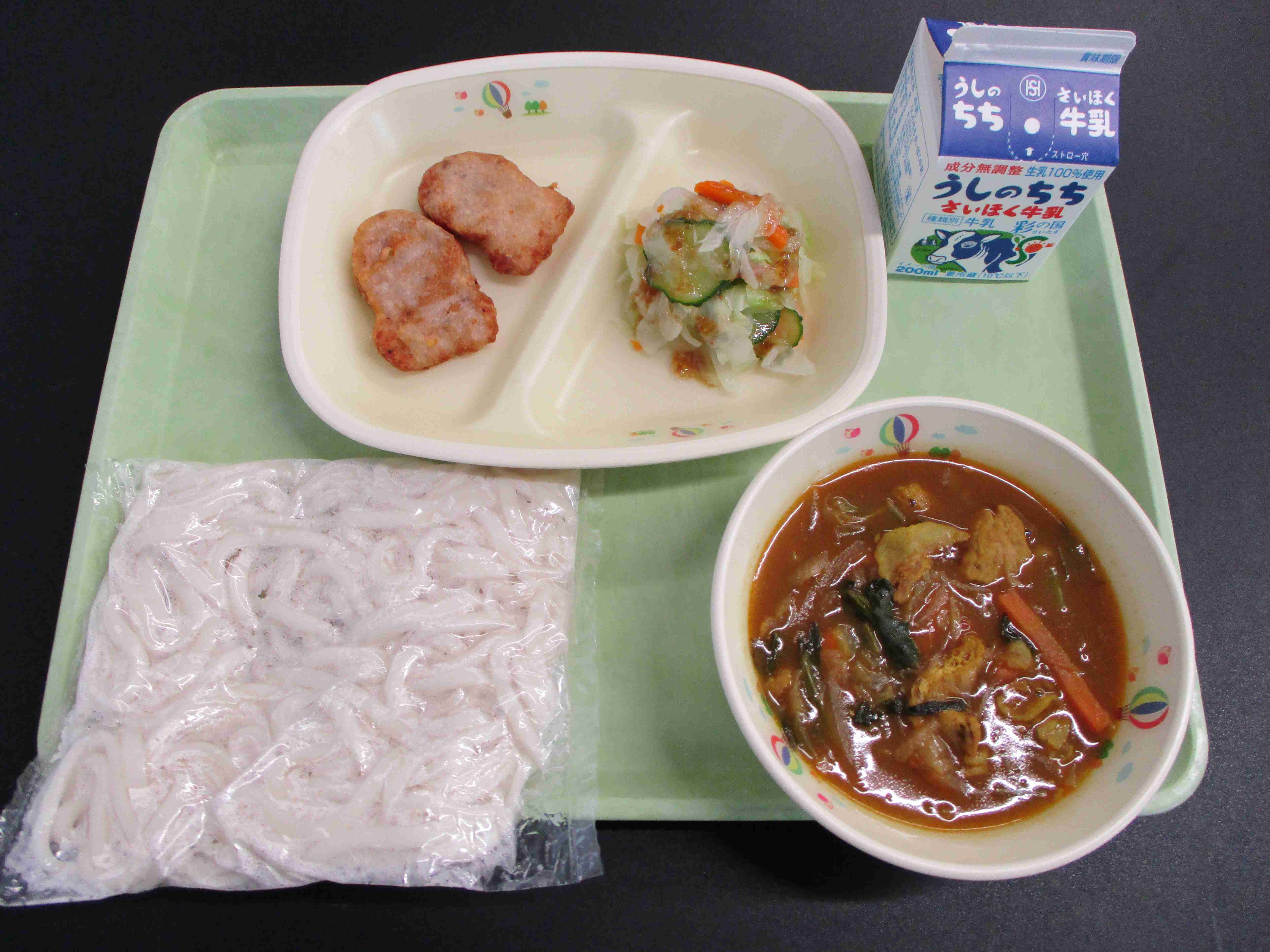 カレーうどん 牛乳 たこナゲット たまねぎのサラダ