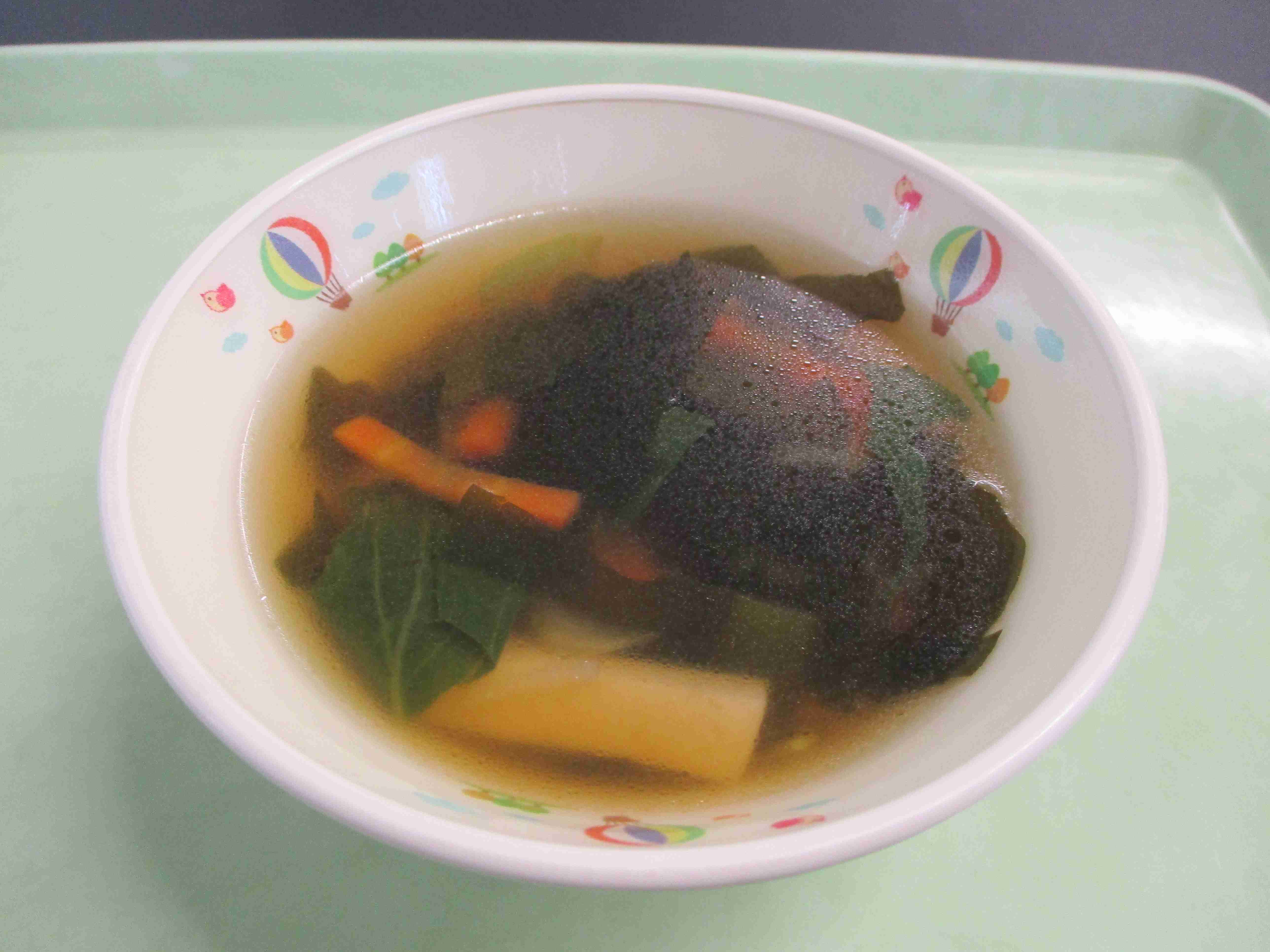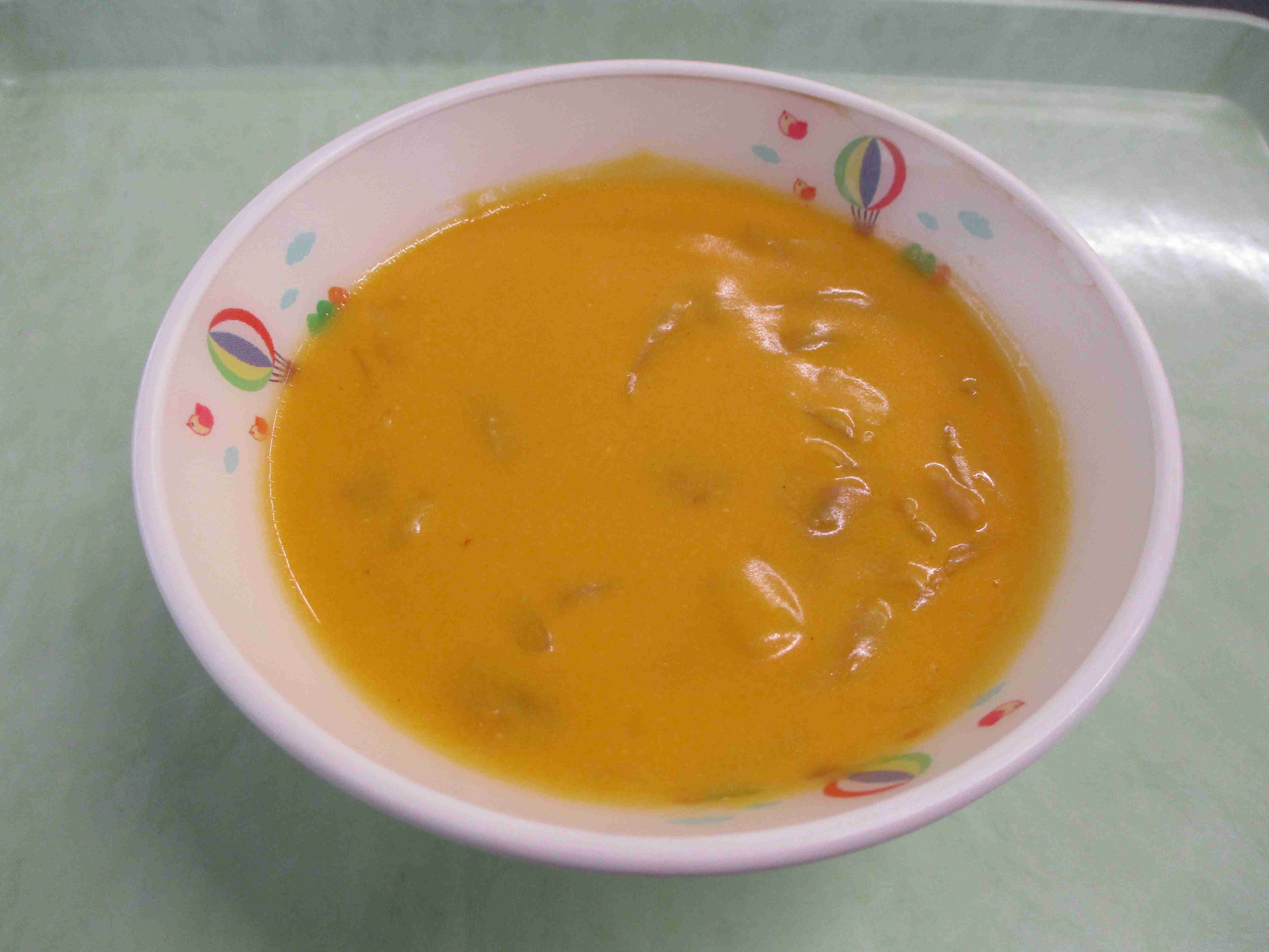 今日はかぼちゃのお話です。みなさんがよく見かけるかぼちゃは西洋かぼちゃで、こいオレンジ色の果肉を持ちほくほくとした食感と甘味のあるのが特徴です。煮物や天ぷら、サラダ、ポタージュなどさまざまな料理に使われるほか甘味を生かしてスイーツにも利用されます。ベータカロテンをはじめ、ビタミンEやC、各種ミネラルを豊富に含み、まさに健康に役立つ食べ物です。今日はスープにしました。たくさん食べてくださいね。