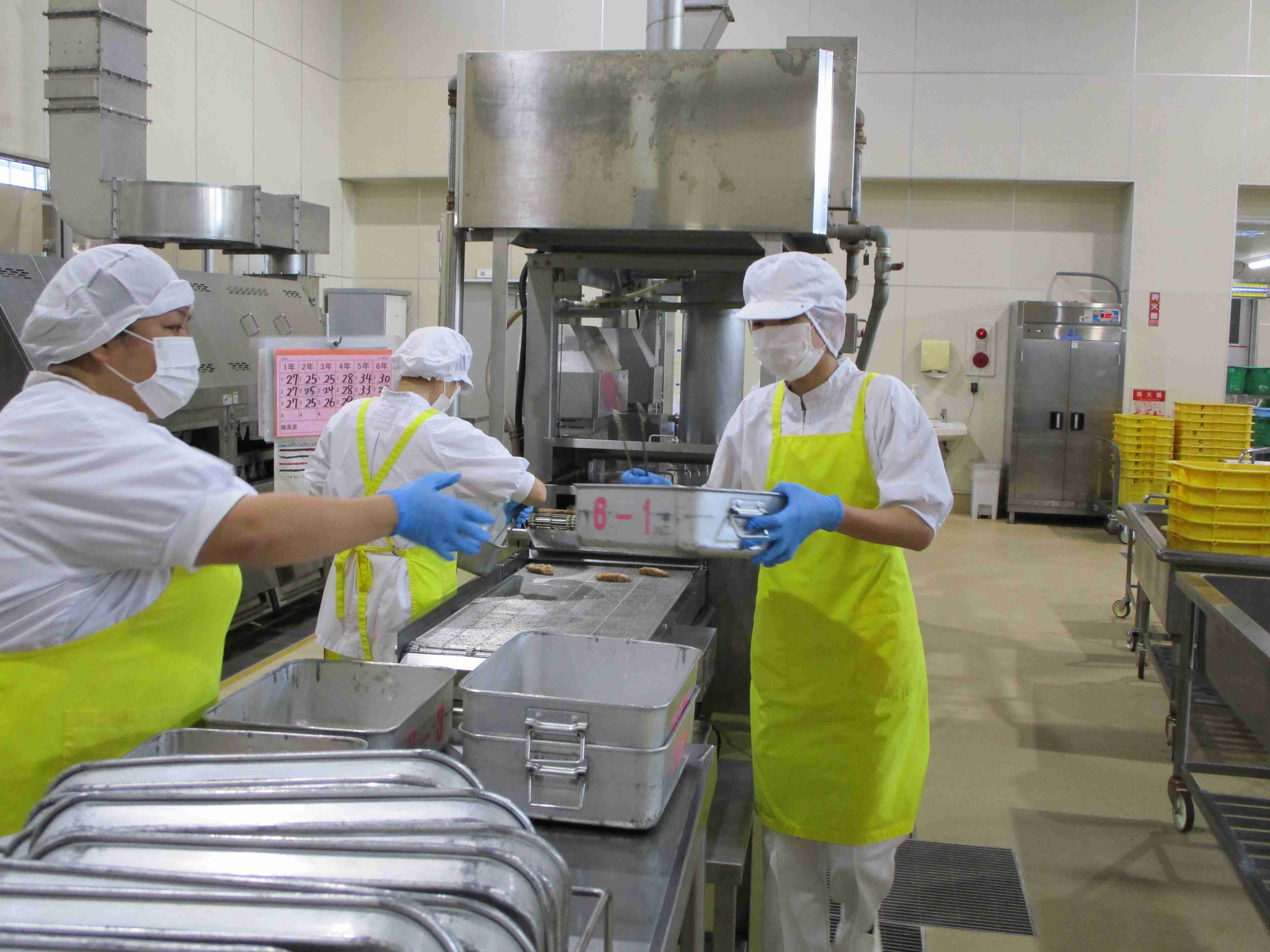 できあがったさつまいもごはんを、保温できる容器に分けています。