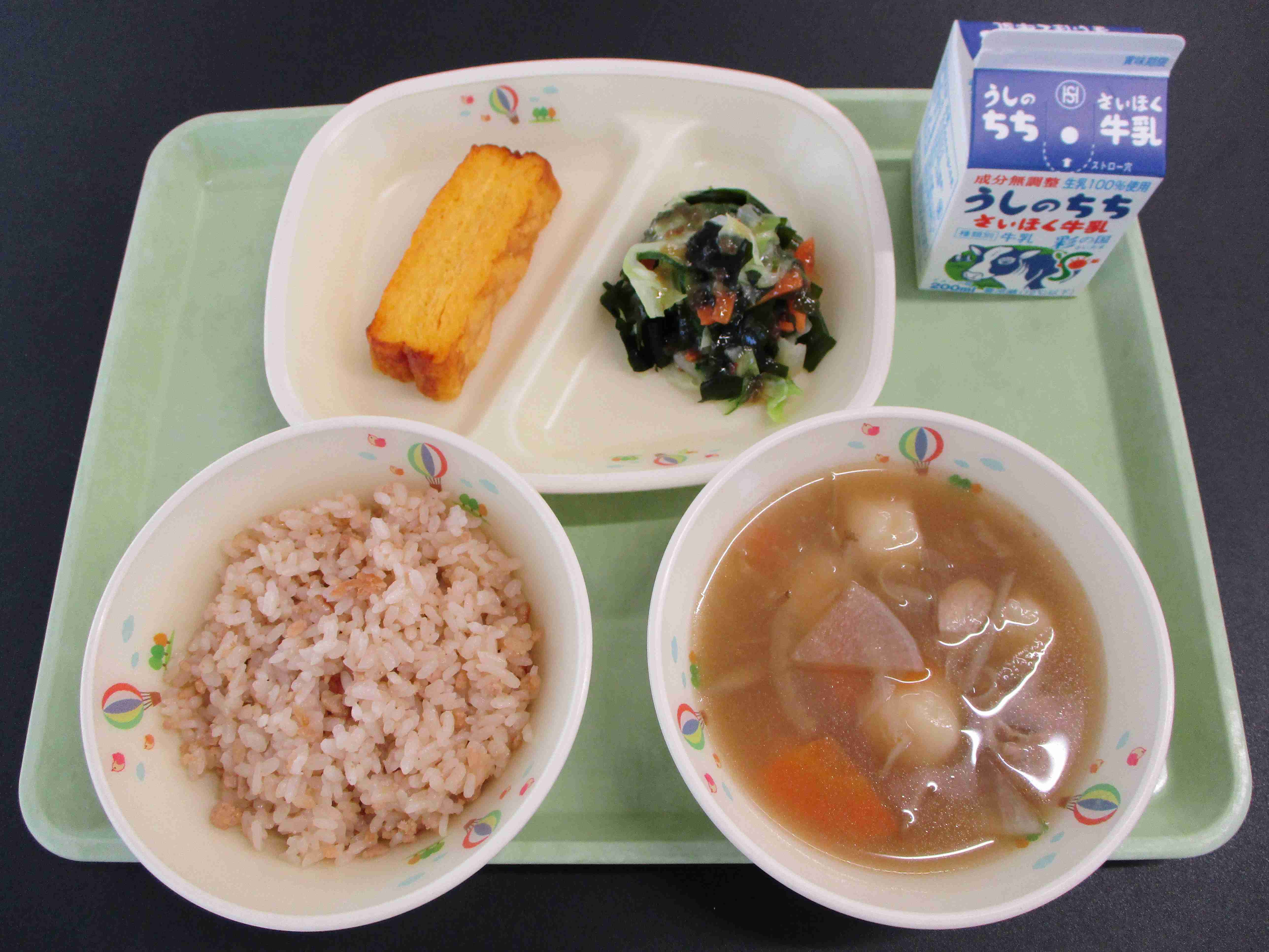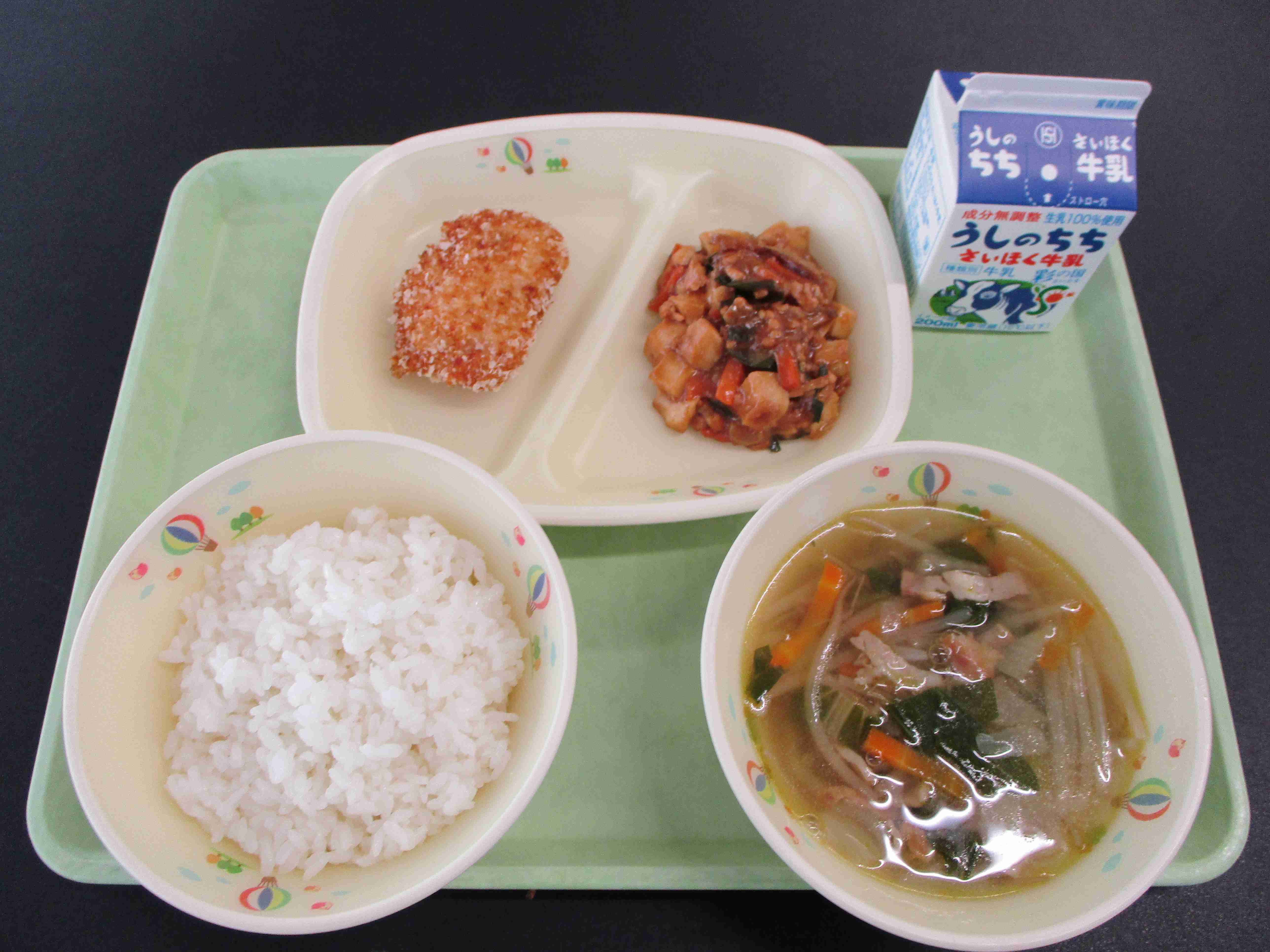 10月10日は目の愛護デーです。皆さんは“目”を大切にしていますか?スマトフォンやゲーム機など、何かと目を使う機会が多い現代です。そこで今日の給食は目の愛護デーにちなんだ献立です。にんじんやトマト、ブロッコリーなどの緑黄色野菜には、目の健康にかかせないビタミンAが覆う含まれれています。今日は、目の健康を意識して過ごしてみましょう。