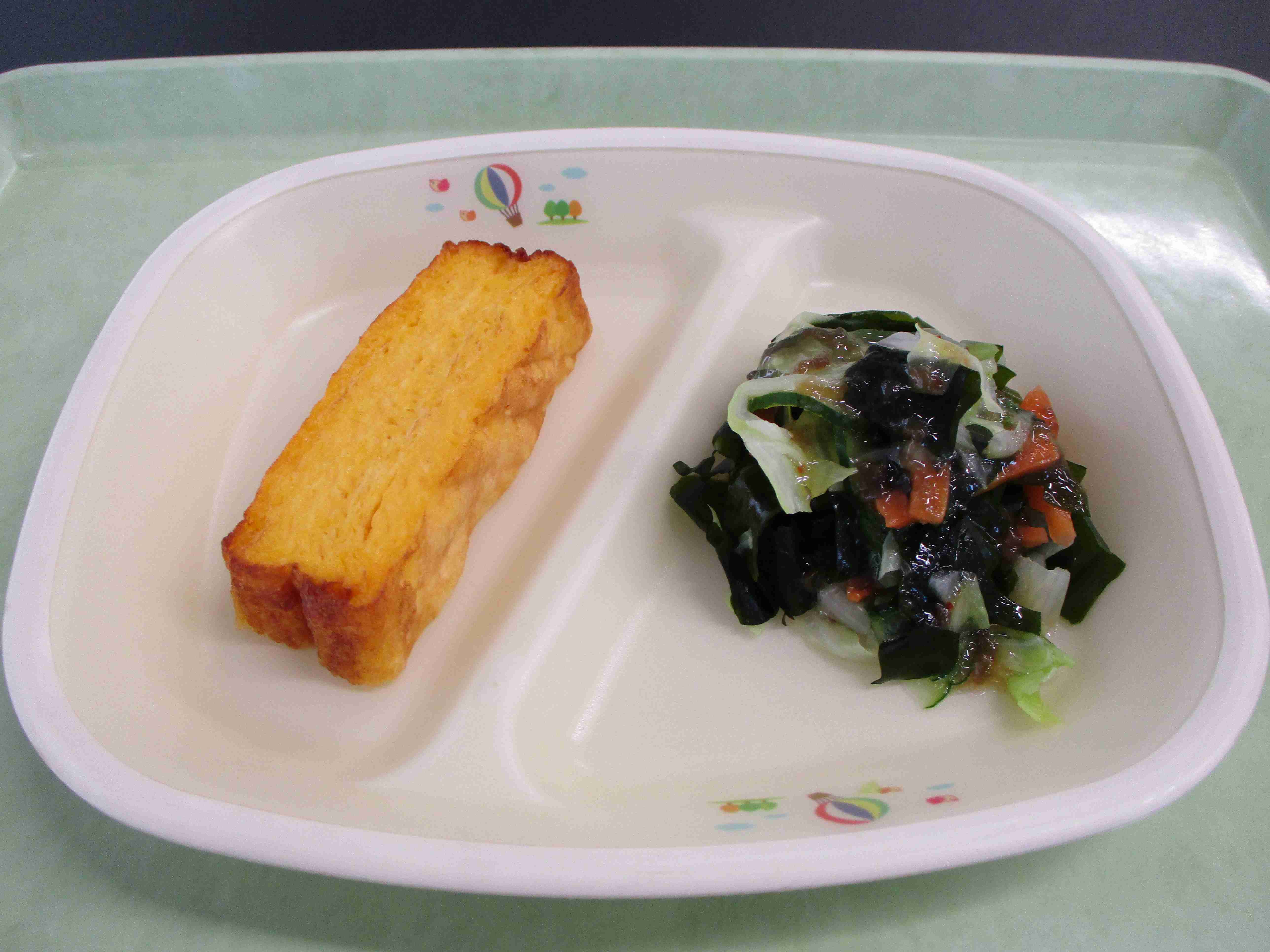 今日はたまごのお話です。卵は給食でもいろいろな料理に登場します。卵は平安時代の頃には食べていた記録があり、室町時代にお菓子の材料としても使われるようになり、江戸時代になると日常的に食べられていたそうです。卵は優れたたんぱく質を含んでいます。卵白はほとんどがたんぱく質ですが、卵黄は、たんぱく質以外に脂質やビタミン、鉄などっも含まれています。いろいろな料理に使われていますが、お菓子やパン作り、マヨネーズなどにも欠かせない材料となっています。今日は、厚焼きたまごです。残さず食べましょう。