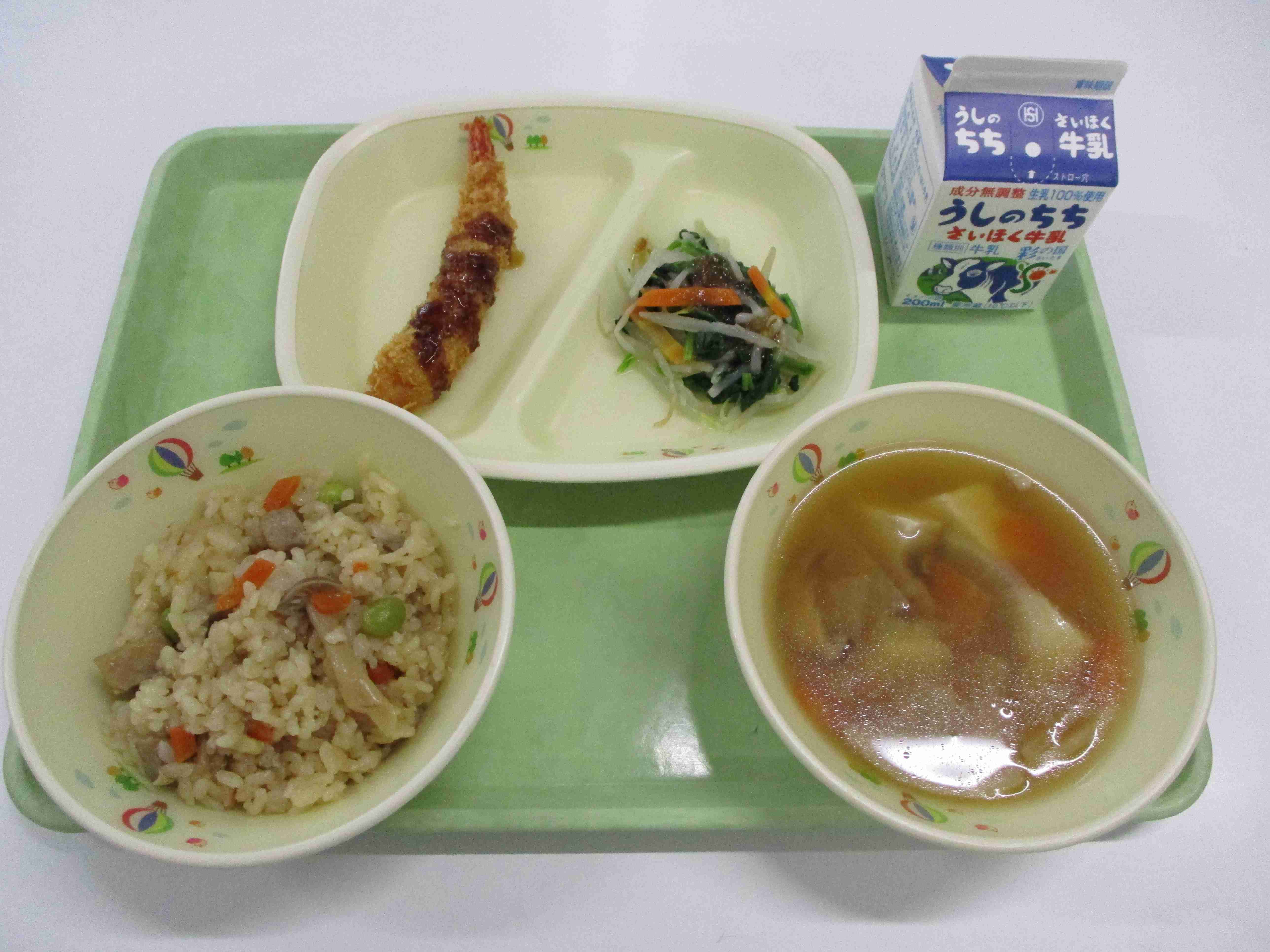 五目ごはん 牛乳 えびフライ ほうれんそうのサラダ のっぺい汁