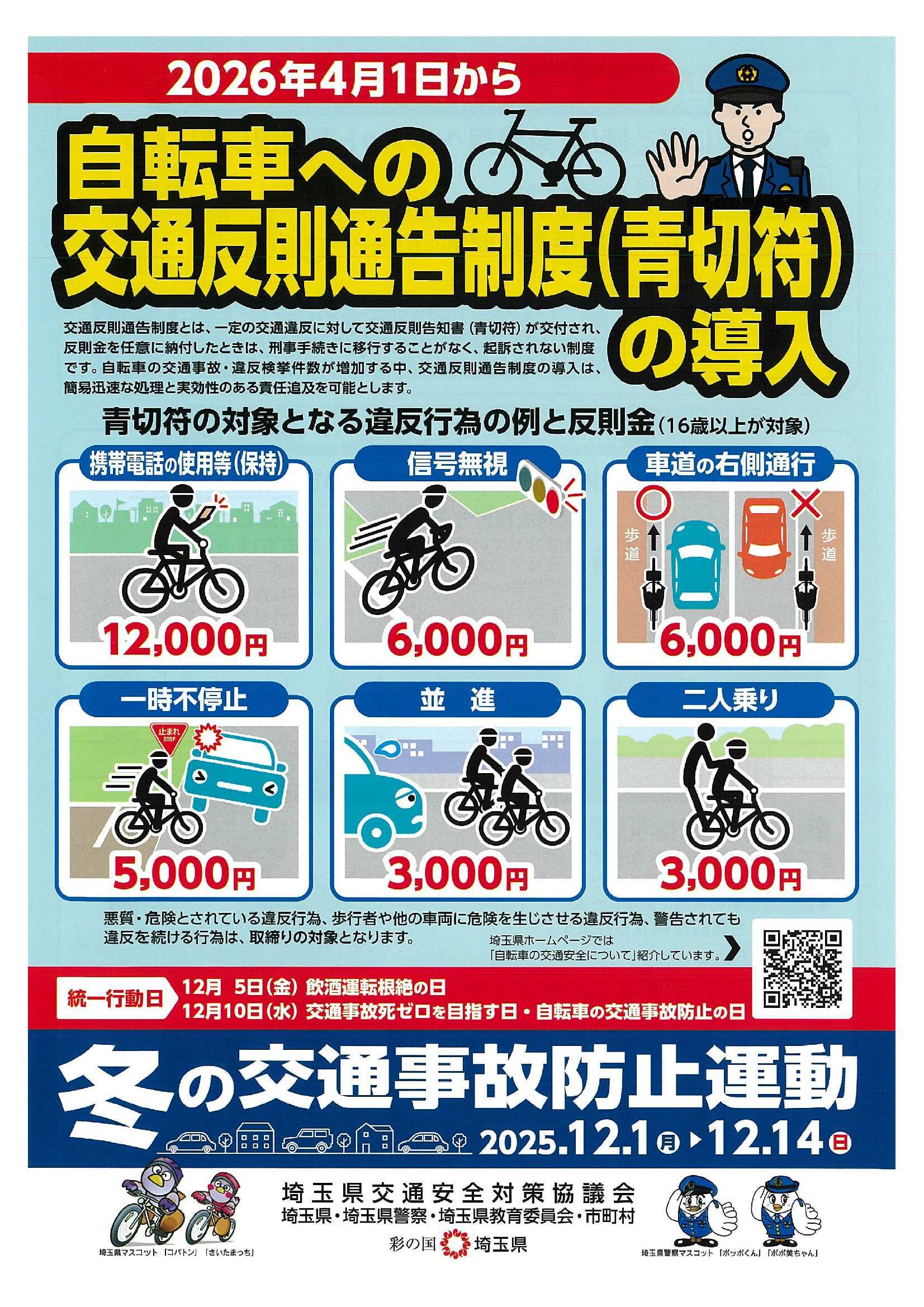 また、令和8年4月1日から道路交通法の一部改正により、自転車等に対する交通反則通告制度(青切符)が導入されます。