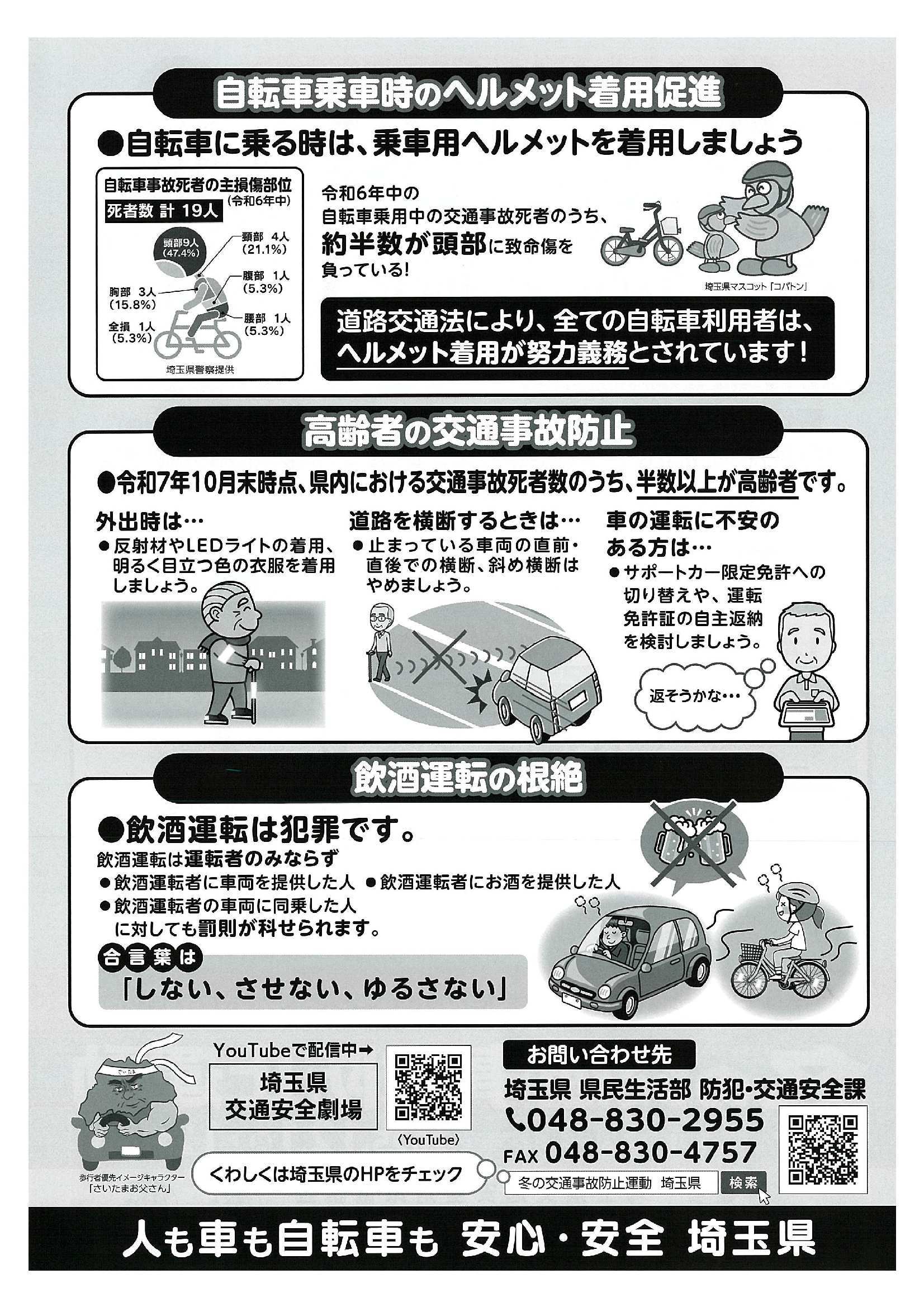このようなことから、「自転車の交通ルールの遵守(交通反則通告制度導入の周知)」「自転車乗車時のヘルメット着用促進」「高齢者の交通事故防止」「飲酒運転の根絶」を重点とし、運動を実施します。