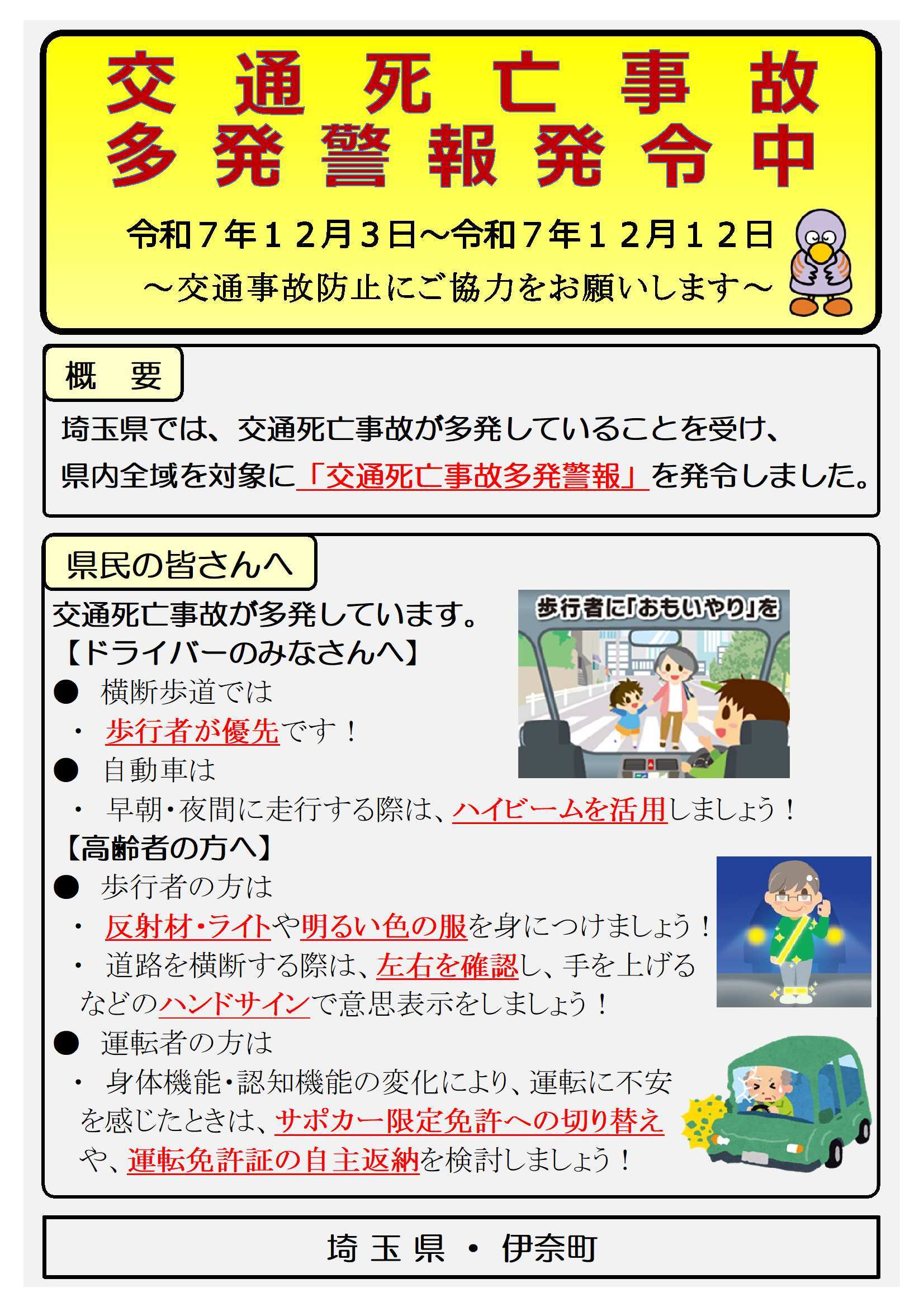 埼玉県内で2025年11月26日(水曜日)から同年12月1日(月曜日)までの6日間で9件の交通死亡事故が発生し、9名の方が亡くなりました。