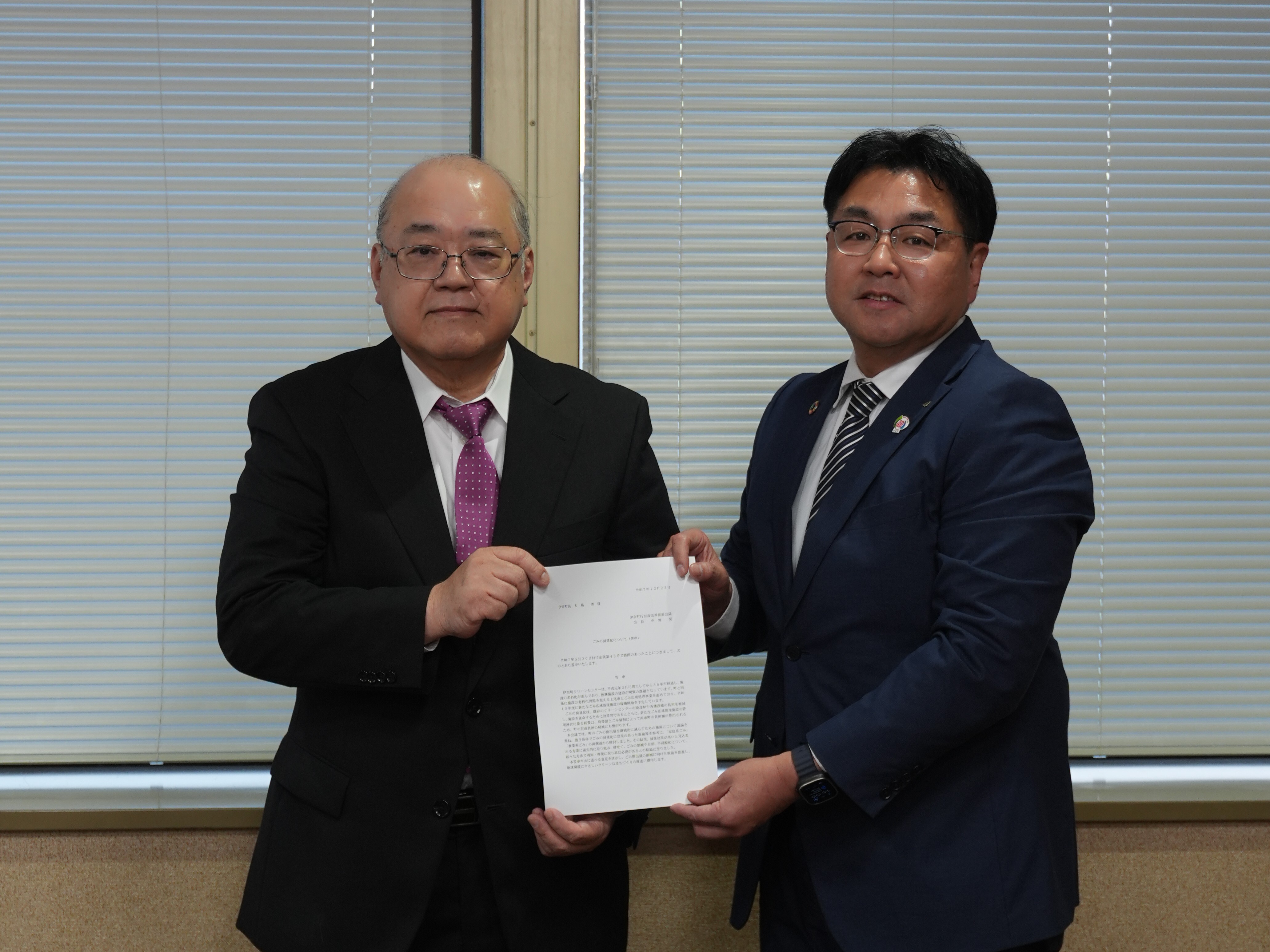 町長の諮問機関である伊奈町行財政改革推進会議(令和7年5月20日開催)にて諮問された「ごみの減量化」について、令和7年12月22日開催の同会議にて中野会長より秋葉副町長へ答申書が手渡されました。
