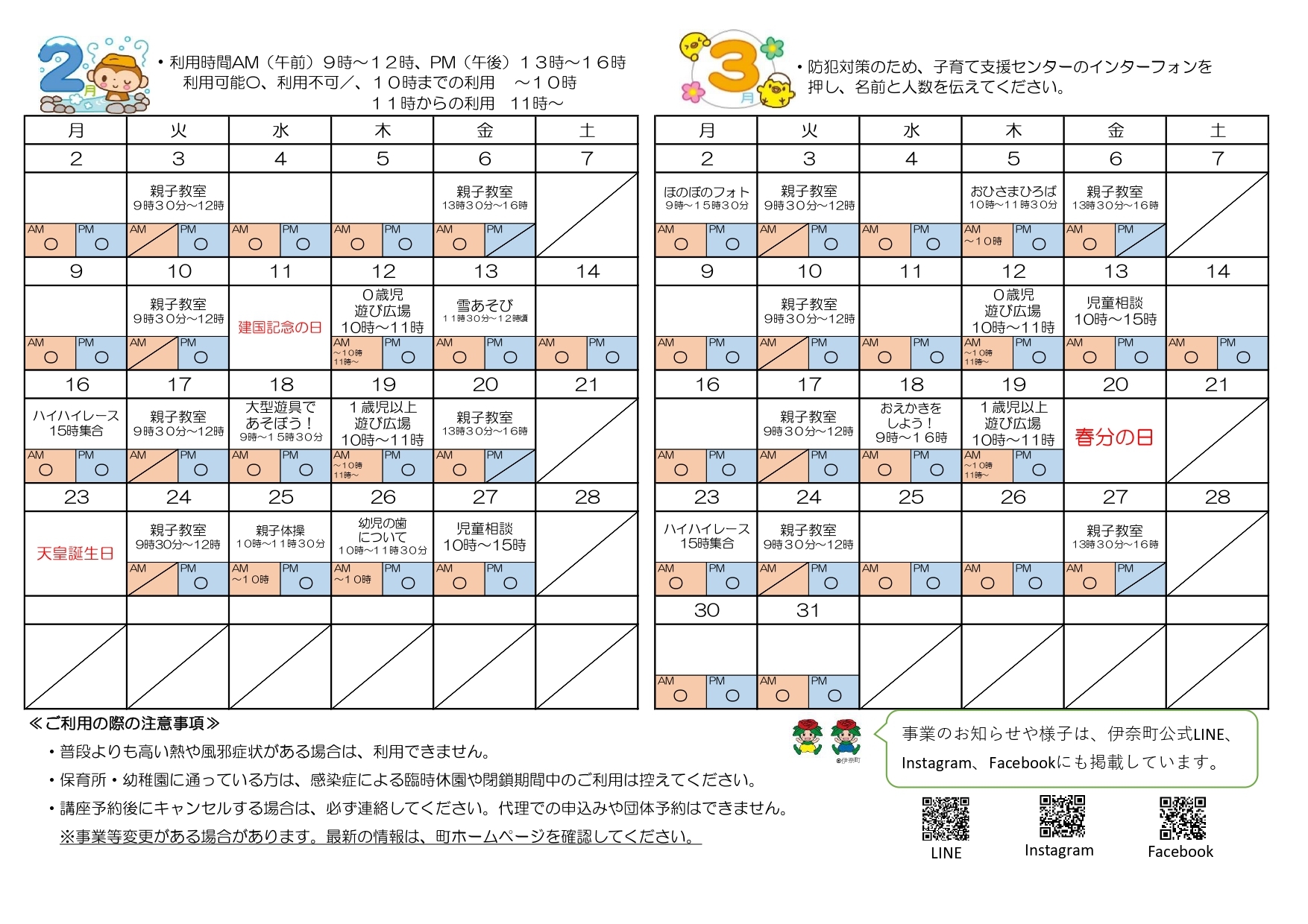 2月、3月の伊奈町子育て支援センター、つどいの広場の予定について