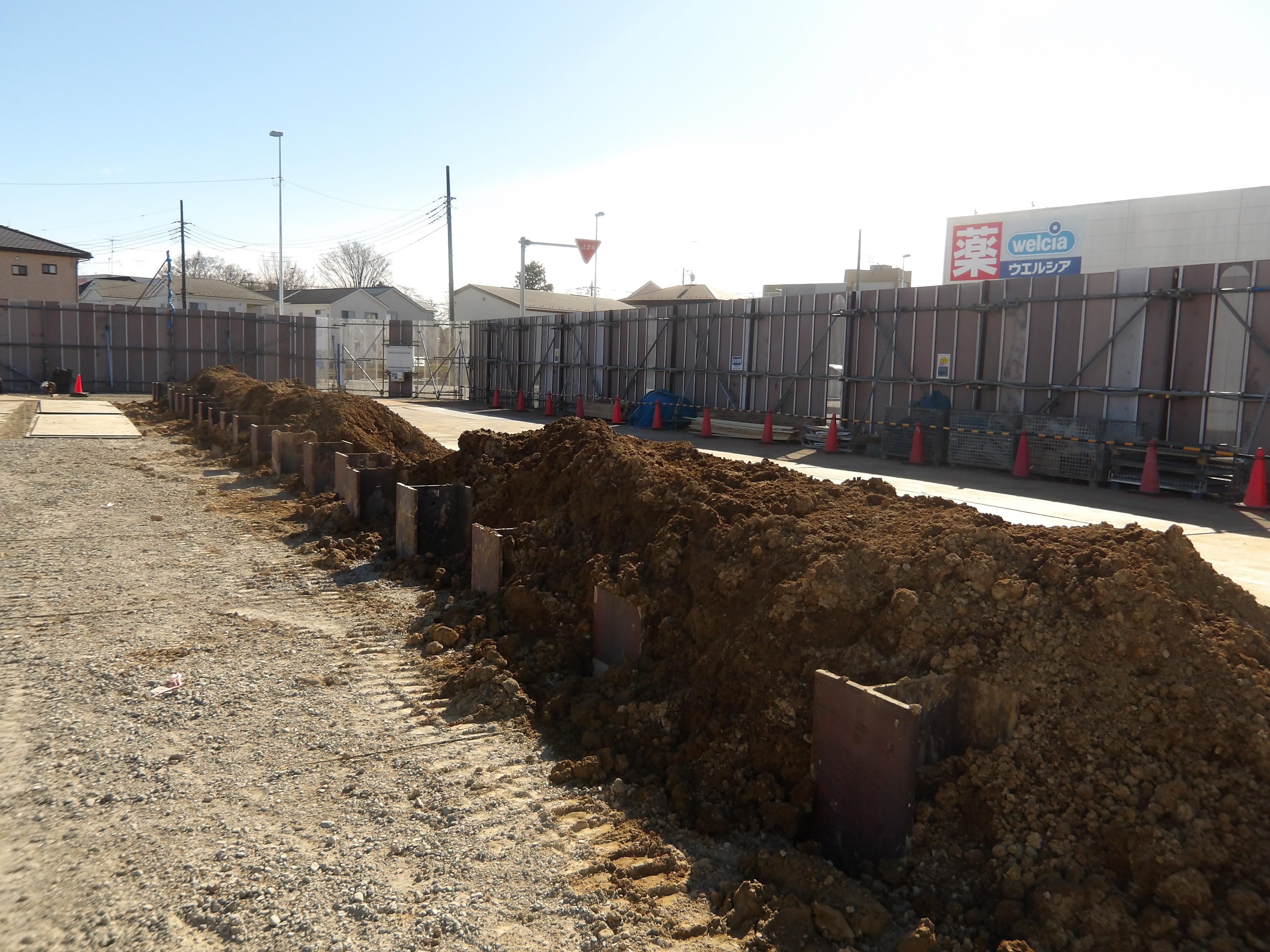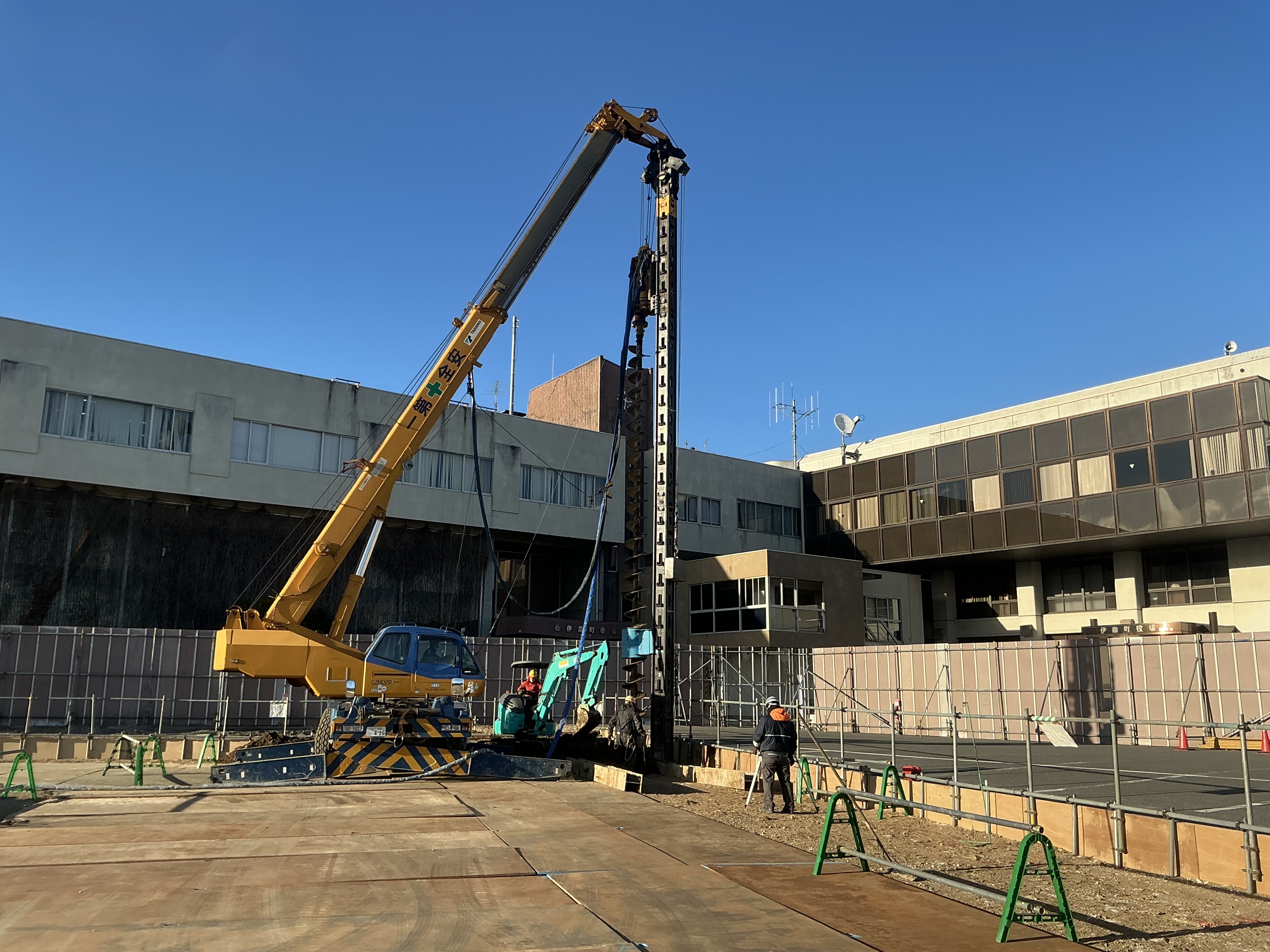 新庁舎の基礎部分の掘削工事を行うため、山留工事を行いました。引き続き、別棟の山留工事を行います。