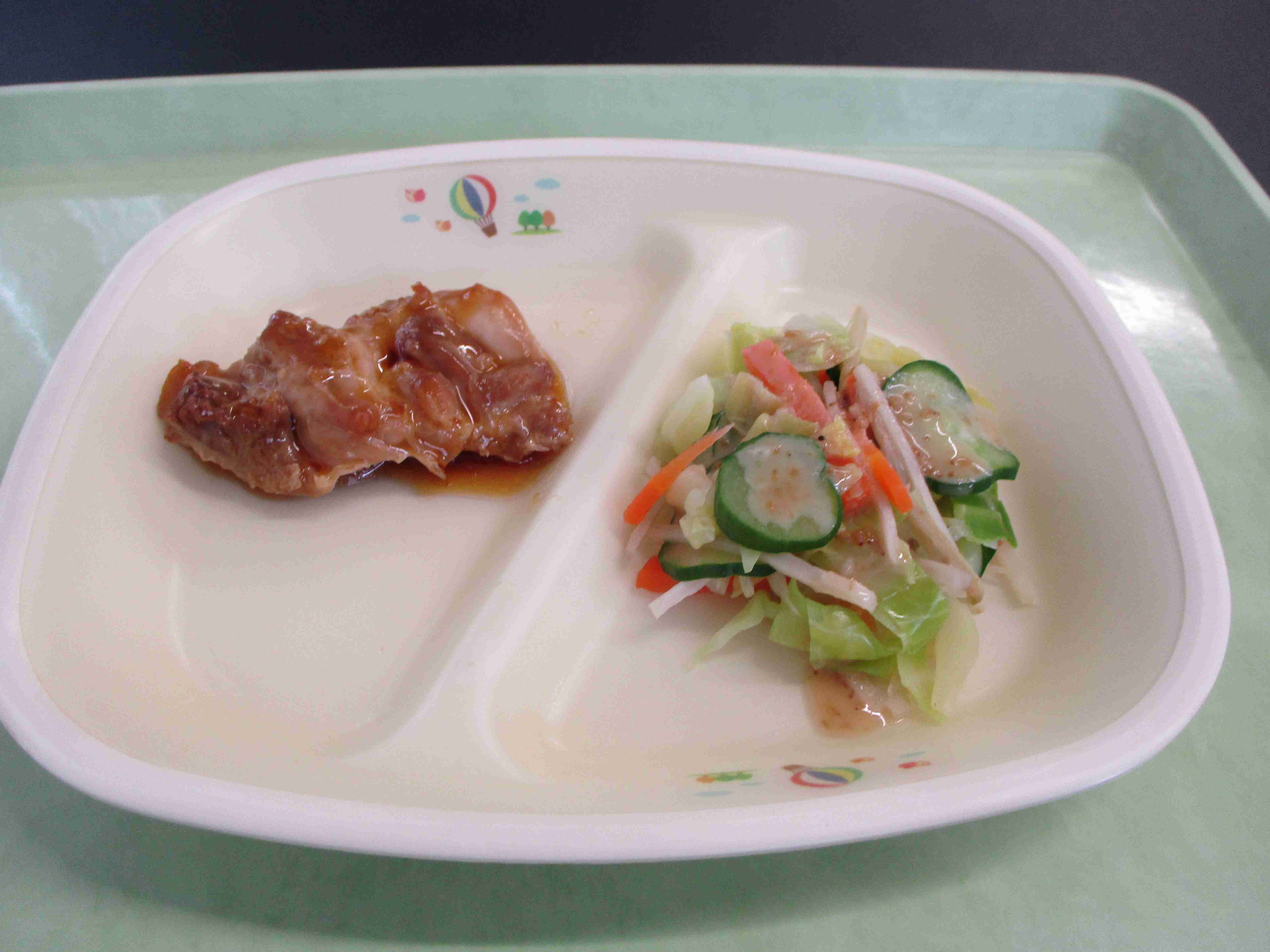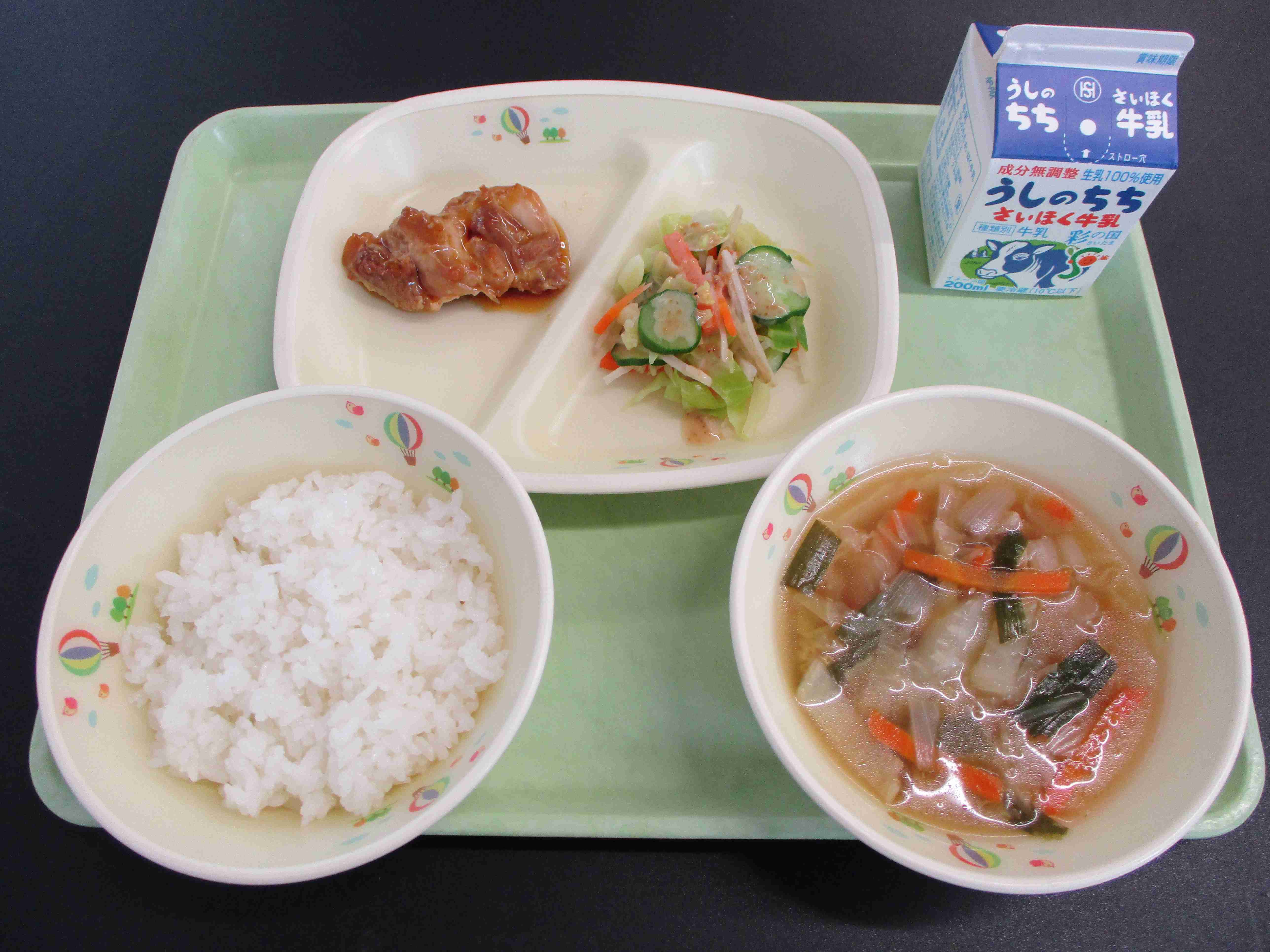 ごはん 牛乳 とり肉の照り焼き ごぼうサラダ キムチスープ